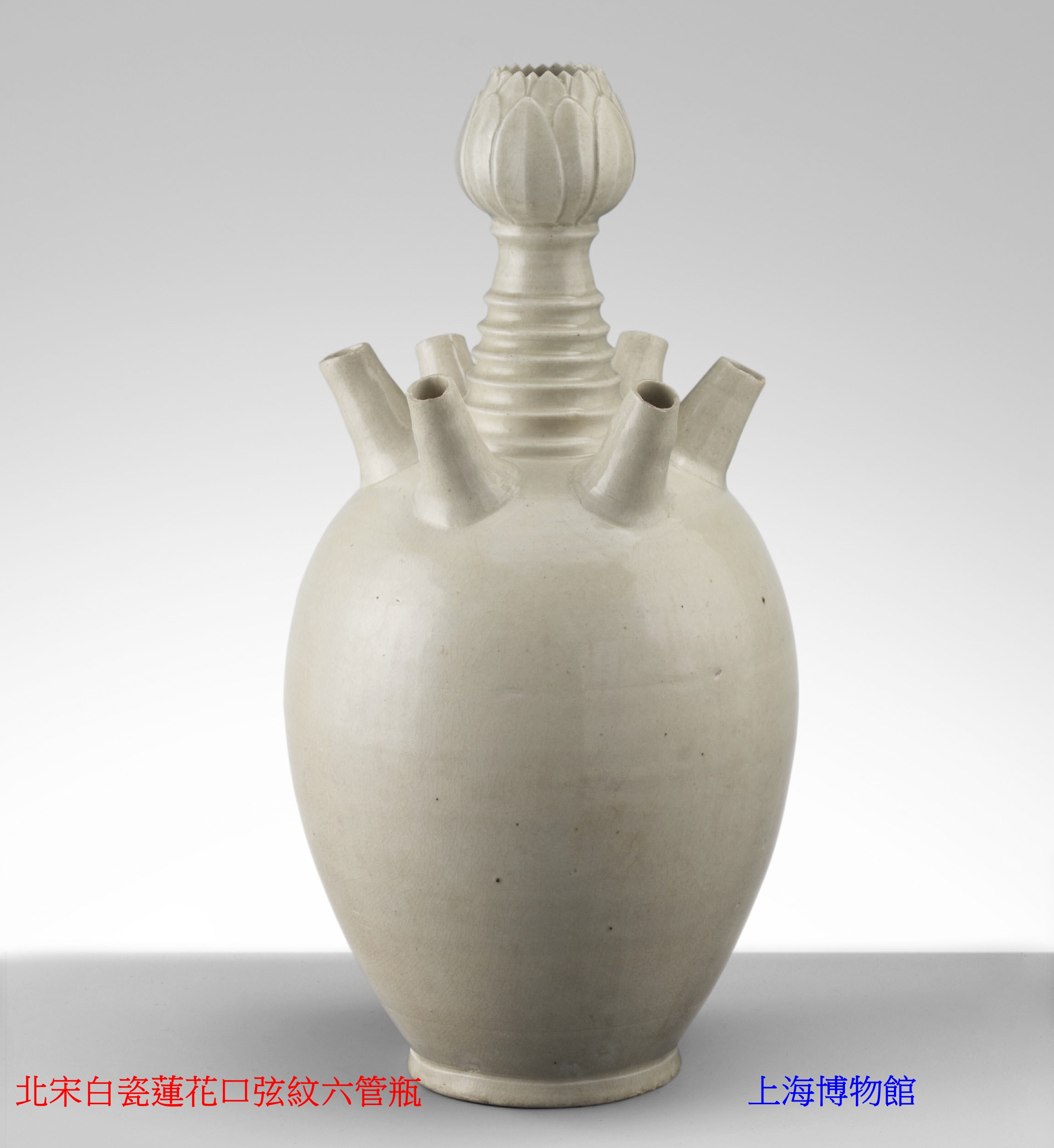 本器高33公分,腹徑約18.5公分,造型為長頸、圓腹、圈足瓶式結構,肩部外攢五根立管,上口相通,中部飾三道橫弦紋,瓶口呈蓮花瓣形,蓮蕊微隆。整體構造穩重對稱,為典型多管瓶花插形式。