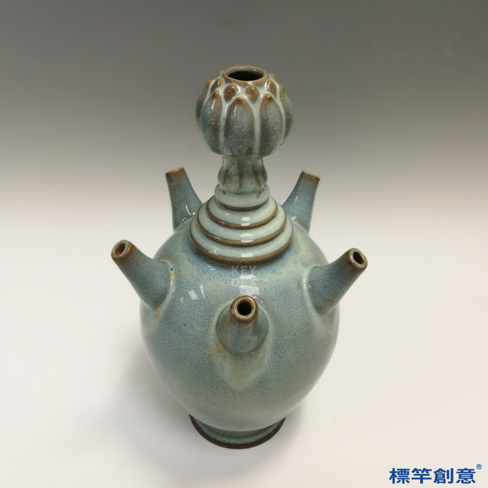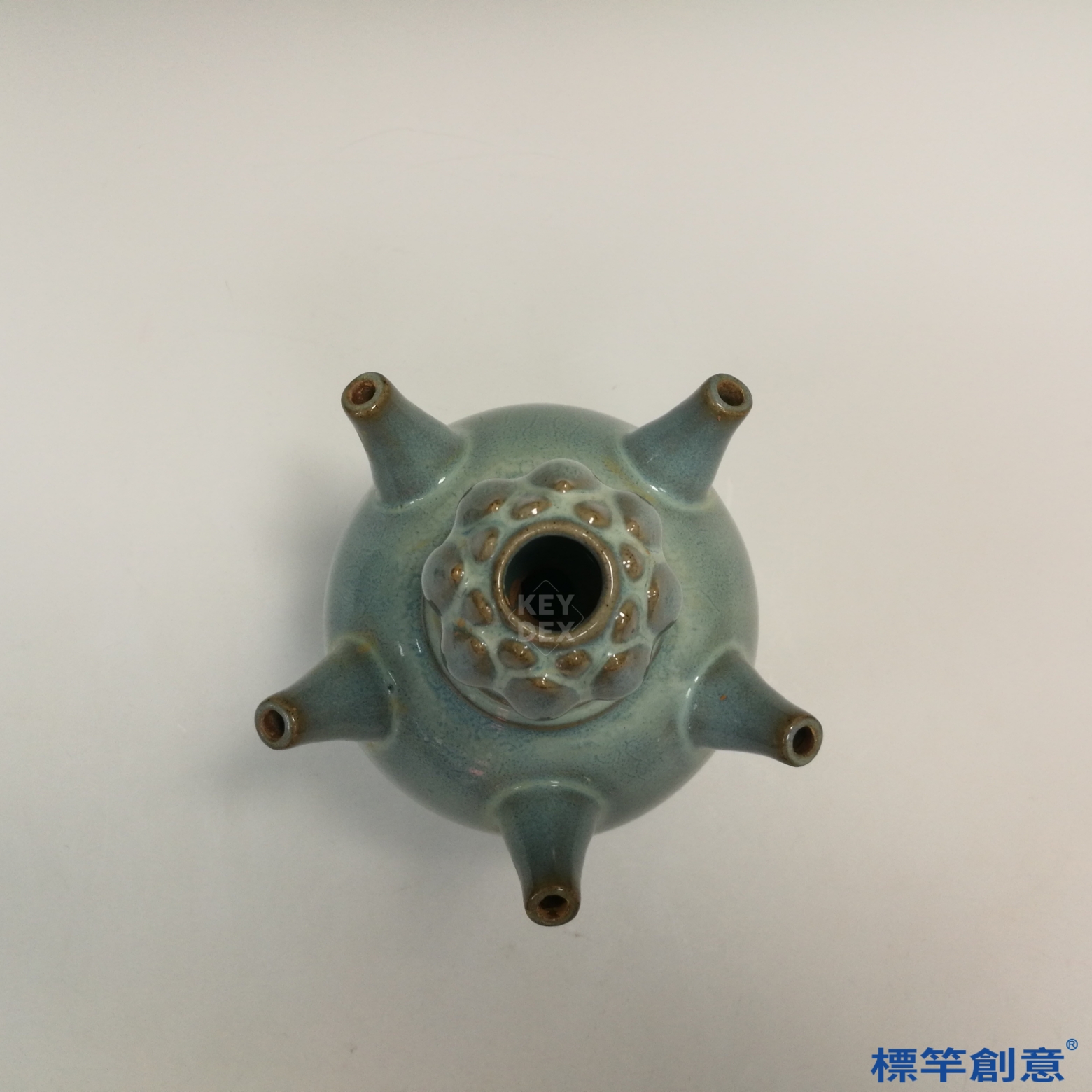 通體施天藍釉,釉層厚潤乳濁,隱見流動感,部分開片自然散布。蓮花口及五立管為貼塑模成,接合處隱見細縫。瓶身弦紋均勻,具裝飾與結構雙重功能,五管間距精準,利於插花或裝飾陳列。