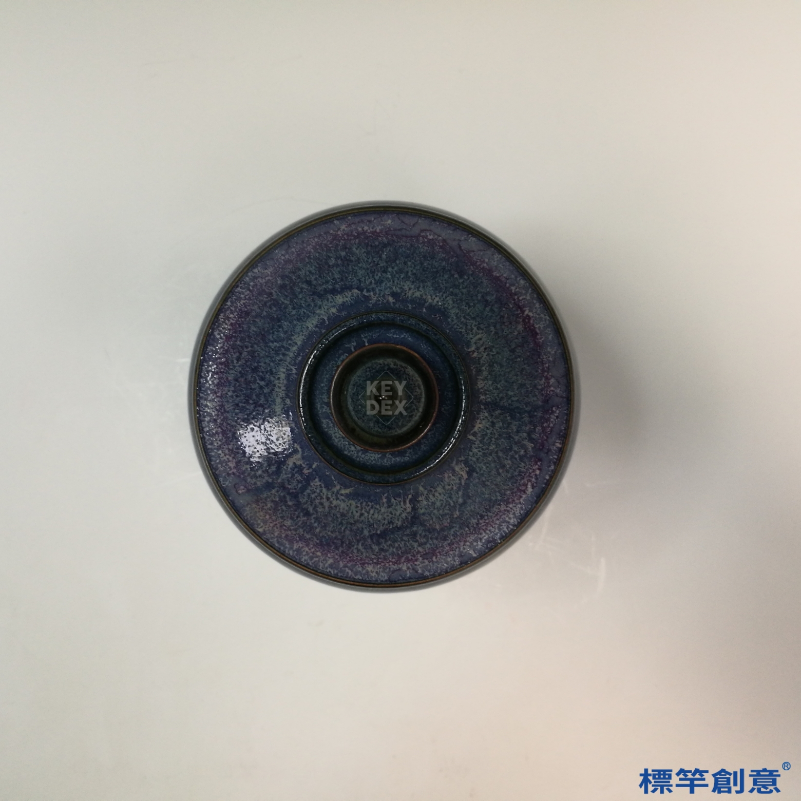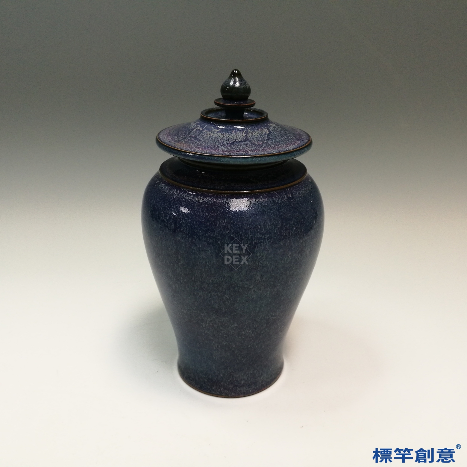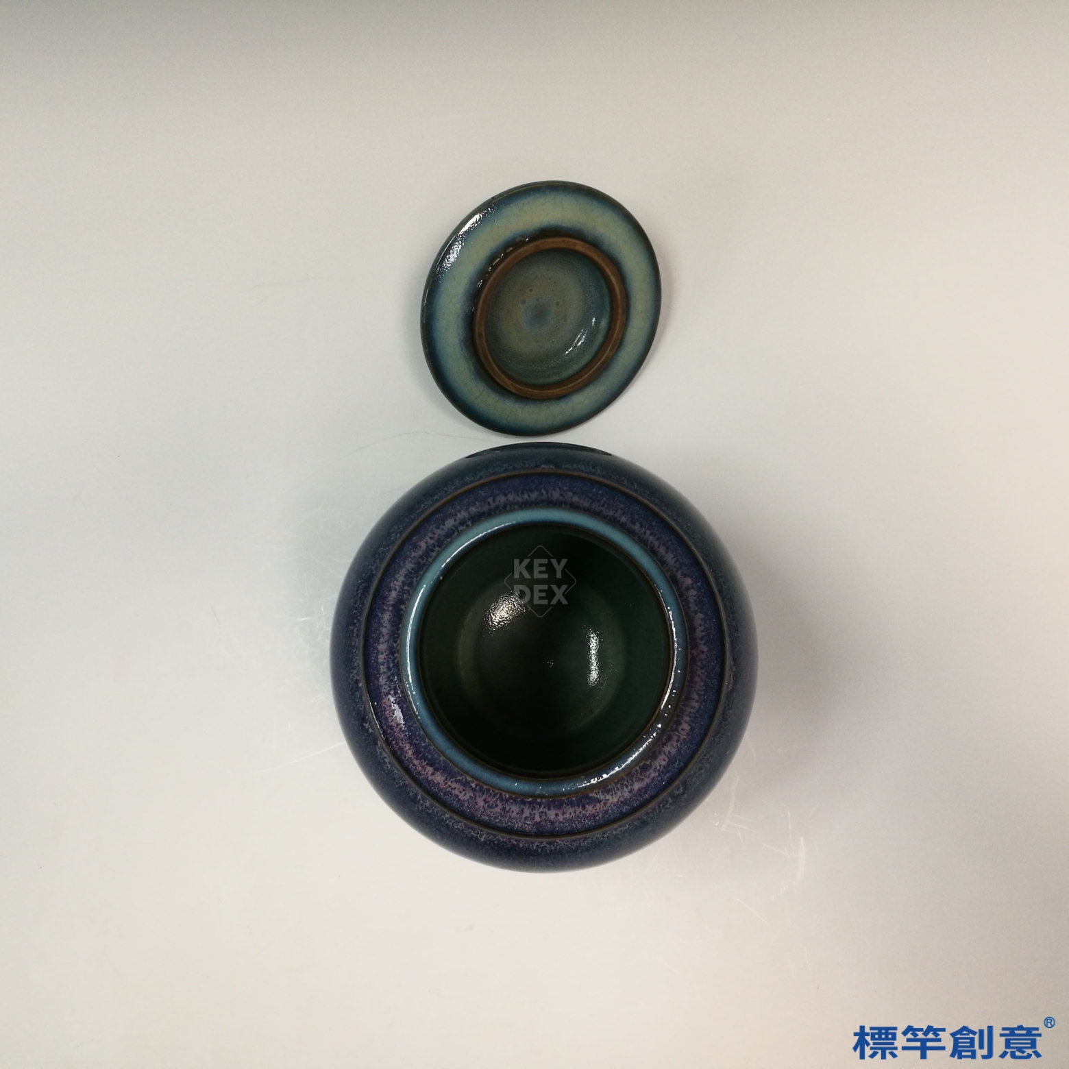 採北方氧化鐵胎,經修坯、素燒後高溫施釉,於還原氣氛中燒成。鈞窯釉色須經精密控火,使紫藍層次自然流轉。蓋與身分燒,合口需精準對接,展現高階工藝水準。