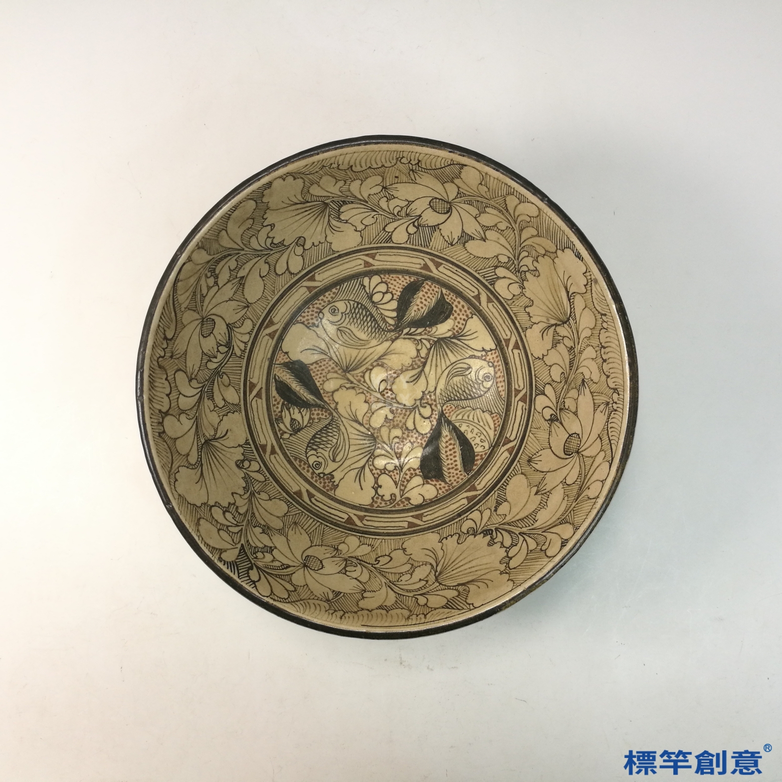 GA083 宋代磁州窯米白釉黑彩繪纏枝魚紋湯碗