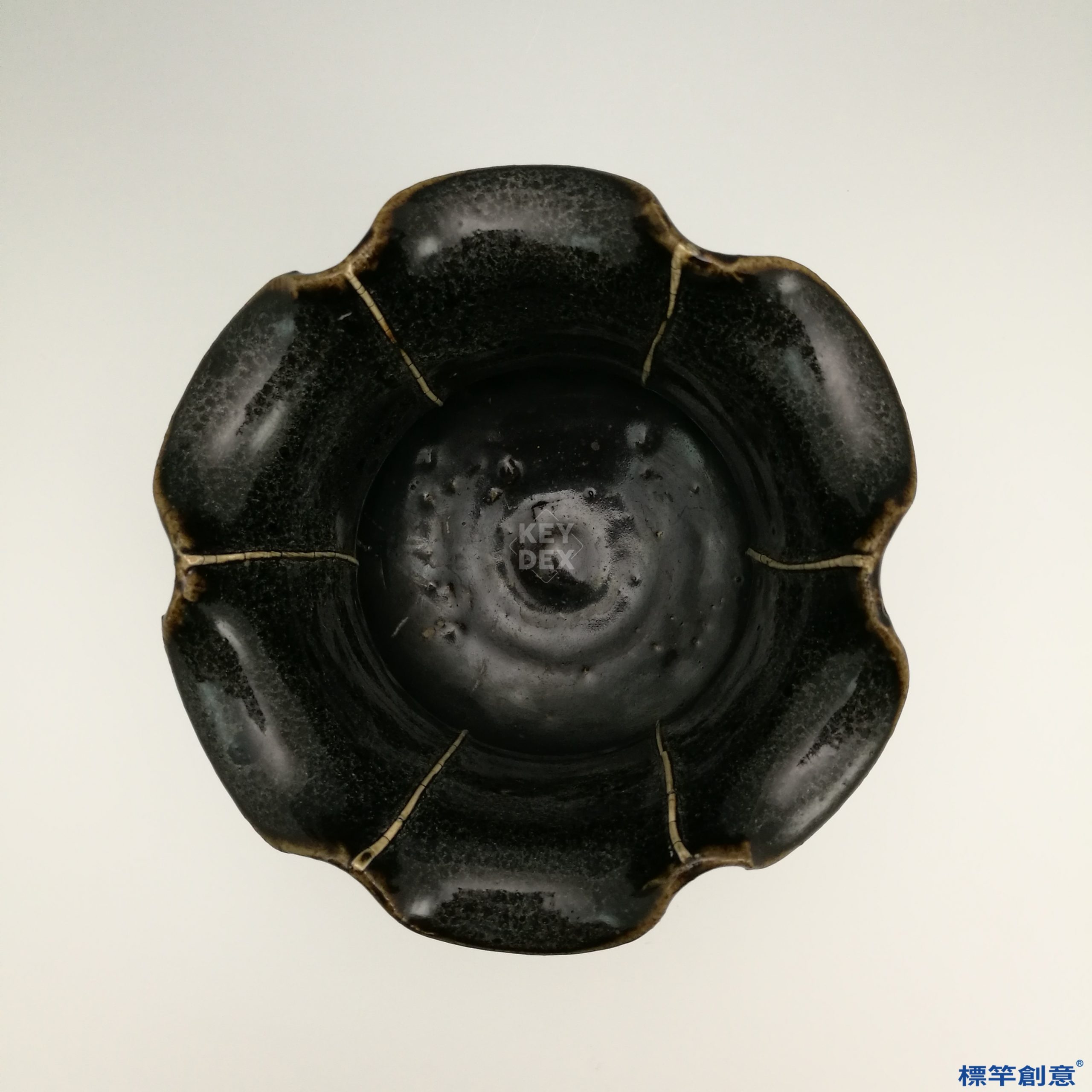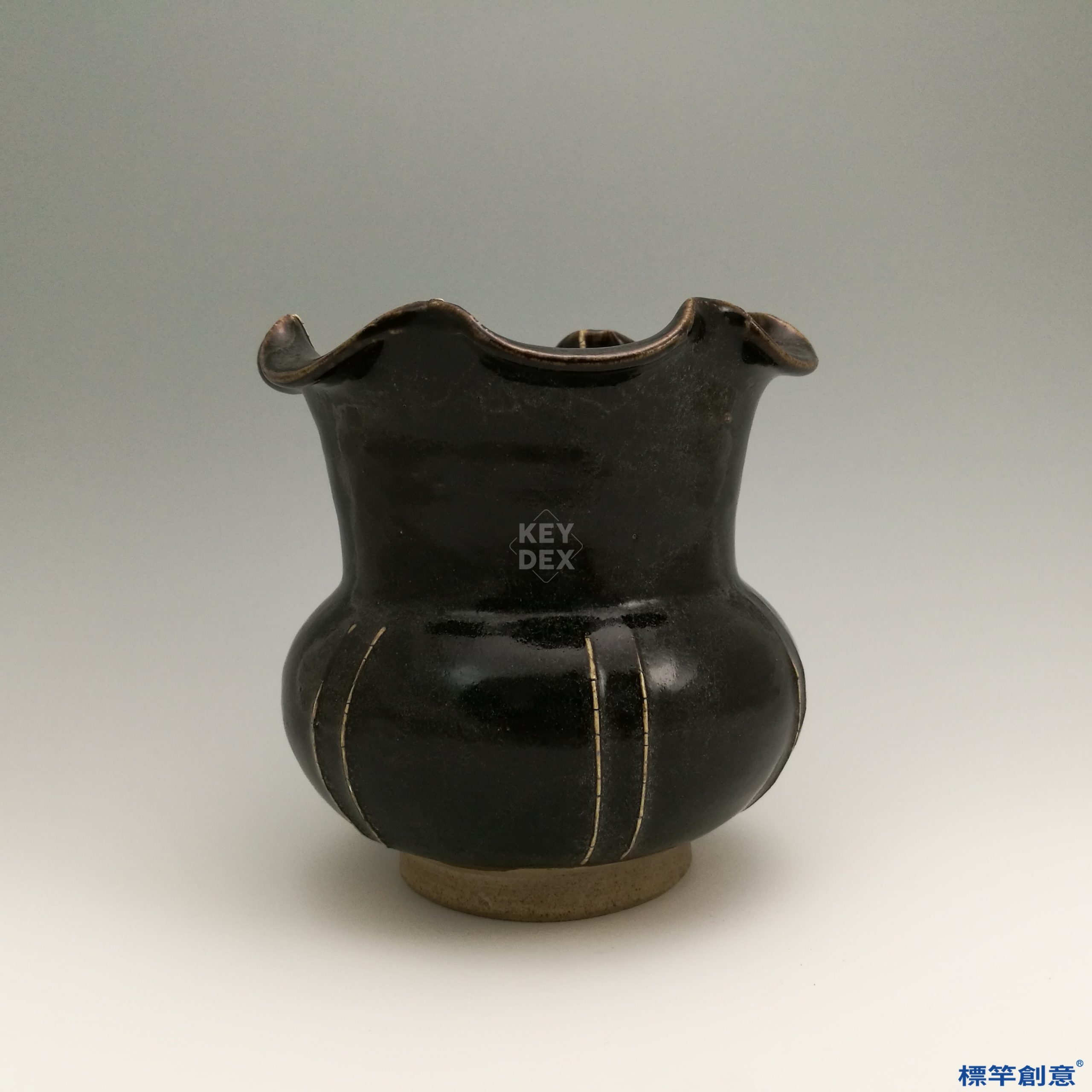 器物先以細密胎土拉坯成形,修口製作花瓣狀起伏,再經素燒定型後施以黑釉,入窯於還原氣氛中高溫燒成,釉面成色均勻,展現成熟之釉技。