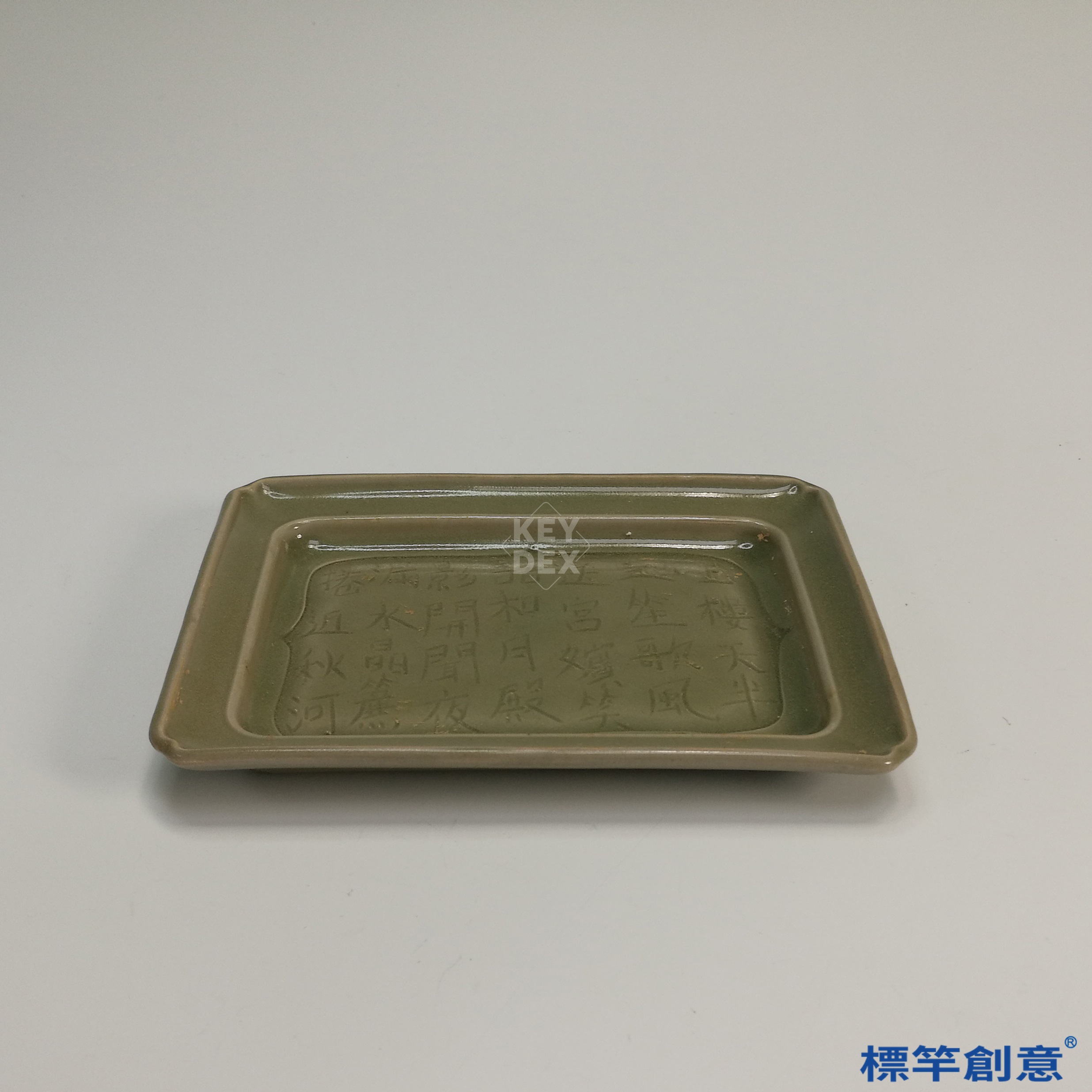 通體施土青釉,呈灰中泛褐色澤,釉面均勻細潤,釉薄處可見胎色。槽內陰刻篆書銘文,筆劃端嚴,具書法藝術價值。器底削平,製作工整。