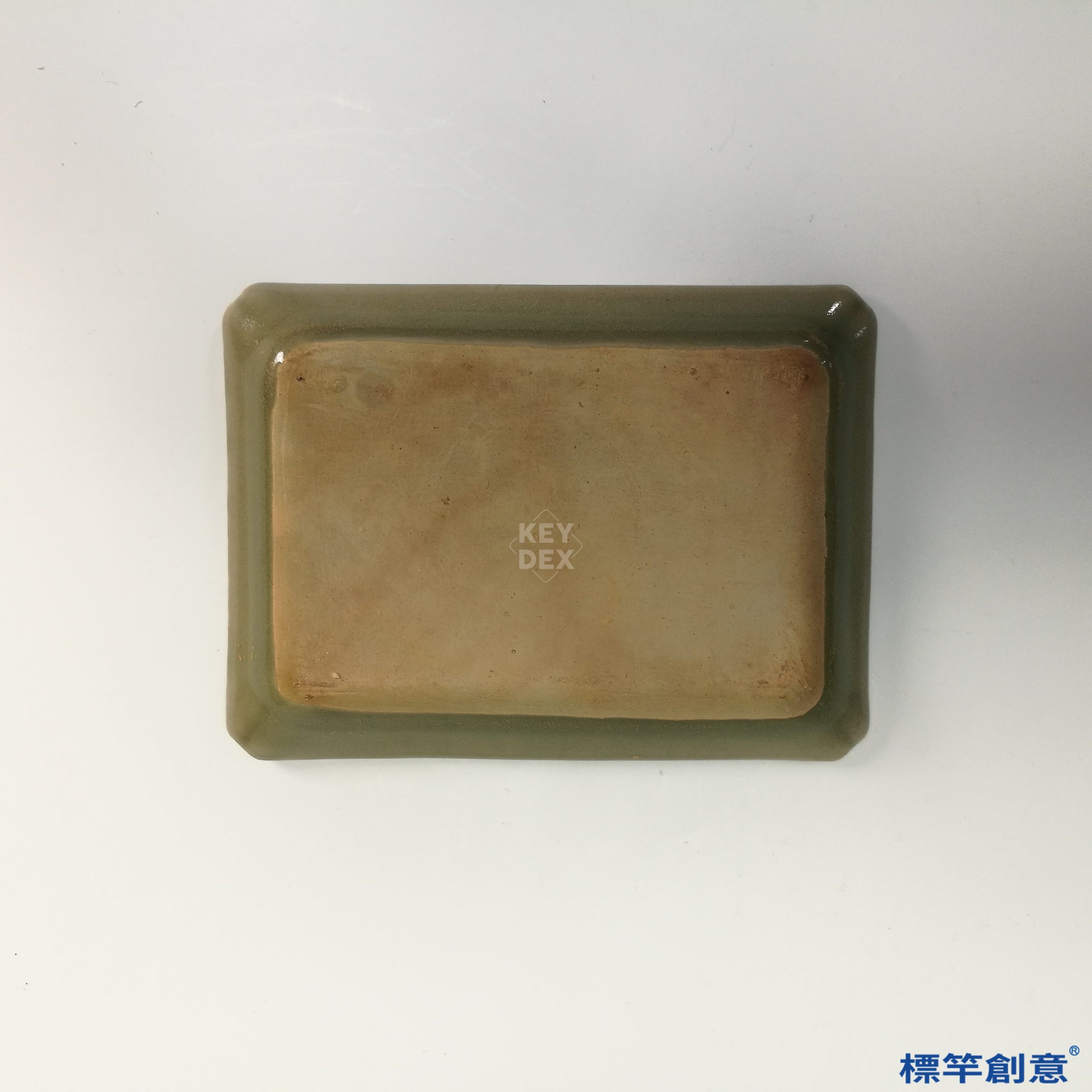 本器通高約2公分,長14公分,器形為扁平長方槽式,四角微翹,中部內凹成槽,邊角起伏有致,造型簡練而穩重。槽內可置筆鋒或蓄水,便於整筆。