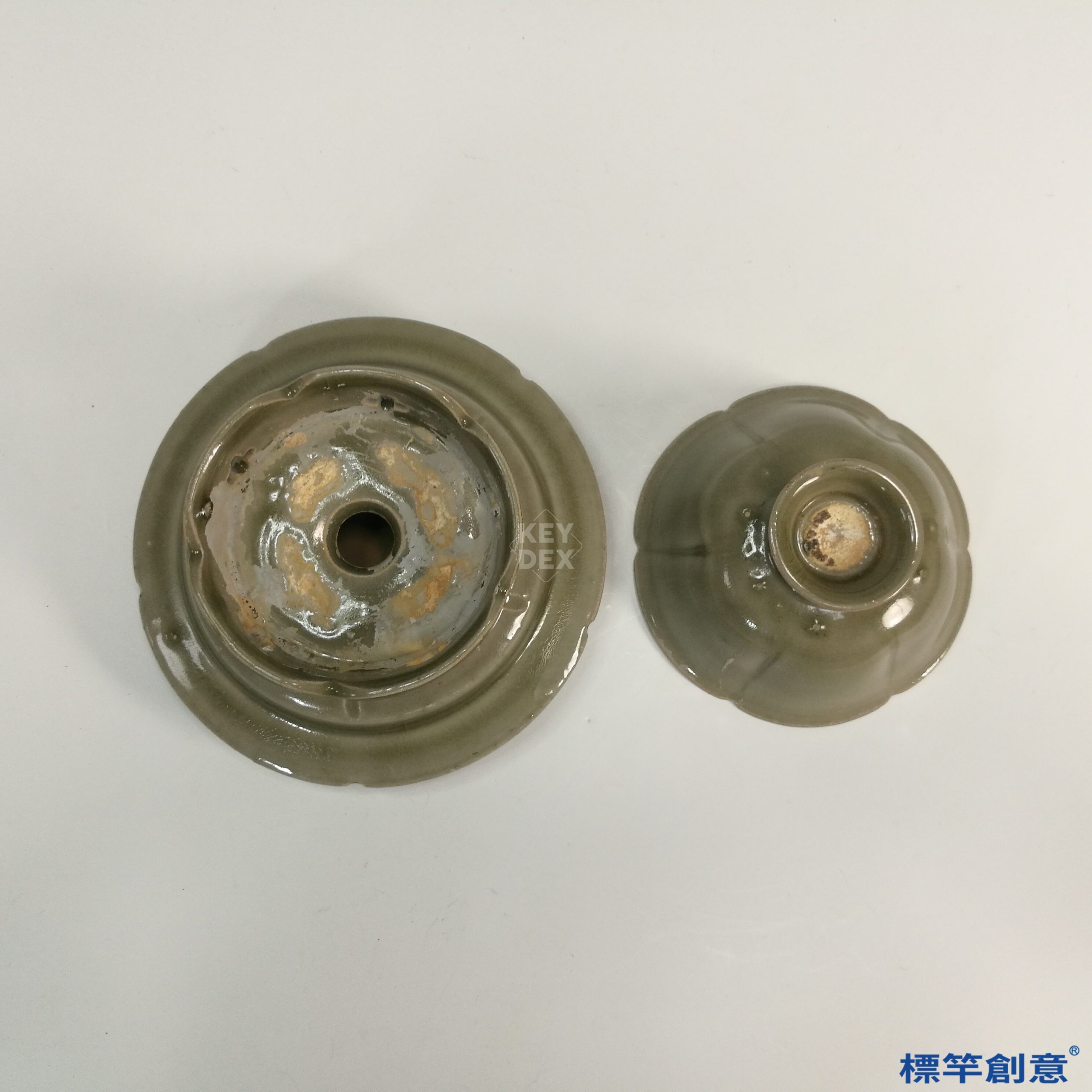 通體施褐青釉,釉色均勻穩重,光澤柔和,局部因燒成氣氛略顯色差,為典型北宋龍泉風格。盞杯外壁光素,無裝飾;盞托侈口邊緣壓印蓮瓣紋,中央平臺周圍設水波狀浮雕紋飾,下部鏤空呈花窗式,多為當時金村窯特有裝飾語彙。