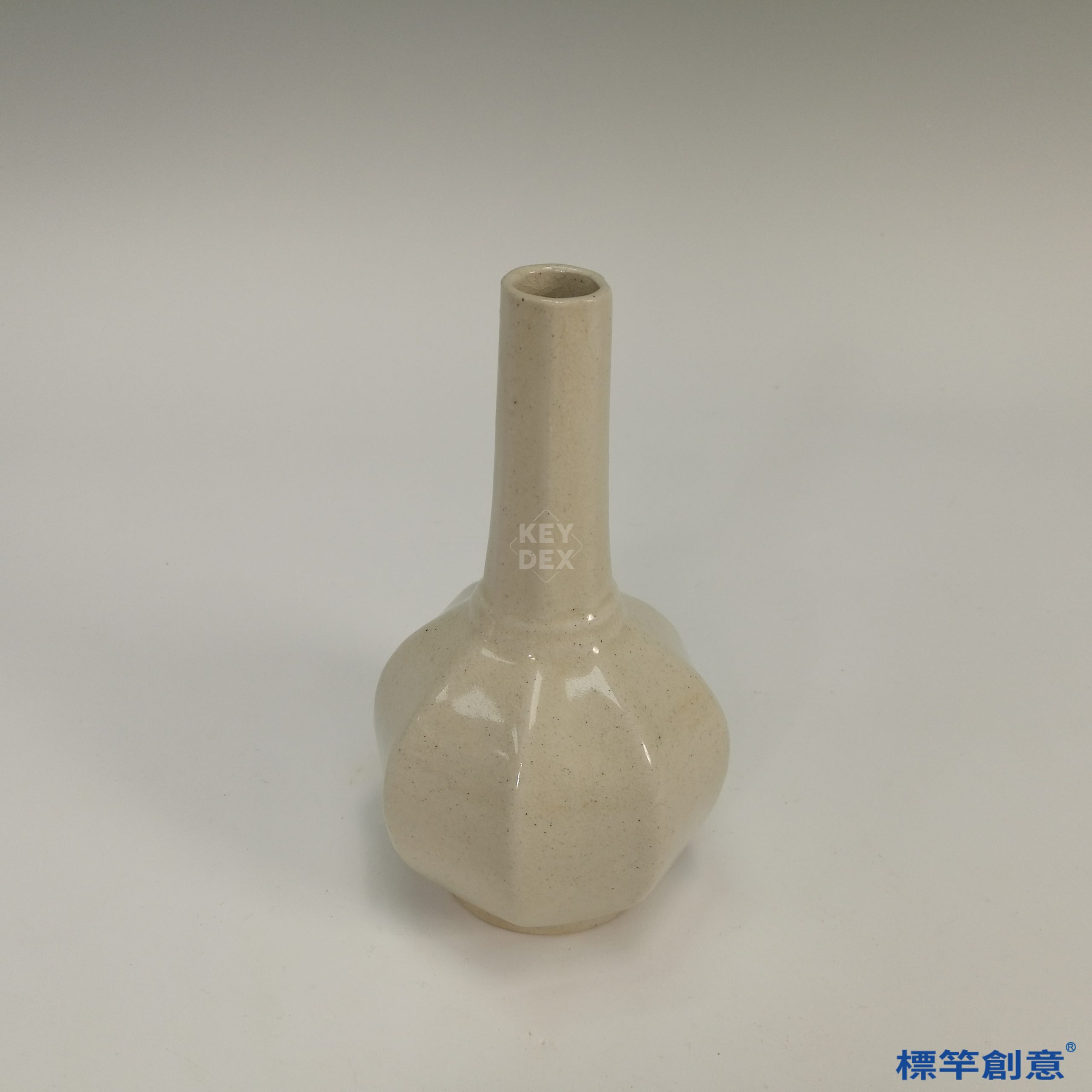 瓶體以拉坯成形,經手工修製八稜線條後施白釉,入窯還原焰高溫燒成。稜線挺拔不失圓潤,釉層均勻貼合器表,體現白舍窯工藝之成熟水準。