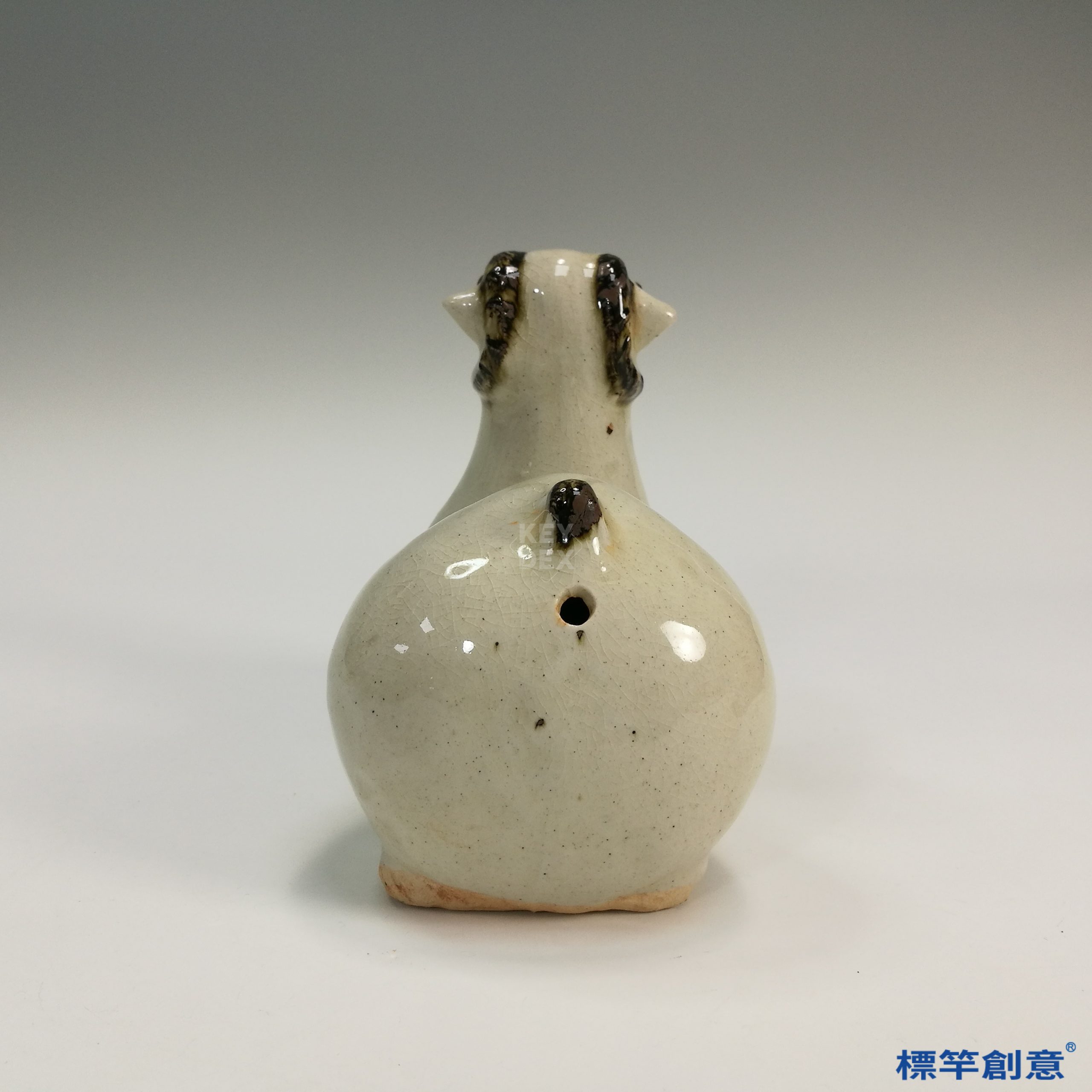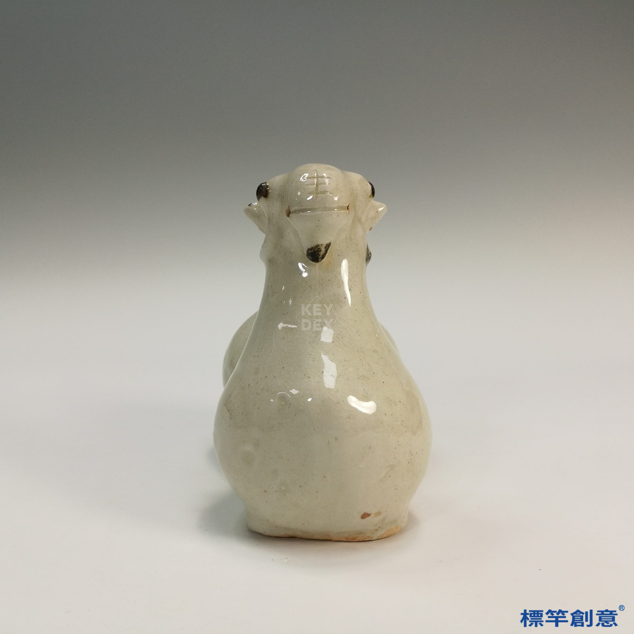 通體施白釉,釉色泛米灰,釉面光潤潔淨,部分釉薄處露胎泛褐。眼、耳、角部施褐色點彩作裝飾,簡練有神。器表無刻劃紋線,強調造型輪廓與整體神態。
