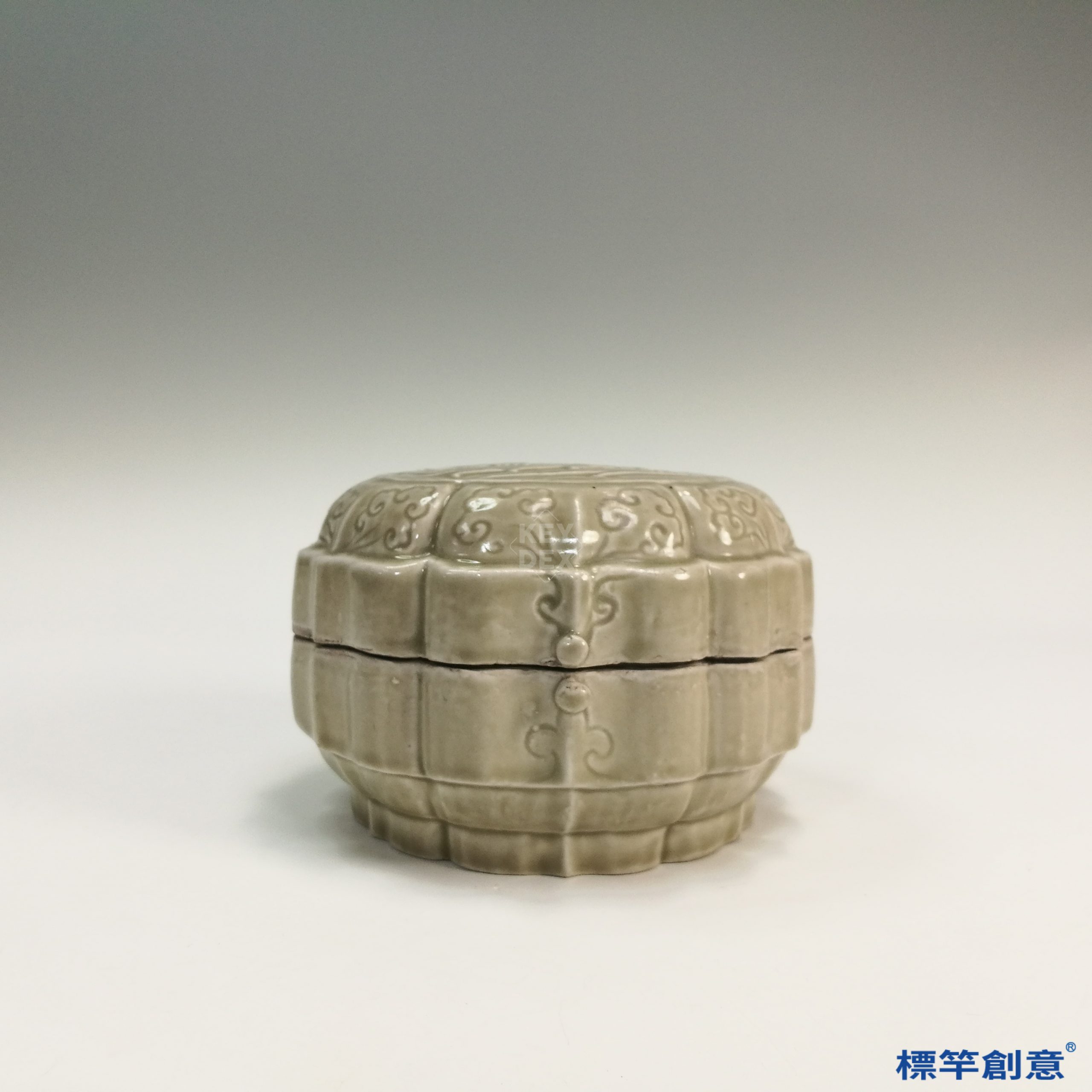 採分段製模後合成,器身與蓋模印完成後施釉,經一次燒成。還原氣氛下燒造成功控制釉面色調與光澤,使整體風格典雅端莊。