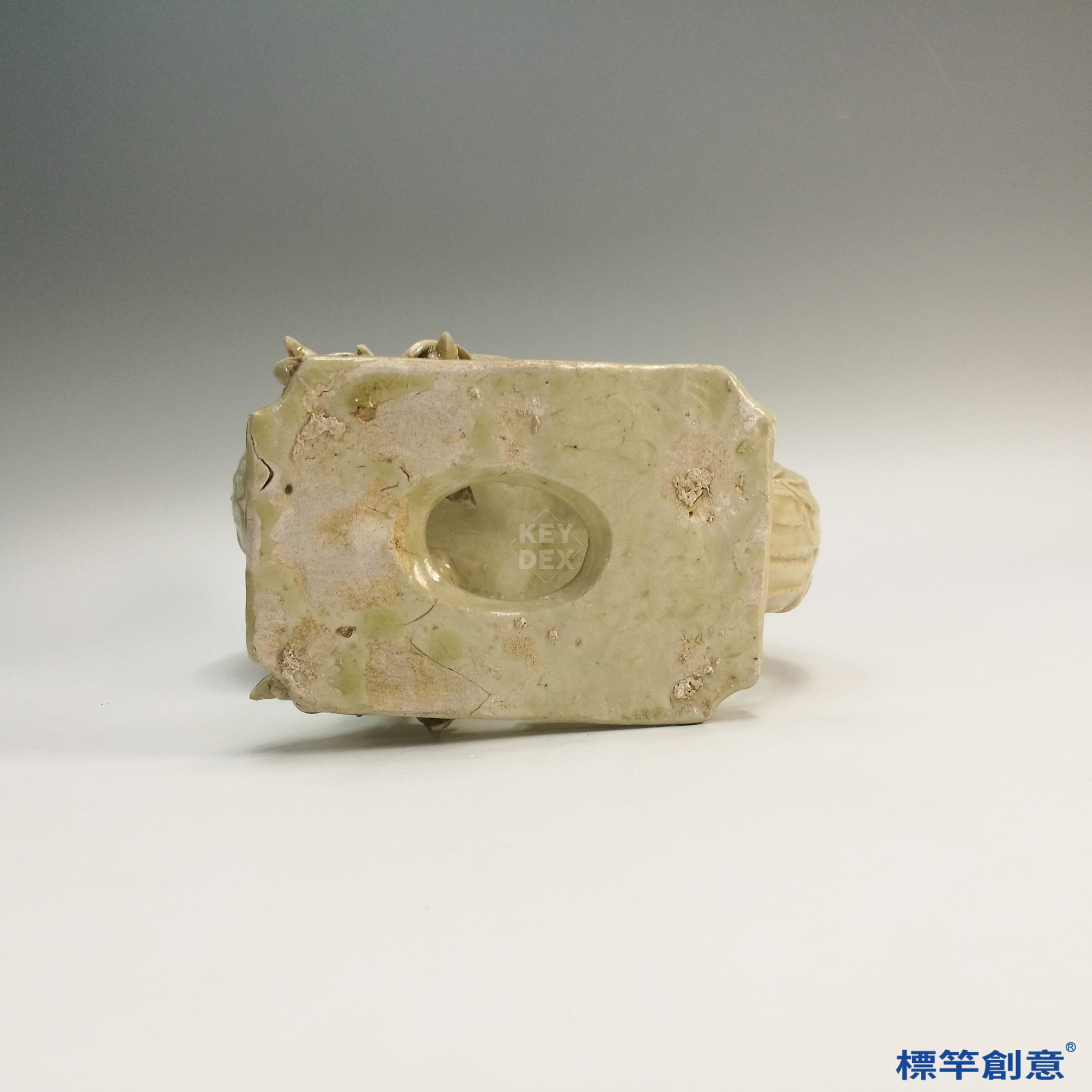 全器施米白釉,光潤透明。以模印結合貼塑技法表現羽毛、羽翼、頭冠等鳳鳥細節,層次分明,形神俱備。釉面局部有流釉現象,為高溫燒製自然結果。