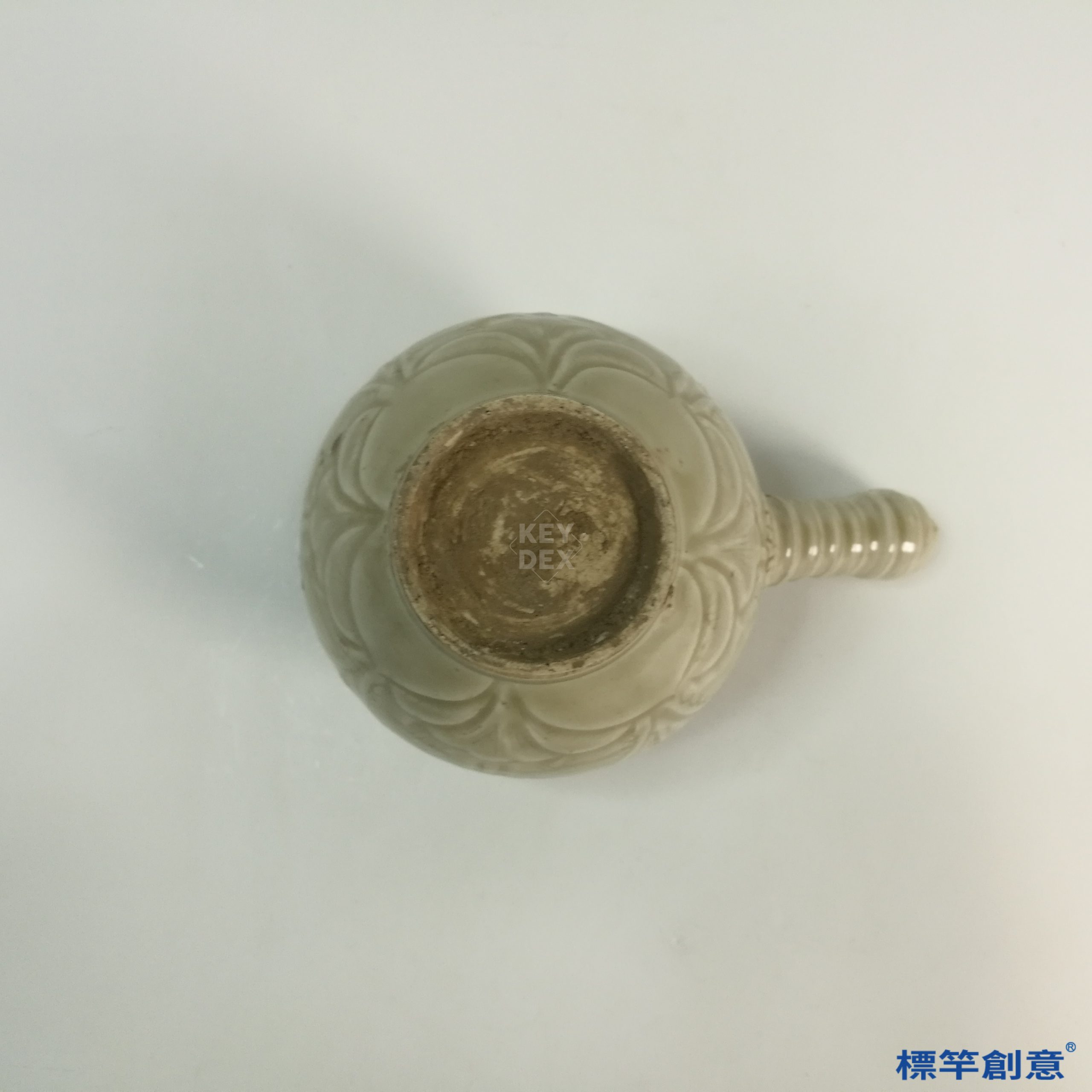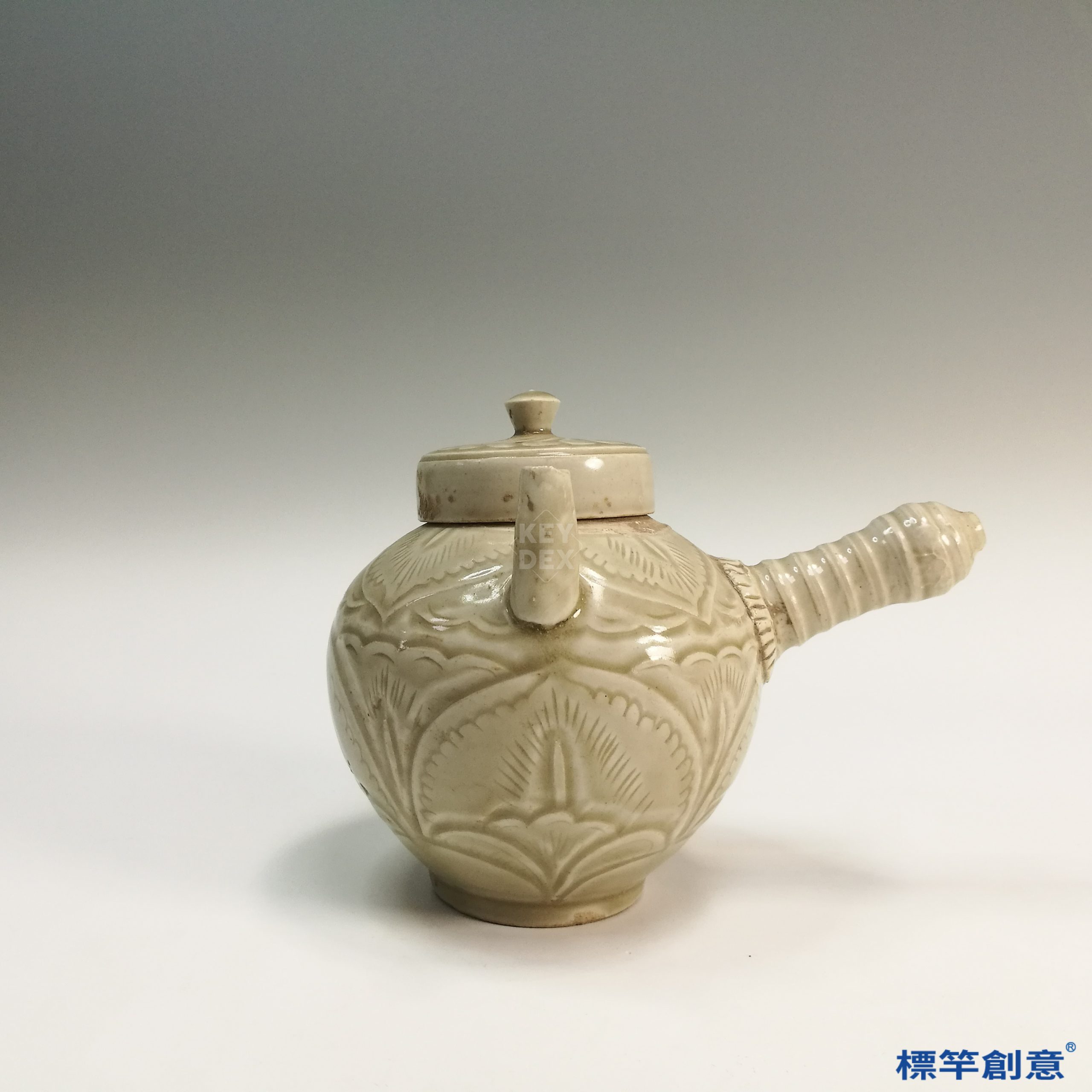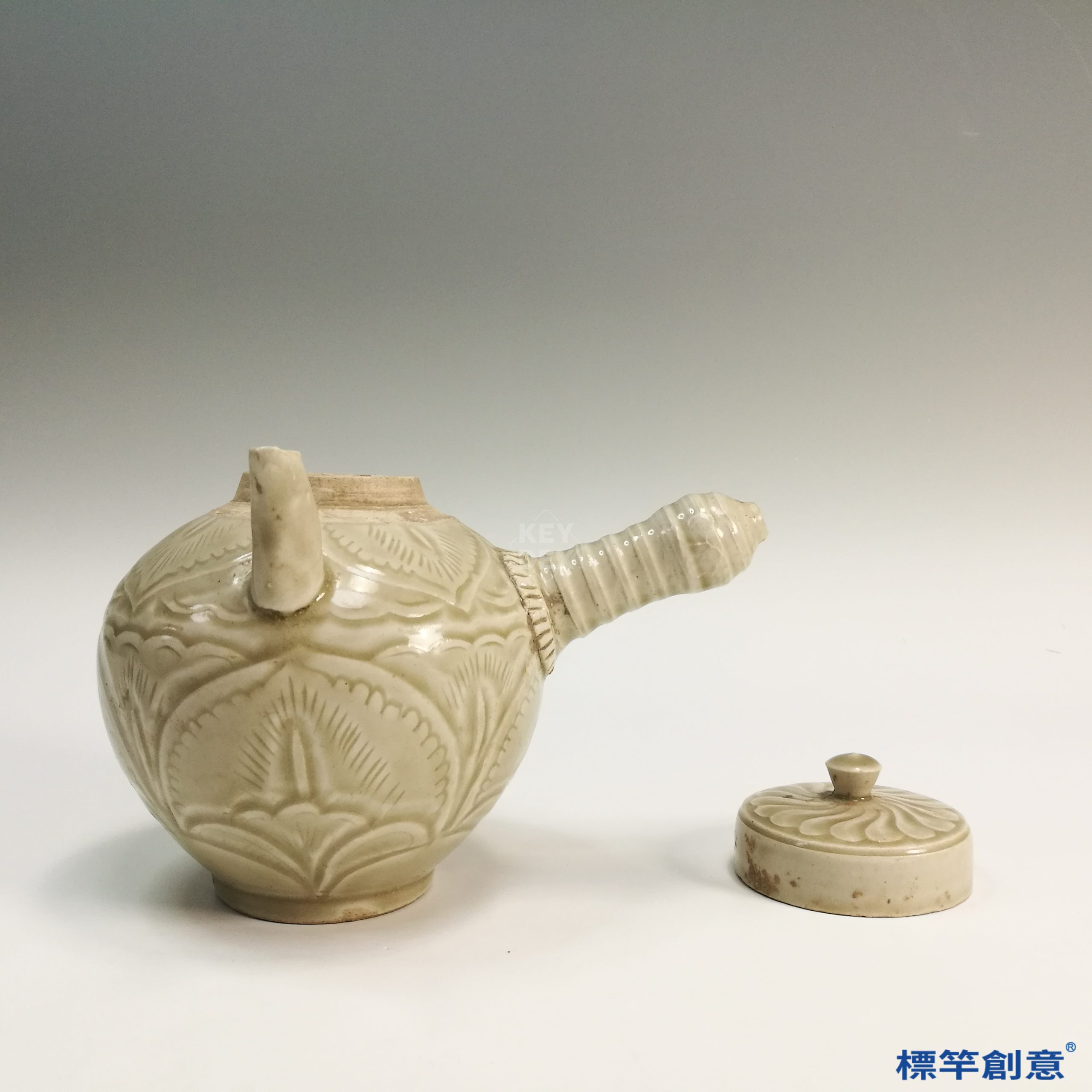 GB082 北宋龍泉金村窯米白釉刻蓮瓣紋側把煮茶壺