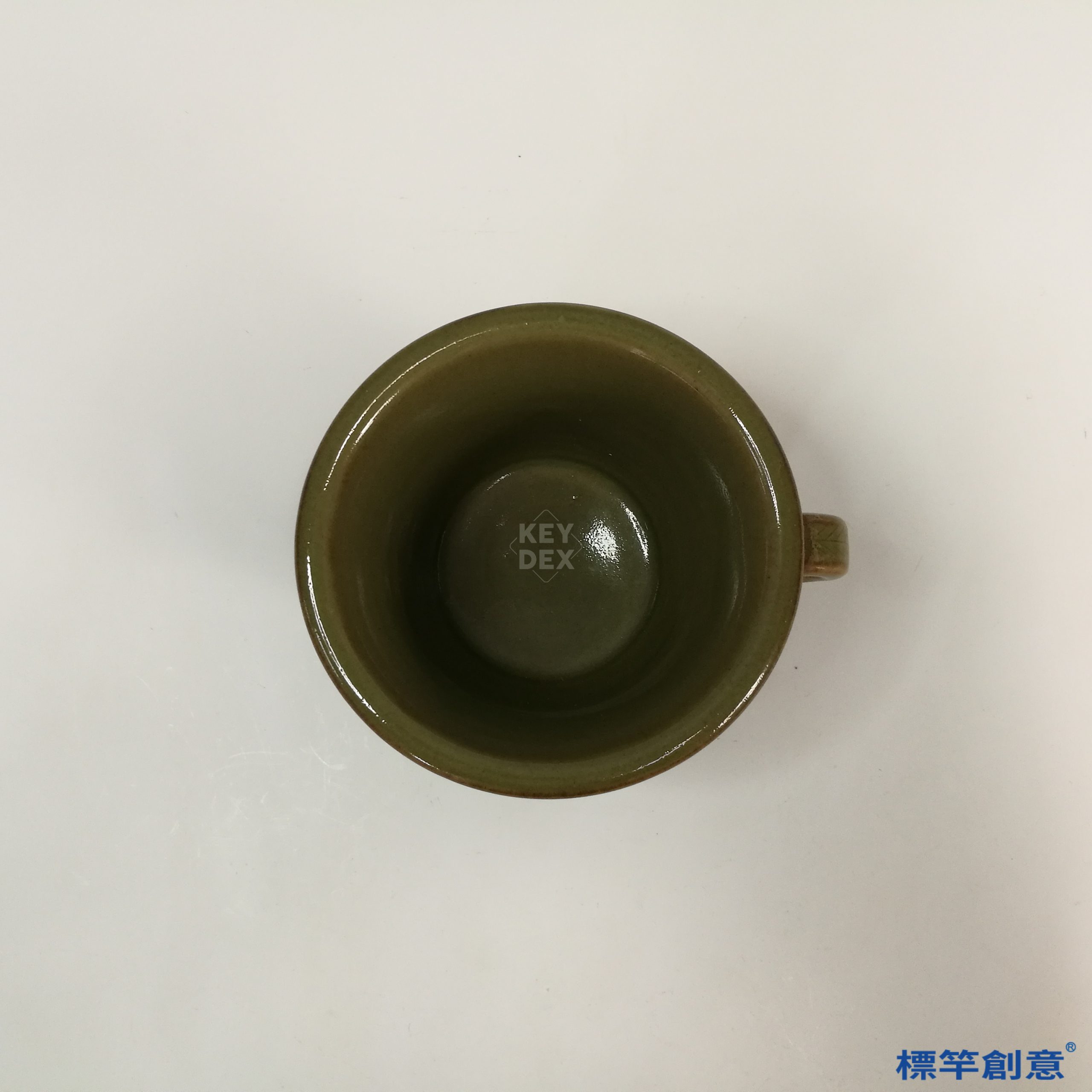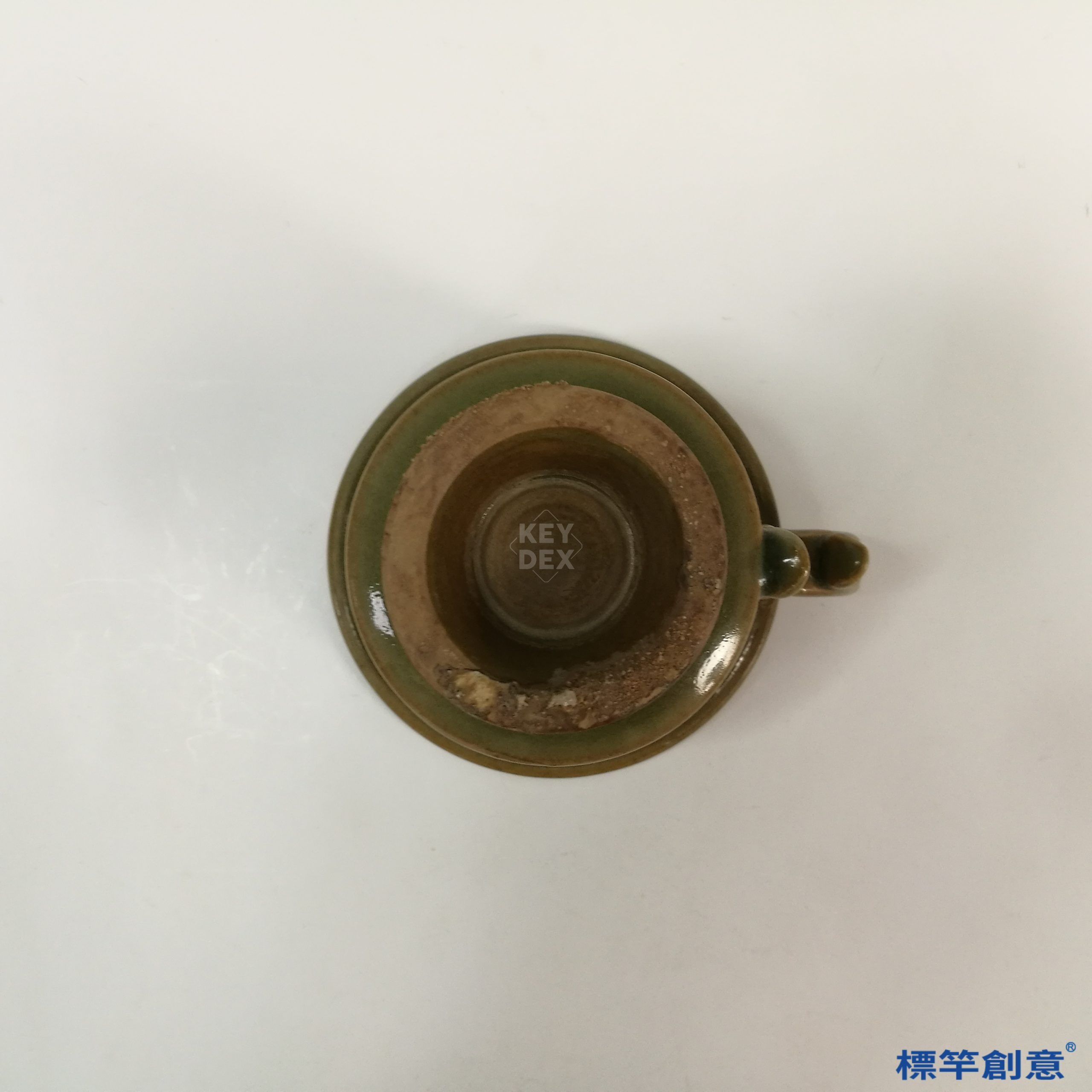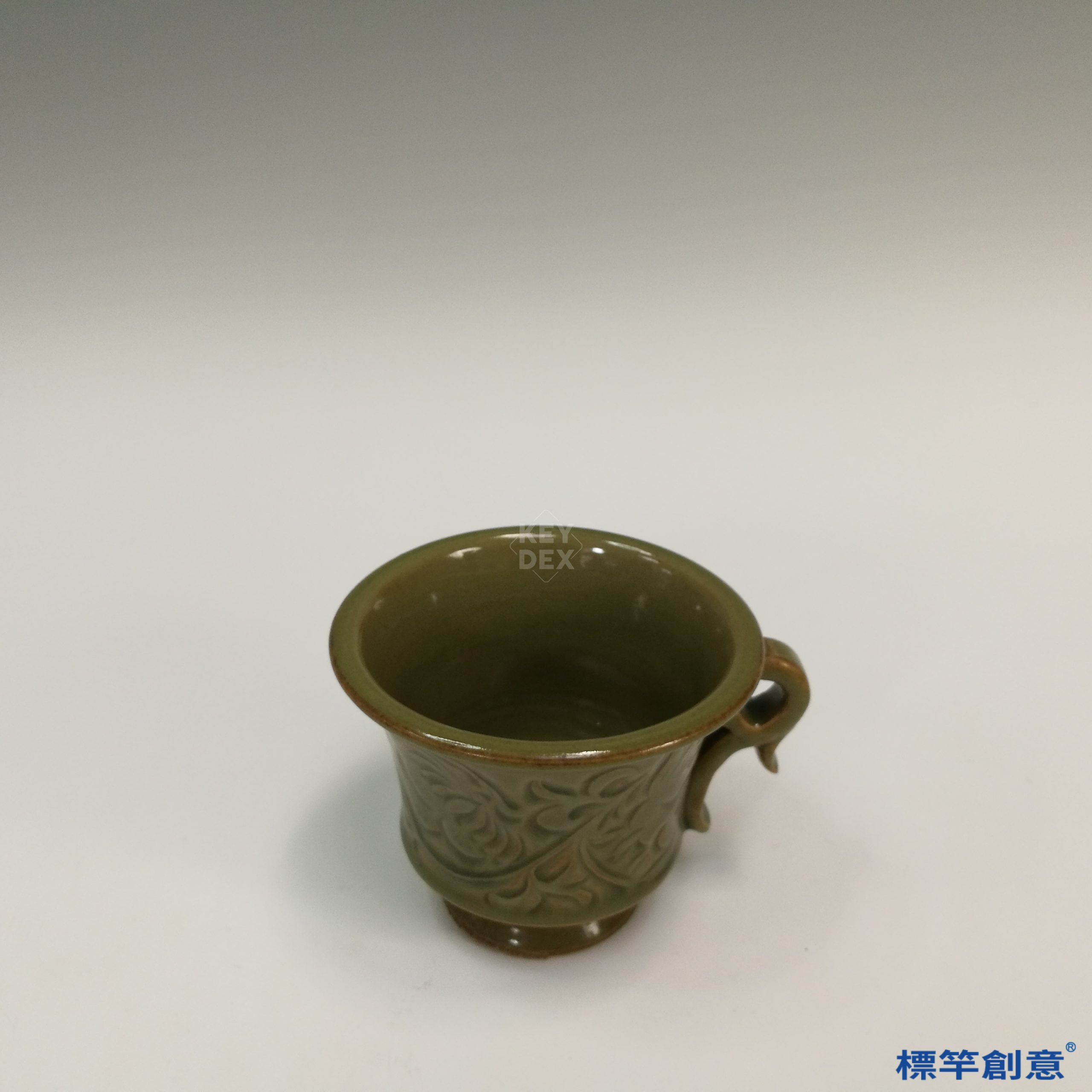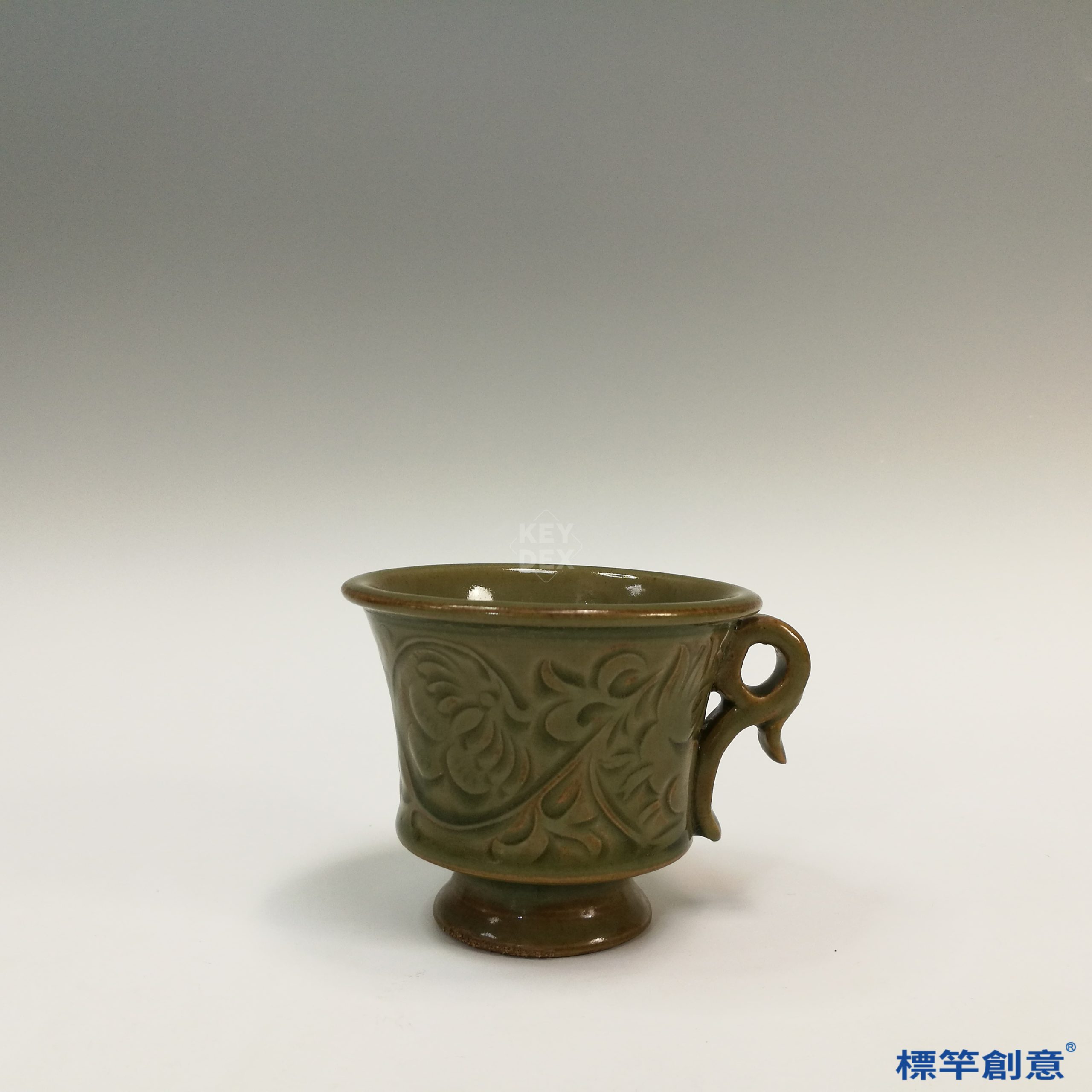 本器通高8.5公分,口徑11.5公分。杯體呈敞口斜壁、圈足微撇,下承高圈足,右側設一枚仿金屬器形態的扁弧形單把,末端作鳳首造形,極具裝飾性。