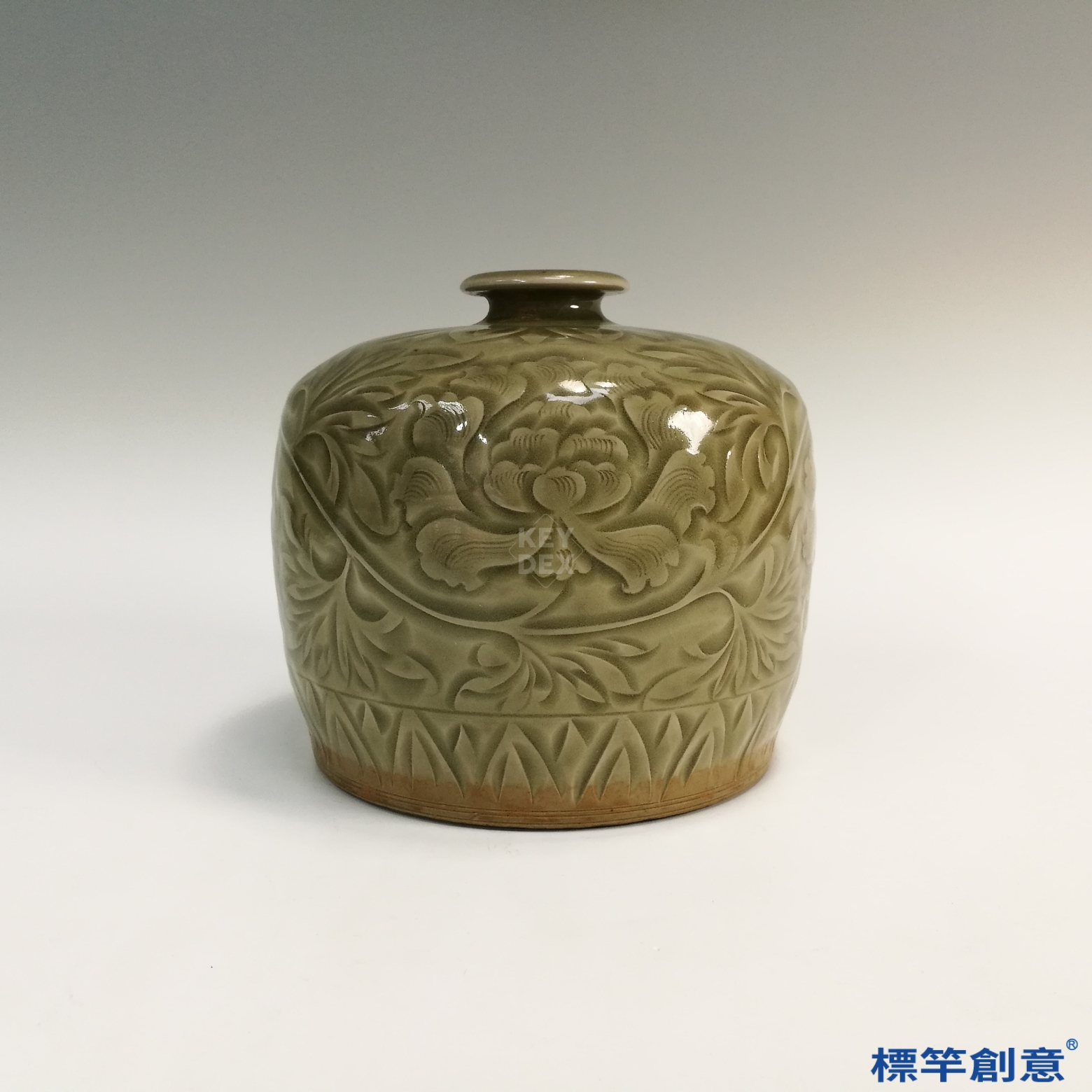通體施褐青釉,釉色沉穩溫潤,釉層較厚,開片自然。腹部刻飾纏枝牡丹紋,構圖繁麗,刀法流暢,呈現耀州窯工匠嫻熟的刻花技巧。瓶身下段略收,增添視覺上的挺拔感。