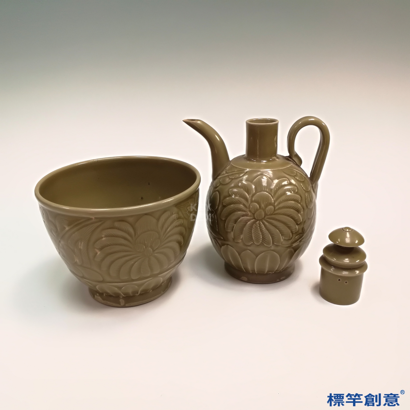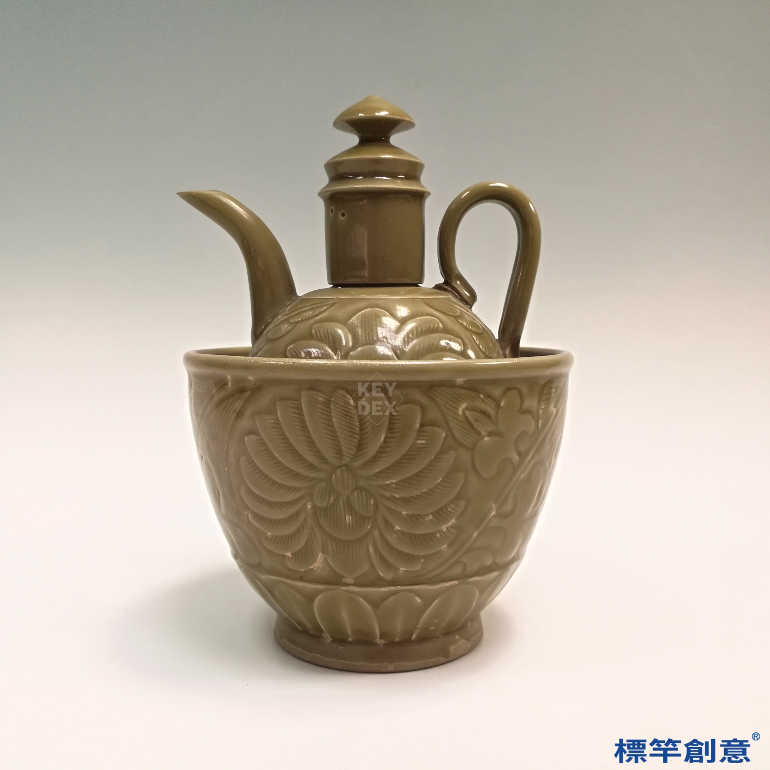 GB095 北宋越窯土青瓷刻花卉紋酒壺壺托一套
