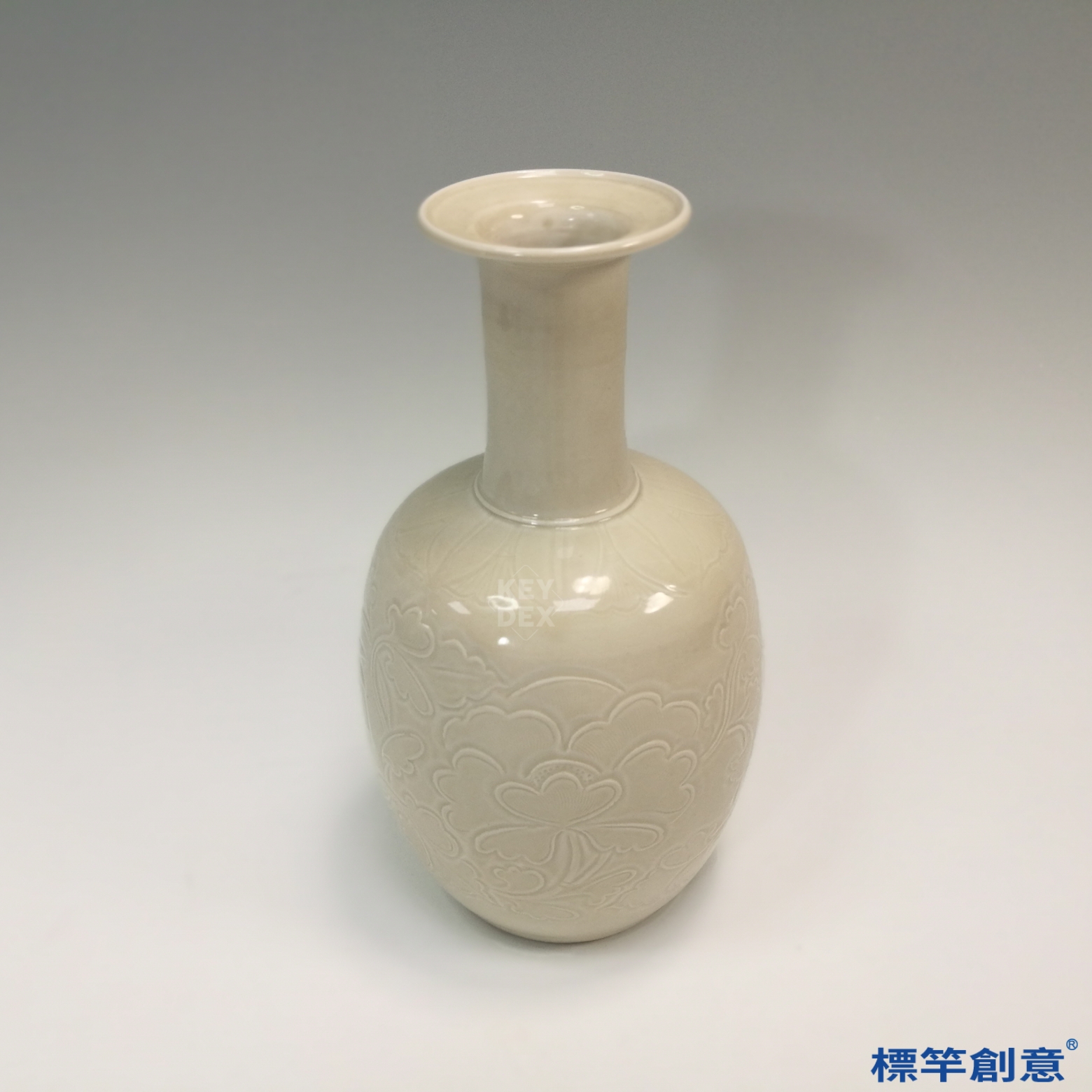 採細白瓷胎,經素燒後施白釉,再入還原焰窯中高溫燒成。瓶身刻紋於釉下先行雕製,入窯後釉面流釉包覆,形成清晰潤透的釉下刻花。