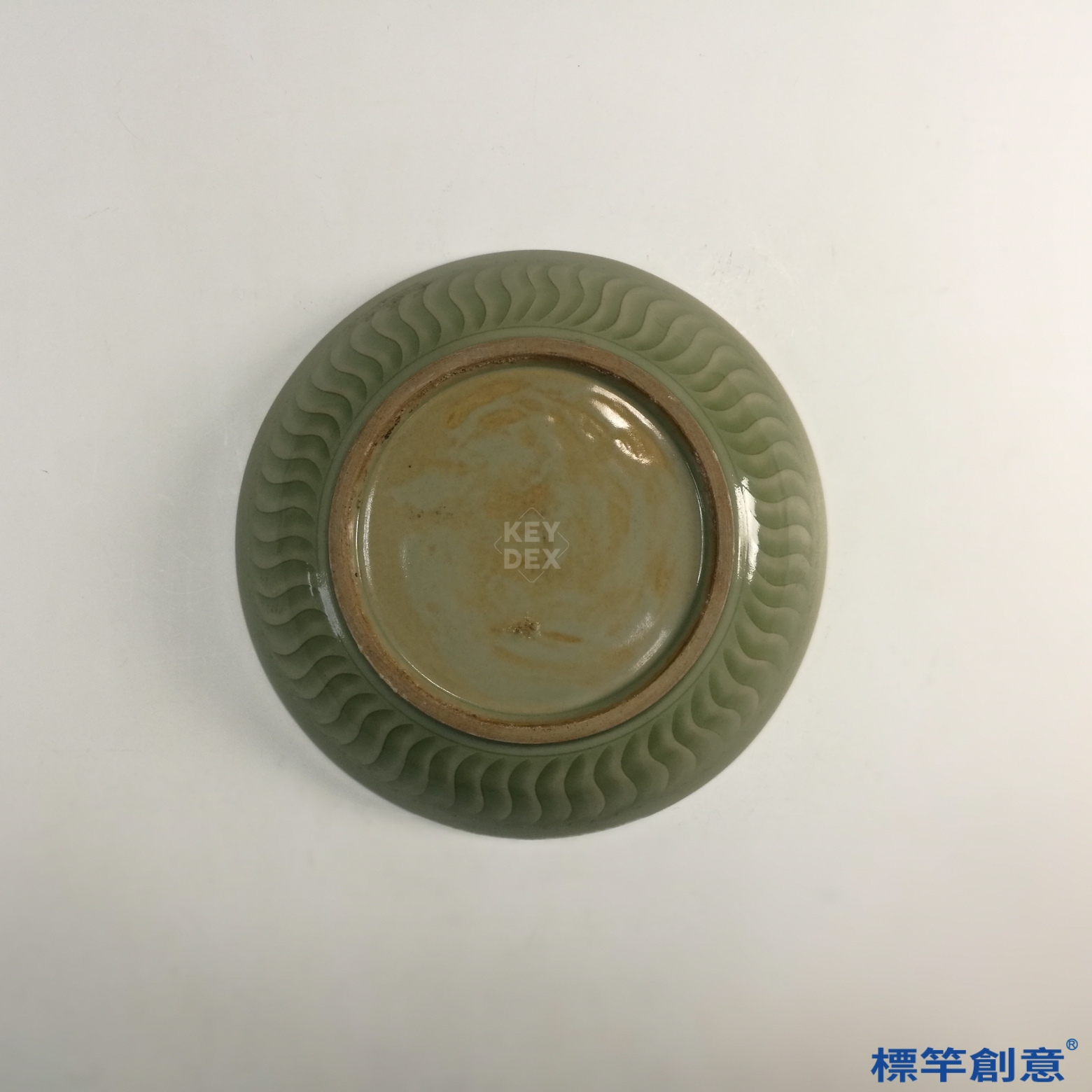 採多件疊燒方式,盤底露胎,為典型耀州窯匣缽支燒痕跡。胎質堅密,釉層勻淨,燒成溫度控制得宜。