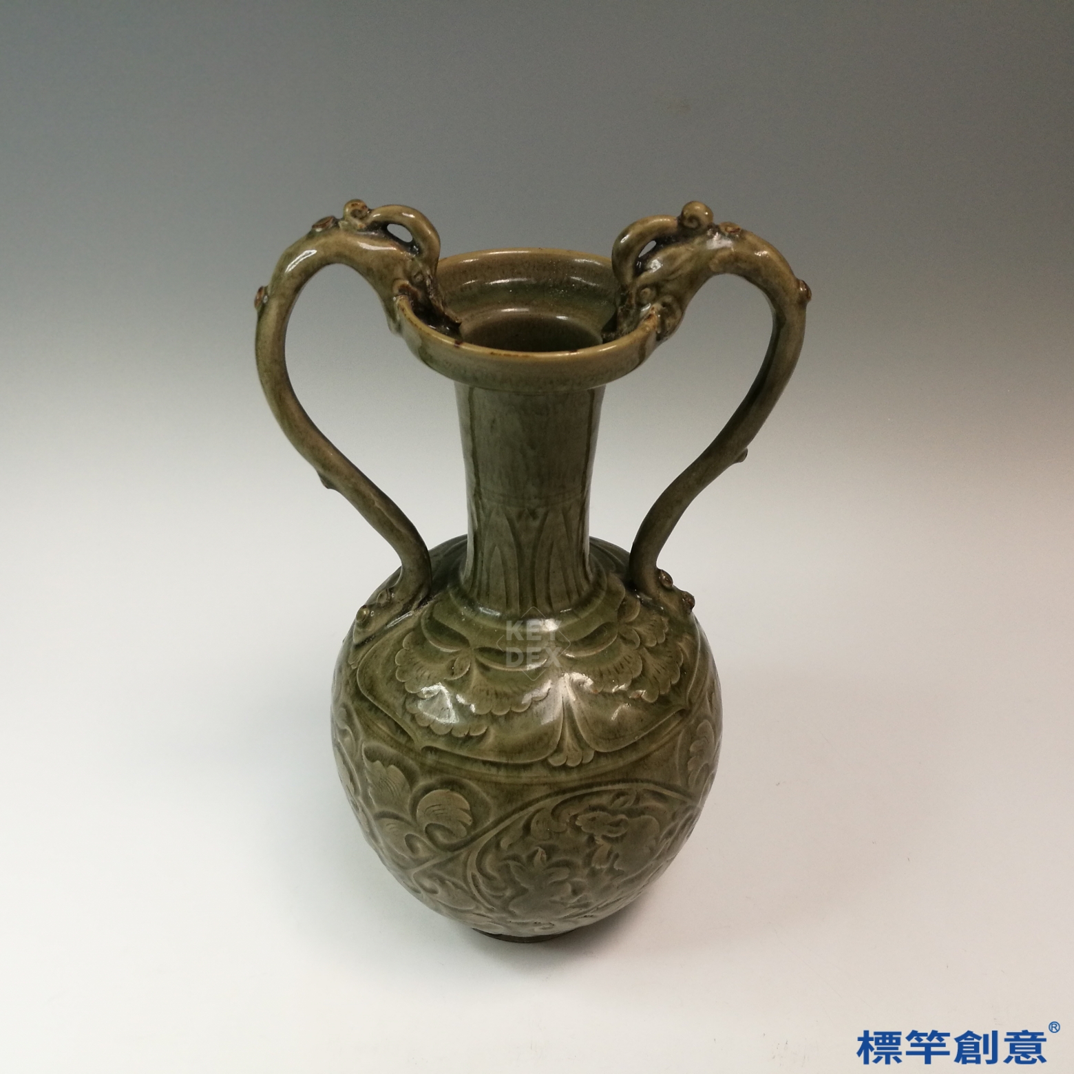 GB111 北宋耀州窯褐青瓷刻纏枝花卉紋雙龍耳瓶