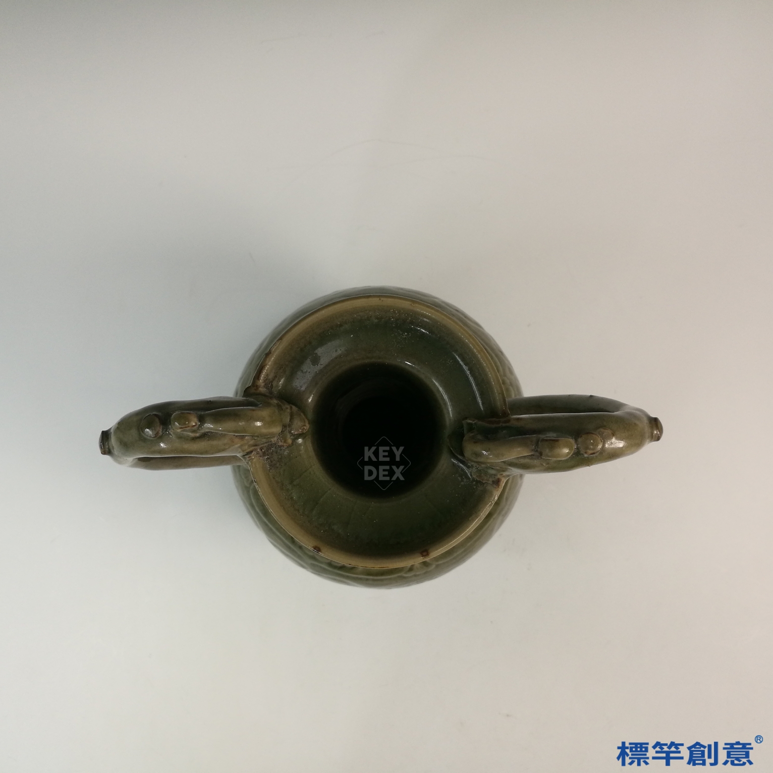 器體以細白瓷土拉胚成形,貼塑龍耳後進行刻花裝飾,經素燒後施褐青釉,再入還原焰高溫焙燒而成。釉層與紋飾皆清晰立體,燒成溫度掌控準確。