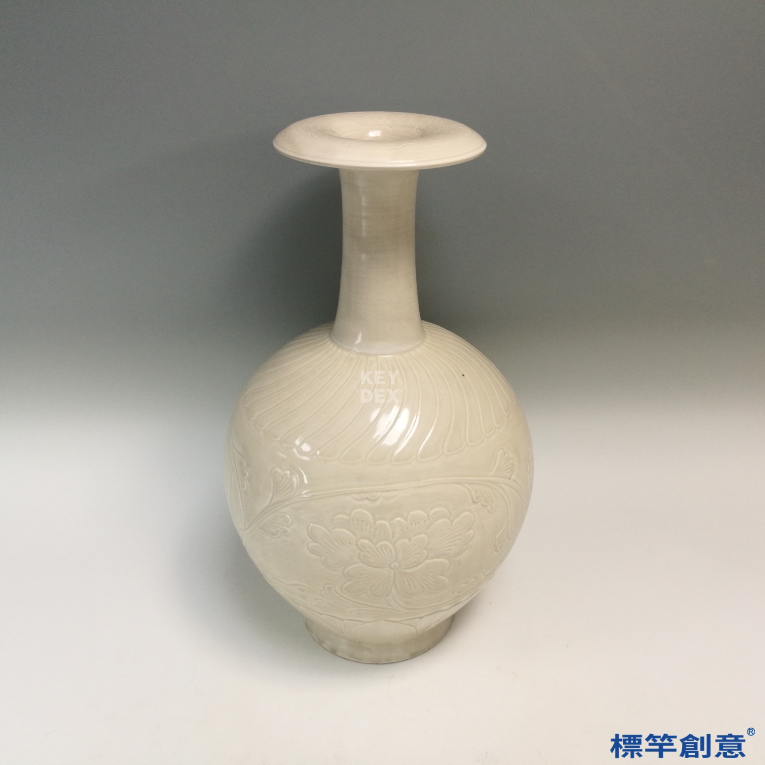 紙槌瓶源自唐代酒器造型,北宋定窯將其加以演變,融入文人審美與花器功能,成為宋代白瓷中的經典形式。此件保存完整,裝飾精工,體現定窯成熟的刻花工藝與釉色美感,為北宋白瓷研究的重要標本。