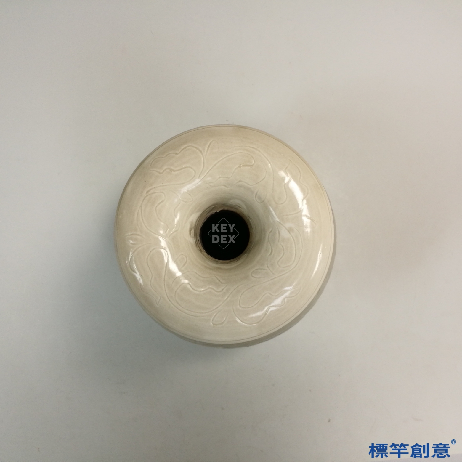 胎體以細緻高嶺土製成,刻紋後施一層透明米白釉,入匣缽覆燒,經高溫還原焰燒製而成。盤口為整體塑成,不見接痕,顯示其一體成形之高超工藝。