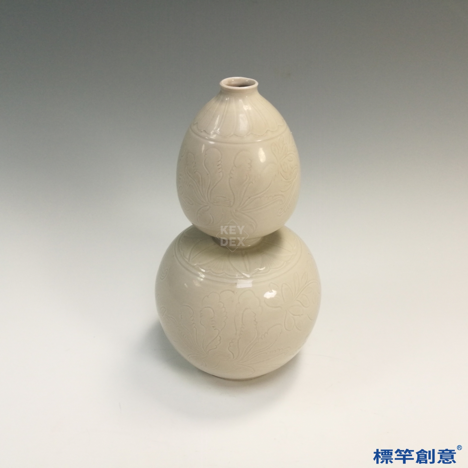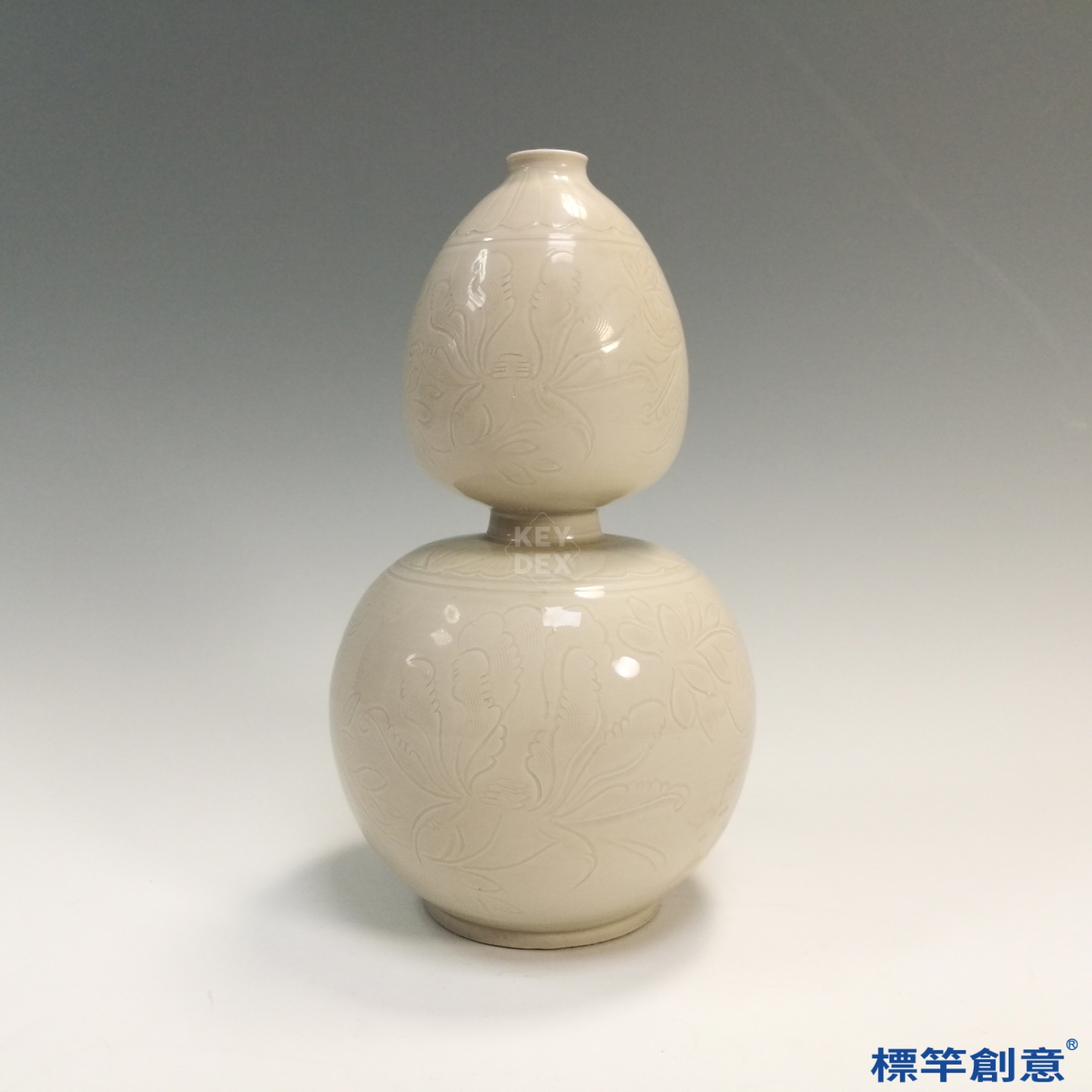 適合現代瓷藝創作中參考葫蘆形器物比例配置、釉下劃花技法與柔和米白釉色調之搭配,融入當代文創或空間裝飾中具極佳啟發性。