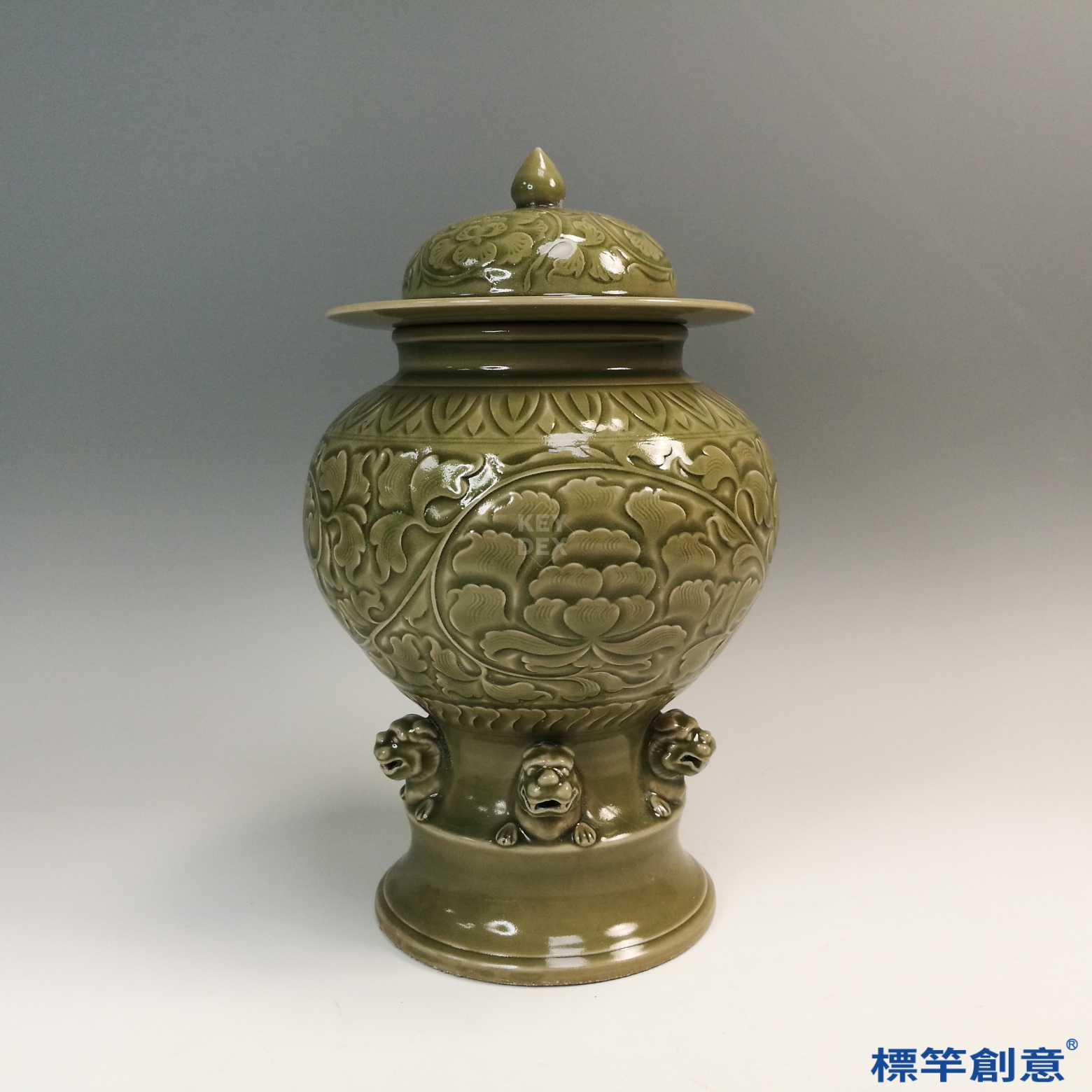 GB133 北宋耀州窯褐青瓷刻牡丹紋豆式將軍罐