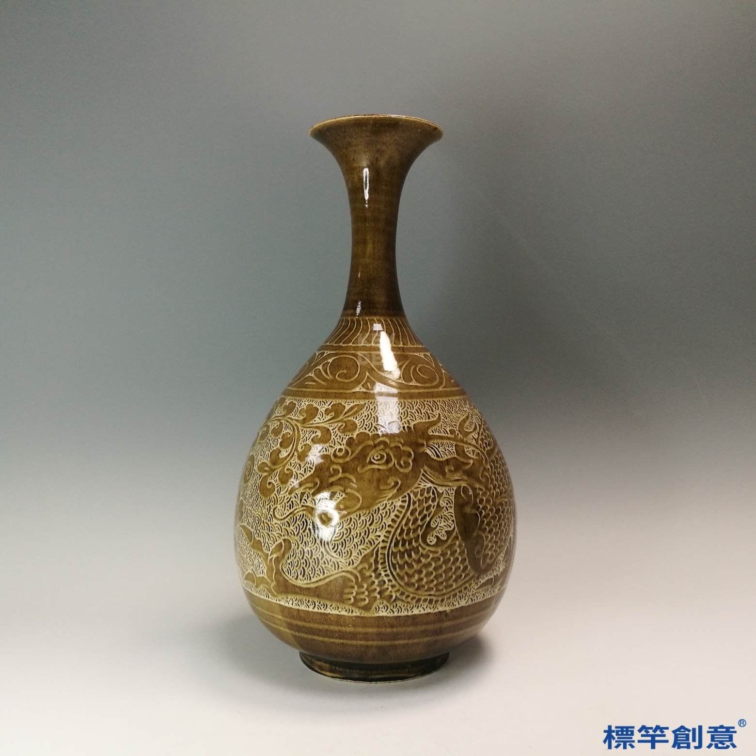 GB152 北宋定窯亮面褐黃釉刻龍紋玉壺春瓶