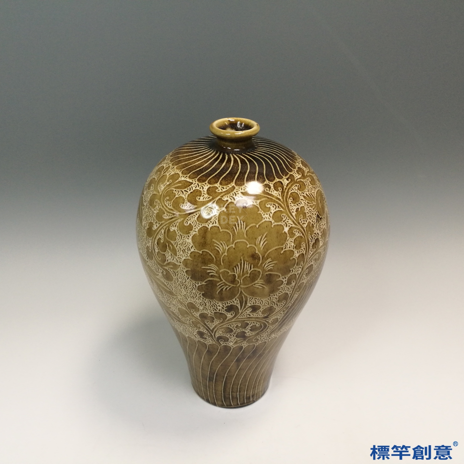 GB153 北宋定窯亮面褐黃釉刻纏枝牡丹紋梅瓶