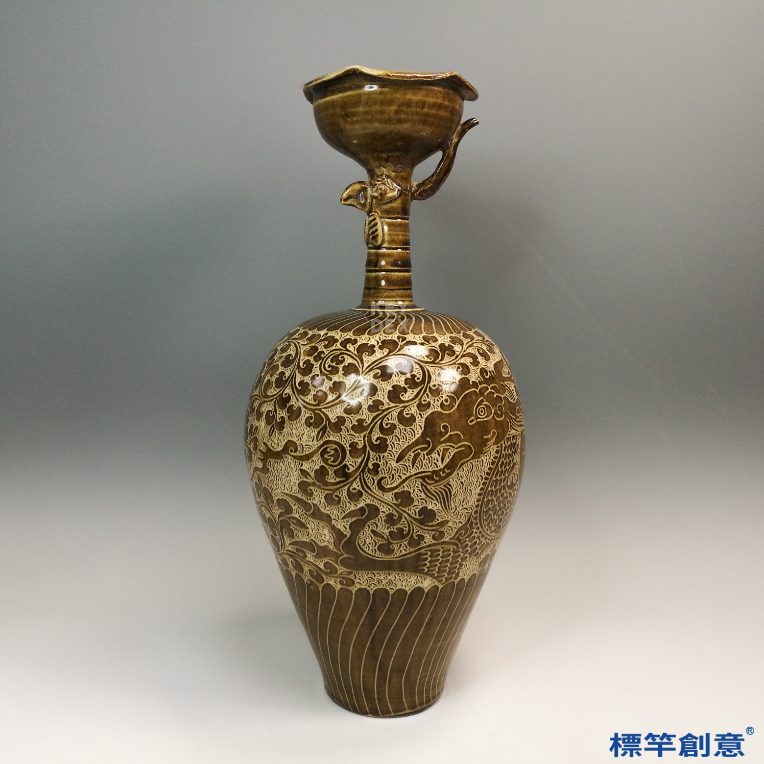 通體施亮面褐黃釉,色澤溫潤中帶金光,屬定窯異色釉中難得之作。壺身以刻花工藝描繪鳳鳥與纏枝花卉紋,鳳鳥翎羽細密,線條流暢,刀法勻稱,構圖繁而不亂。頸部鳳首為貼塑成形,立體感強,富西亞裝飾風格,為宋代吸納異域藝術語彙之明證。