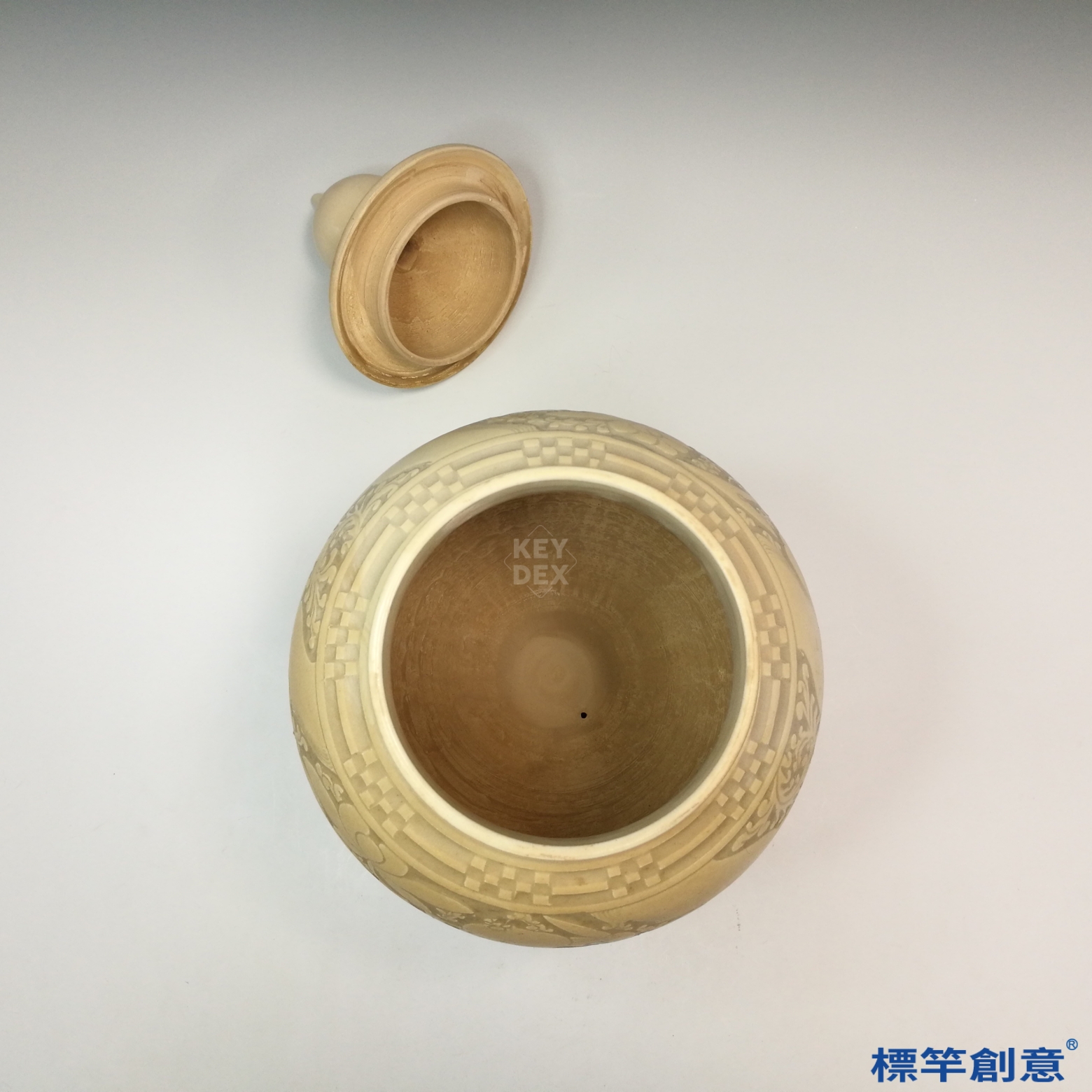通體施米黃釉,色澤溫潤柔和。器身以剔花技法雕飾蓮瓣與嬰兒圖像,呈現清晰立體之效果。蓋部塑作佛塔形,象徵宗教信仰與護佑力量。