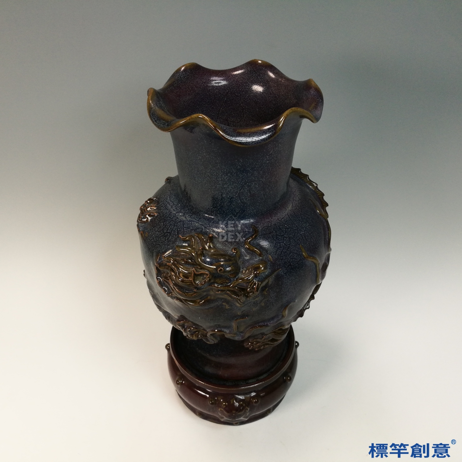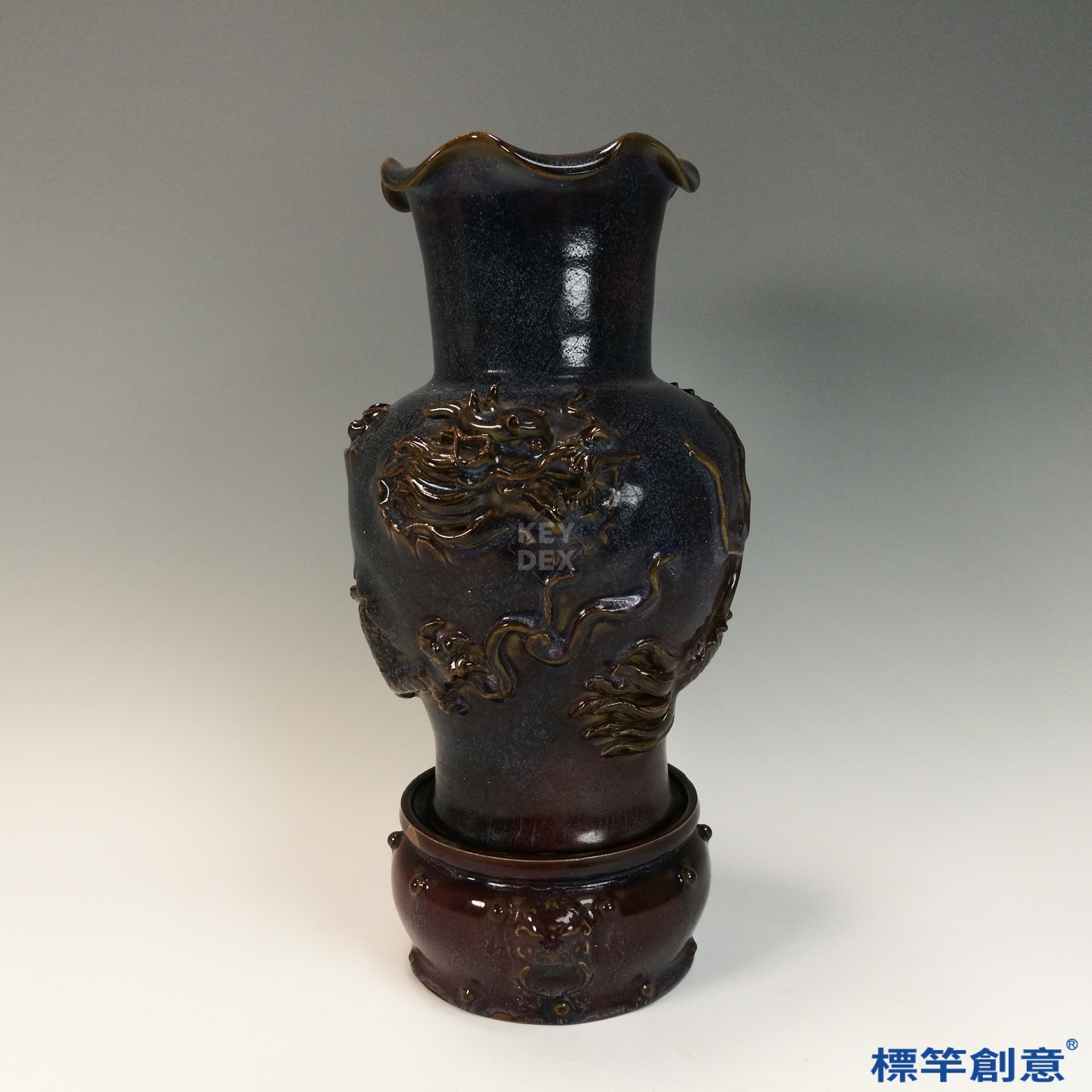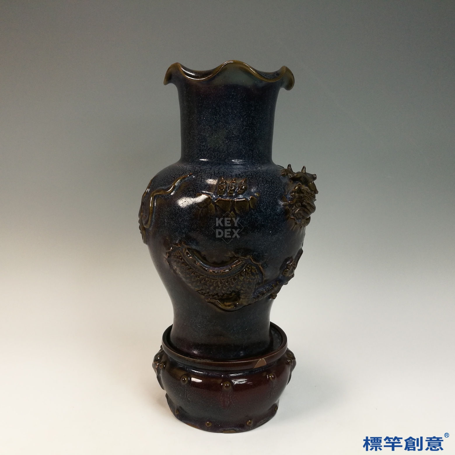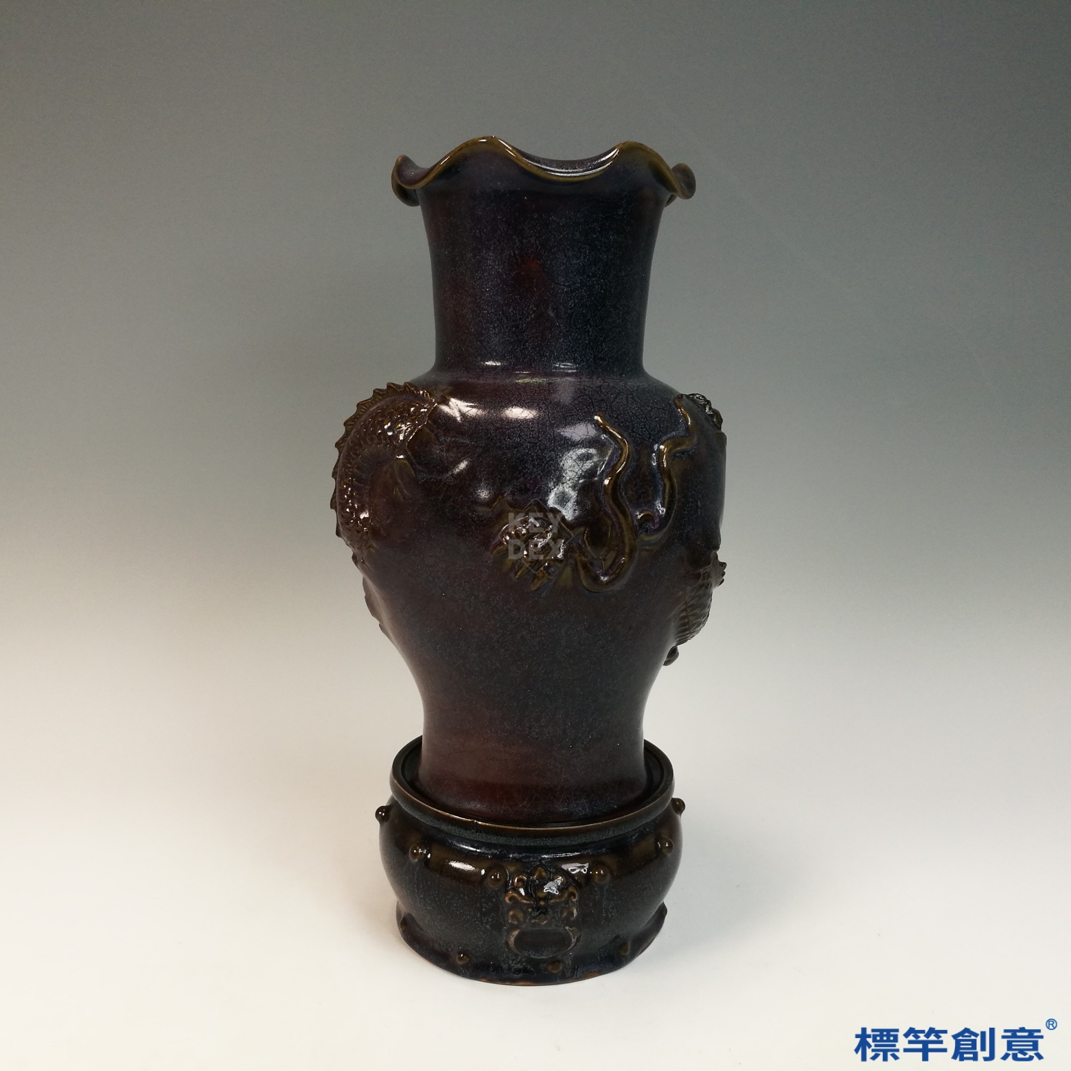 以多道疊施釉層工藝結合高溫窯變技術,一次燒成。成型後於瓶身以模印及浮雕方式添塑龍紋,附座另燒,組合精準。