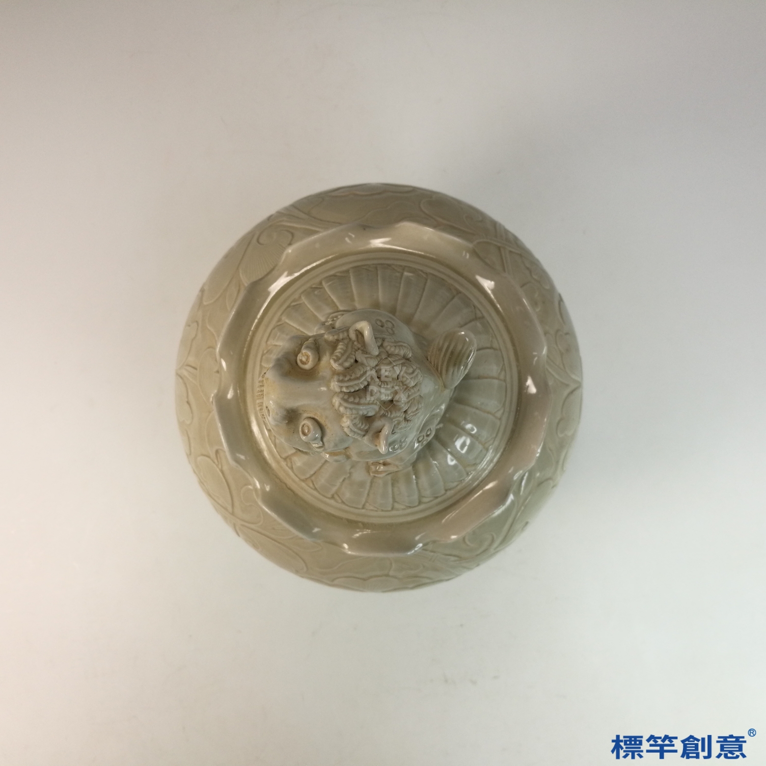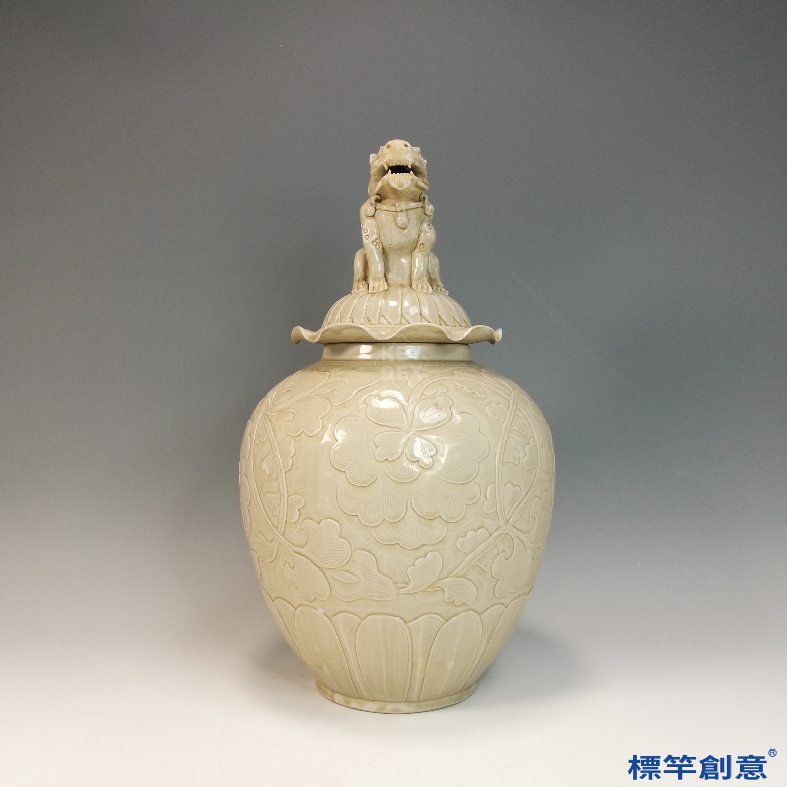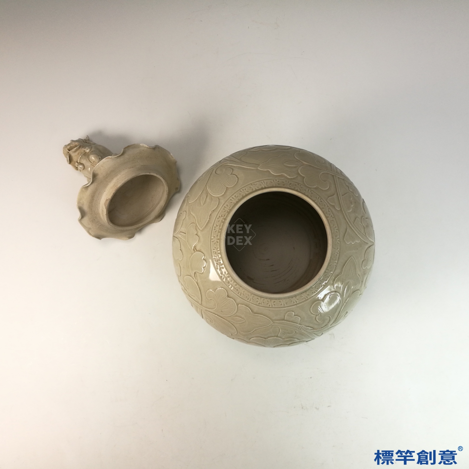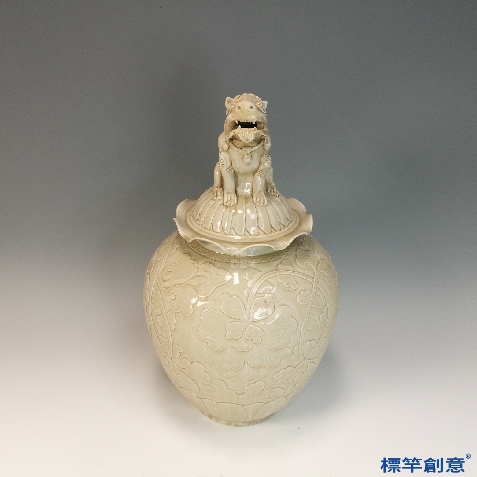 GB177 北宋定窯米白釉刻纏枝花獅鈕蓋罐