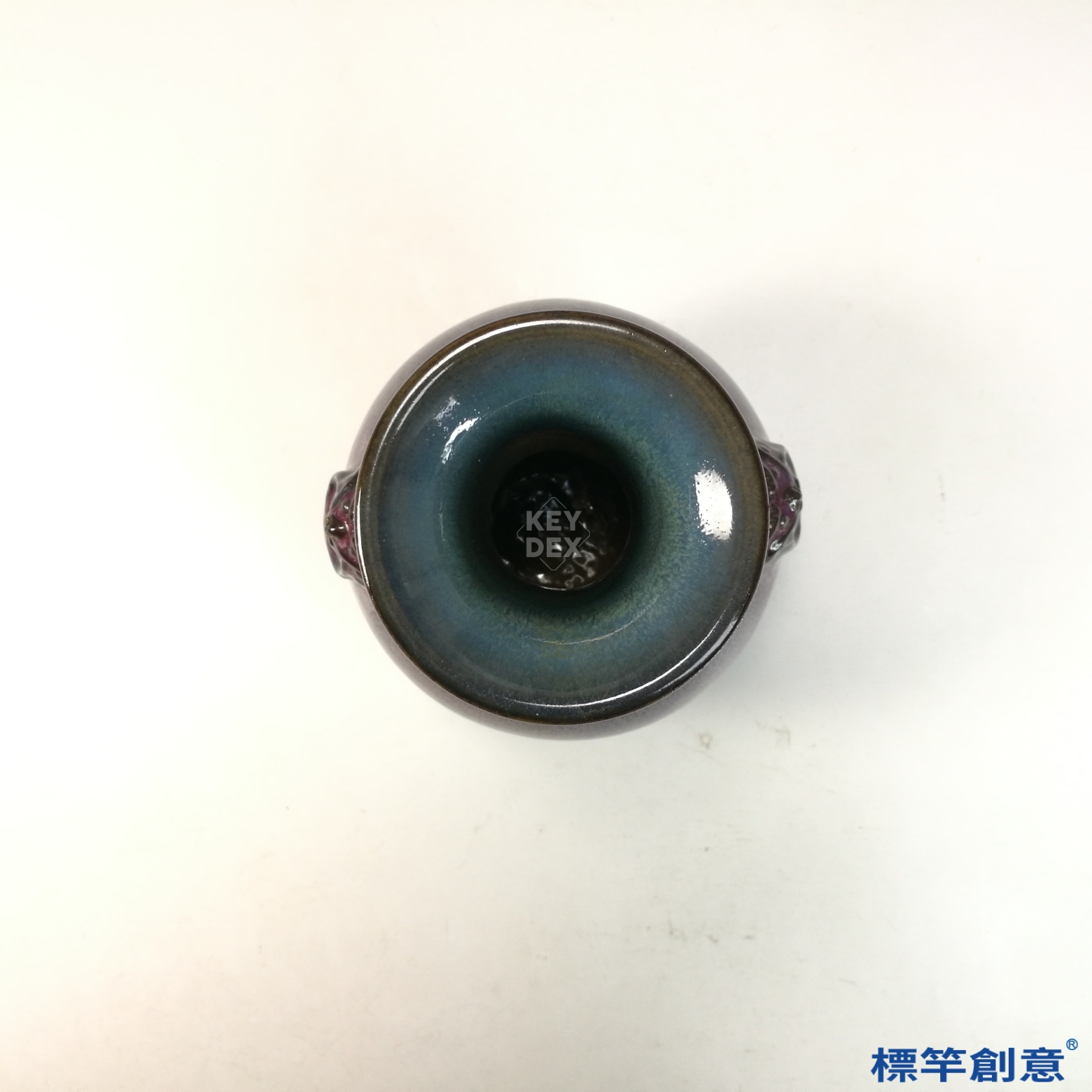 全器施紫紅釉,色澤瑰麗,釉面自然流動,隱含藍斑,形成典型鈞窯窯變效果。獸首雙耳塑作生動,細節處理精緻,口緣與足部釉薄處略泛鐵褐,屬高溫還原氣氛下自然呈現。