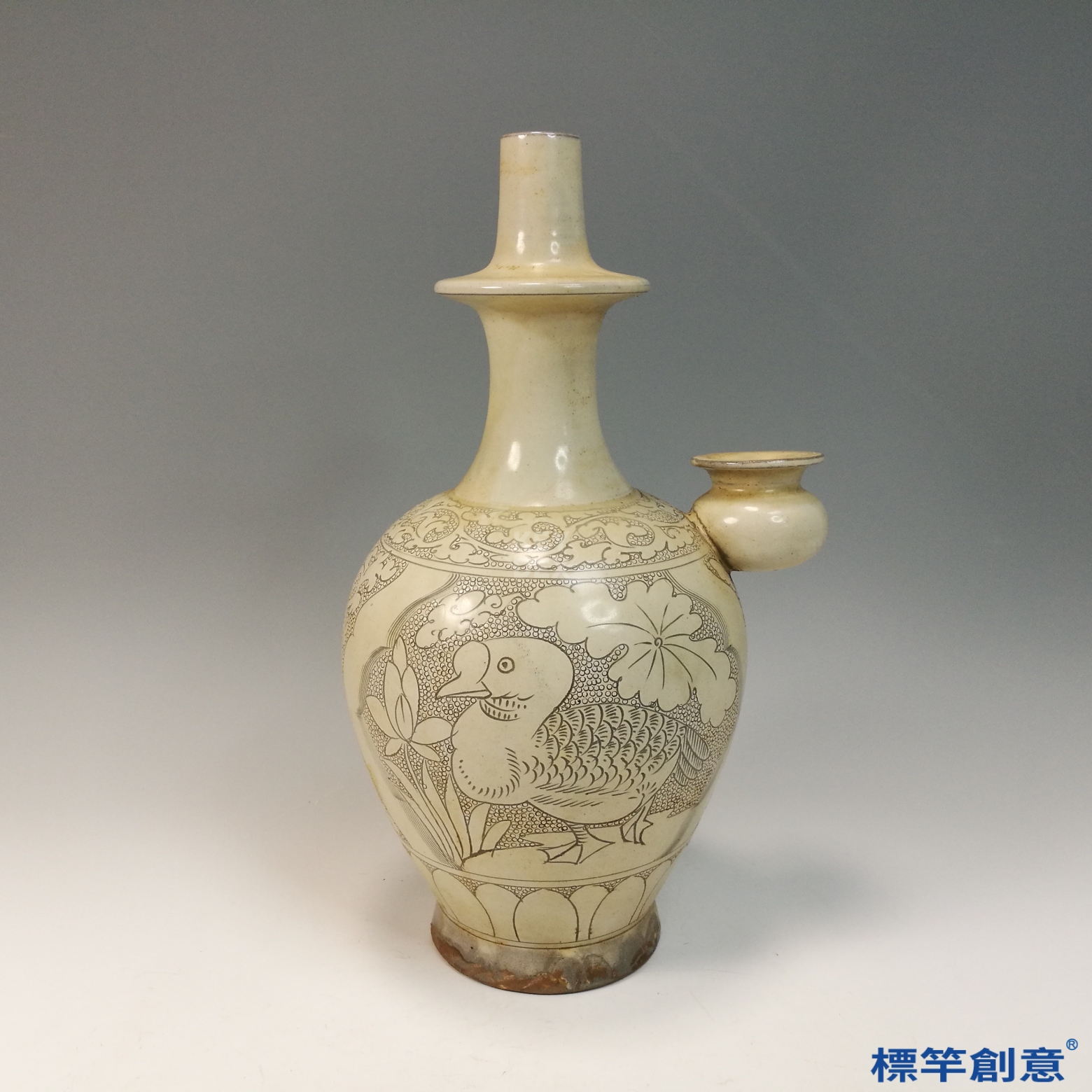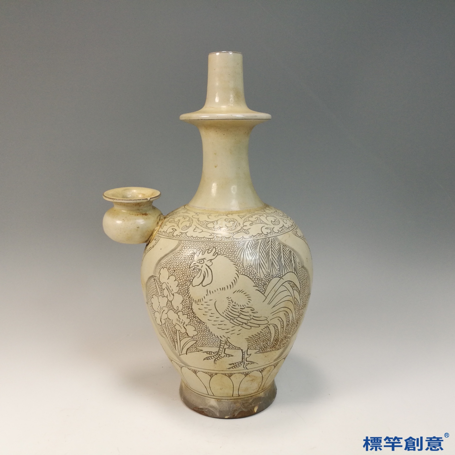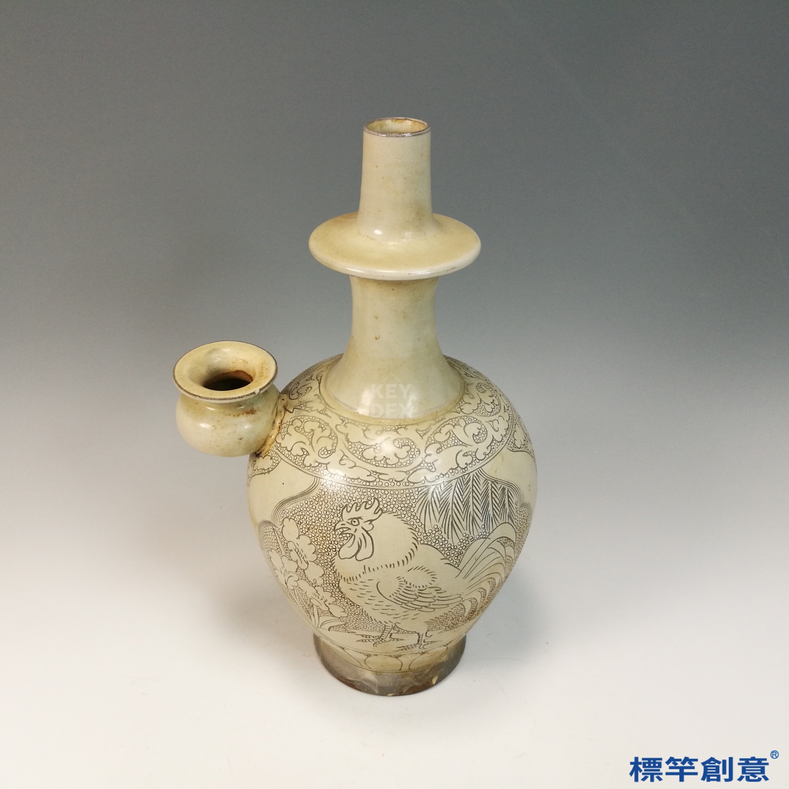 GB184 北宋磁州窯米白釉珍珠地刻雞紋佛教淨瓶