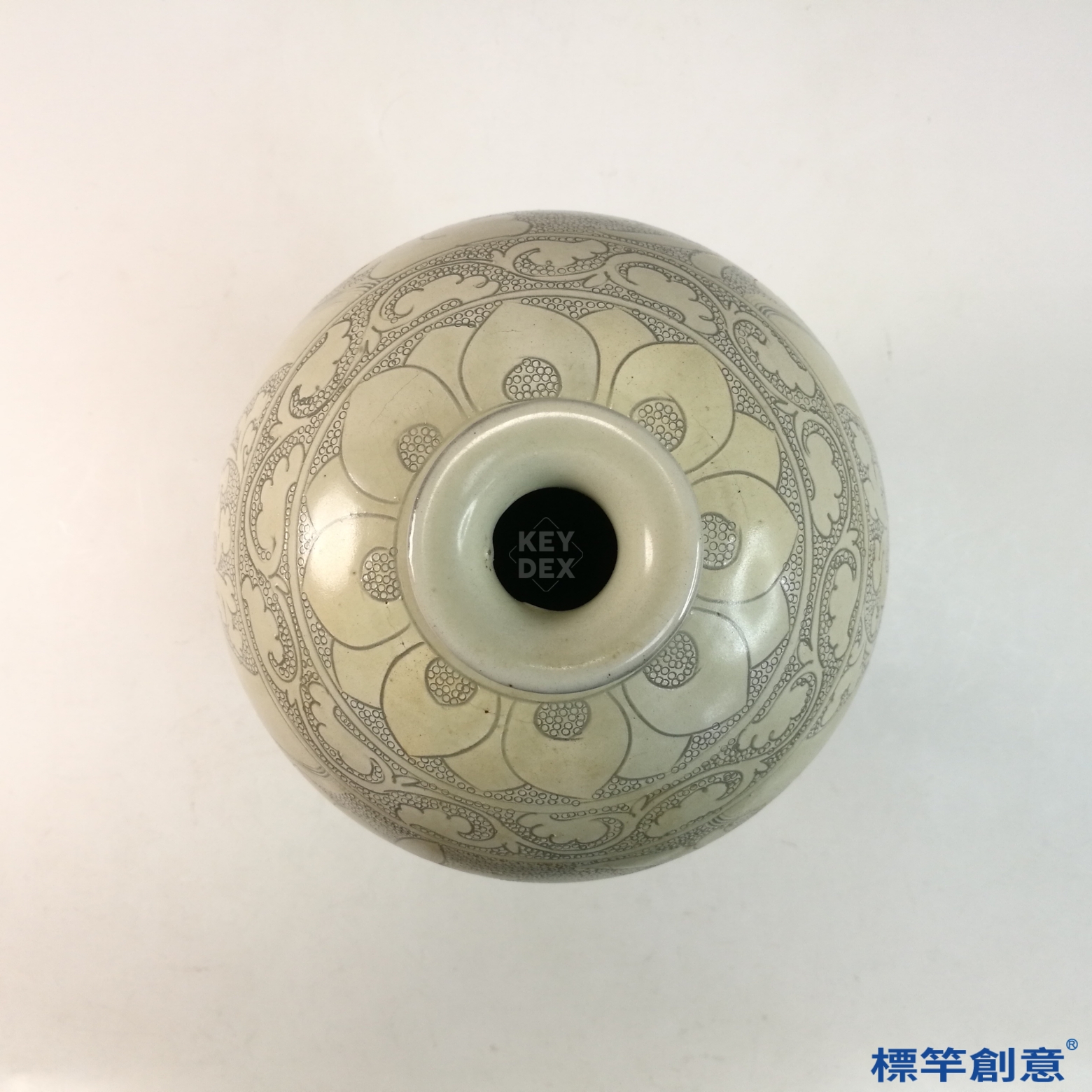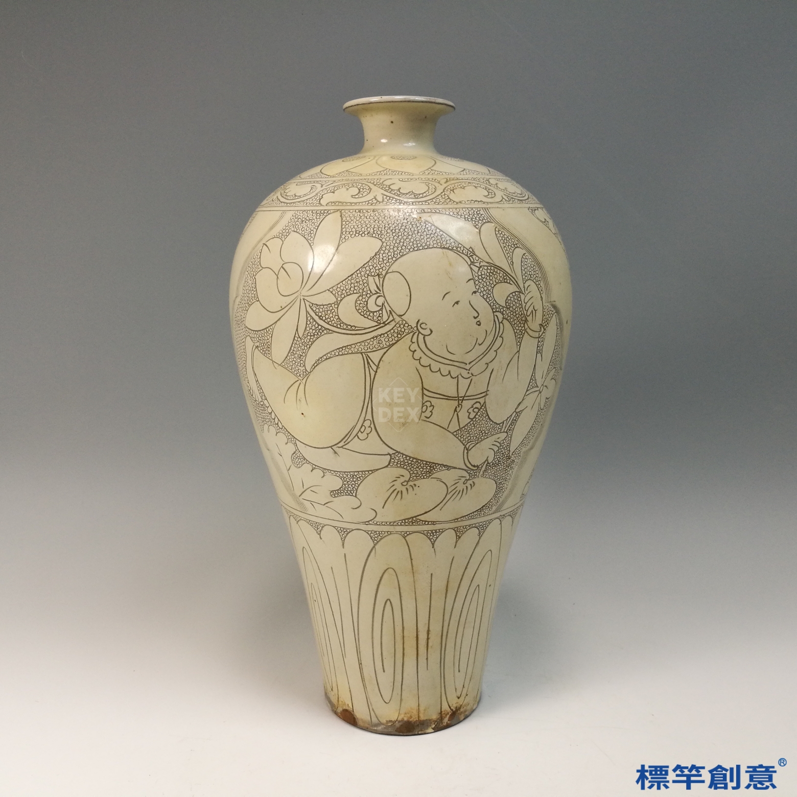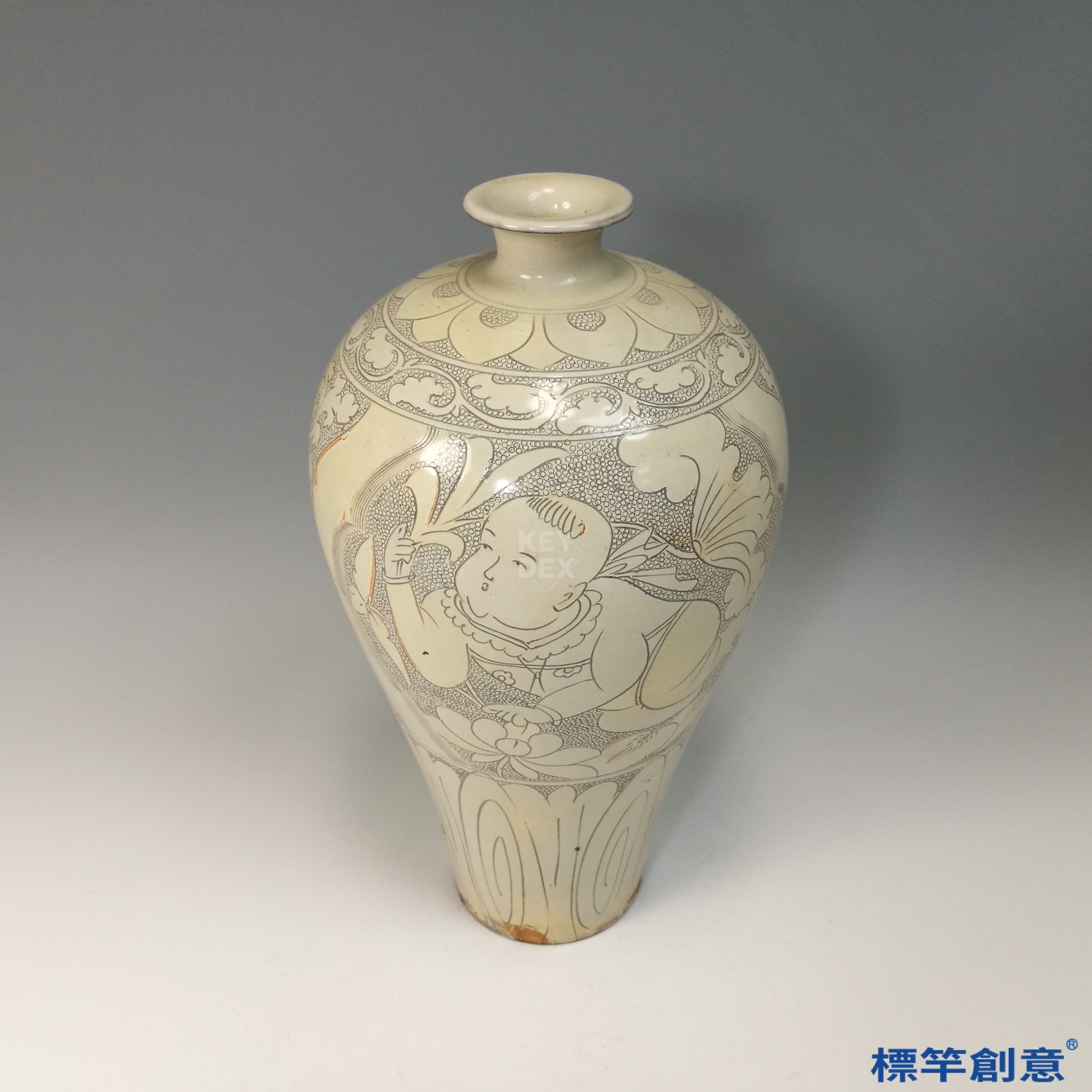 全器施米白釉,釉質溫潤柔和,呈微黃色調。主體以典型「珍珠地」技法為底襯,瓶腹刻劃一童子抱蓮,線條流暢,構圖生動,背景細密雕點,層次分明,典型磁州窯風格。