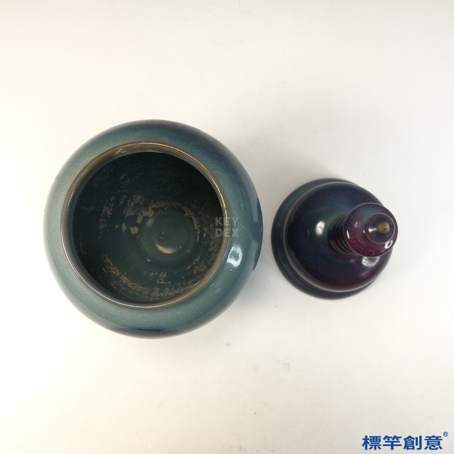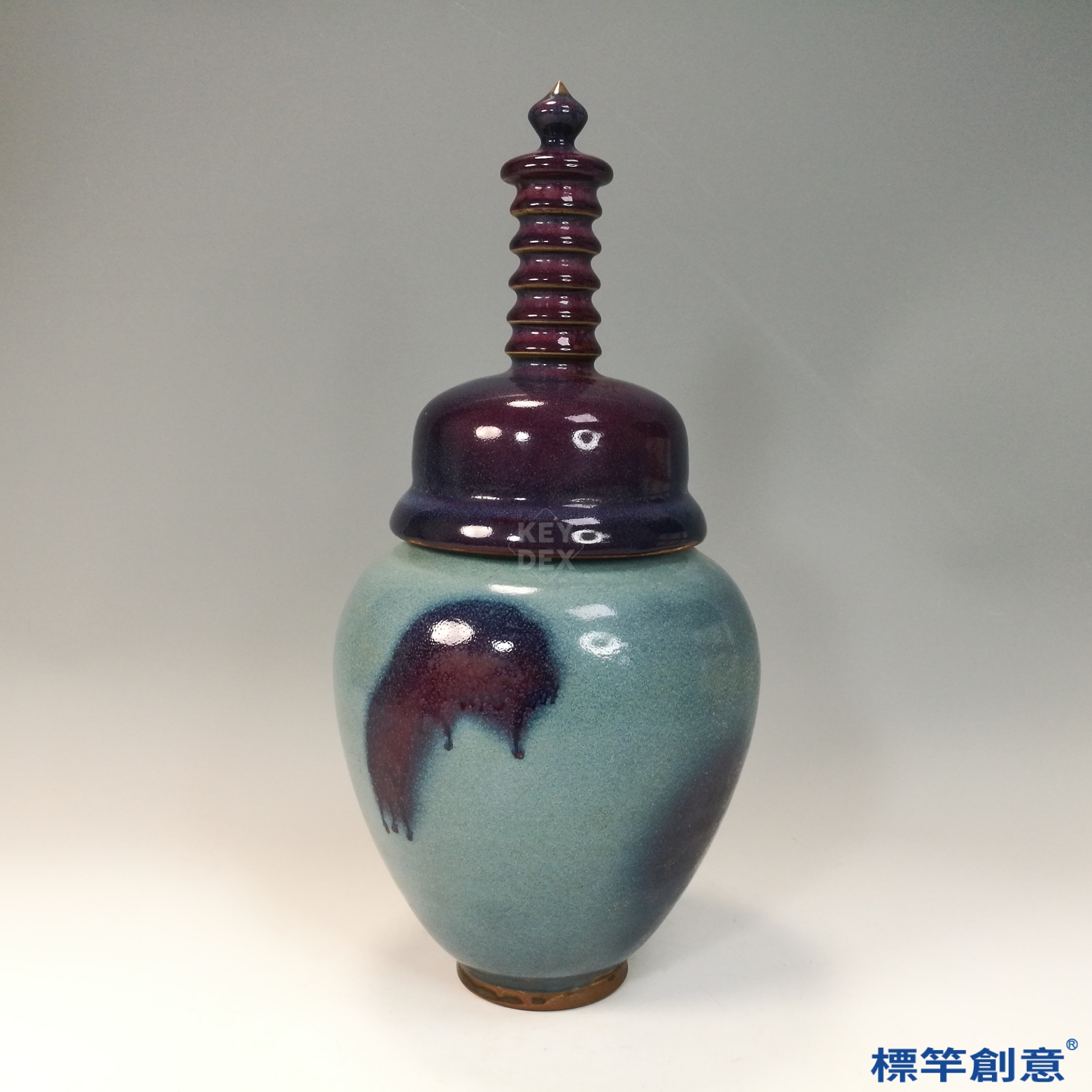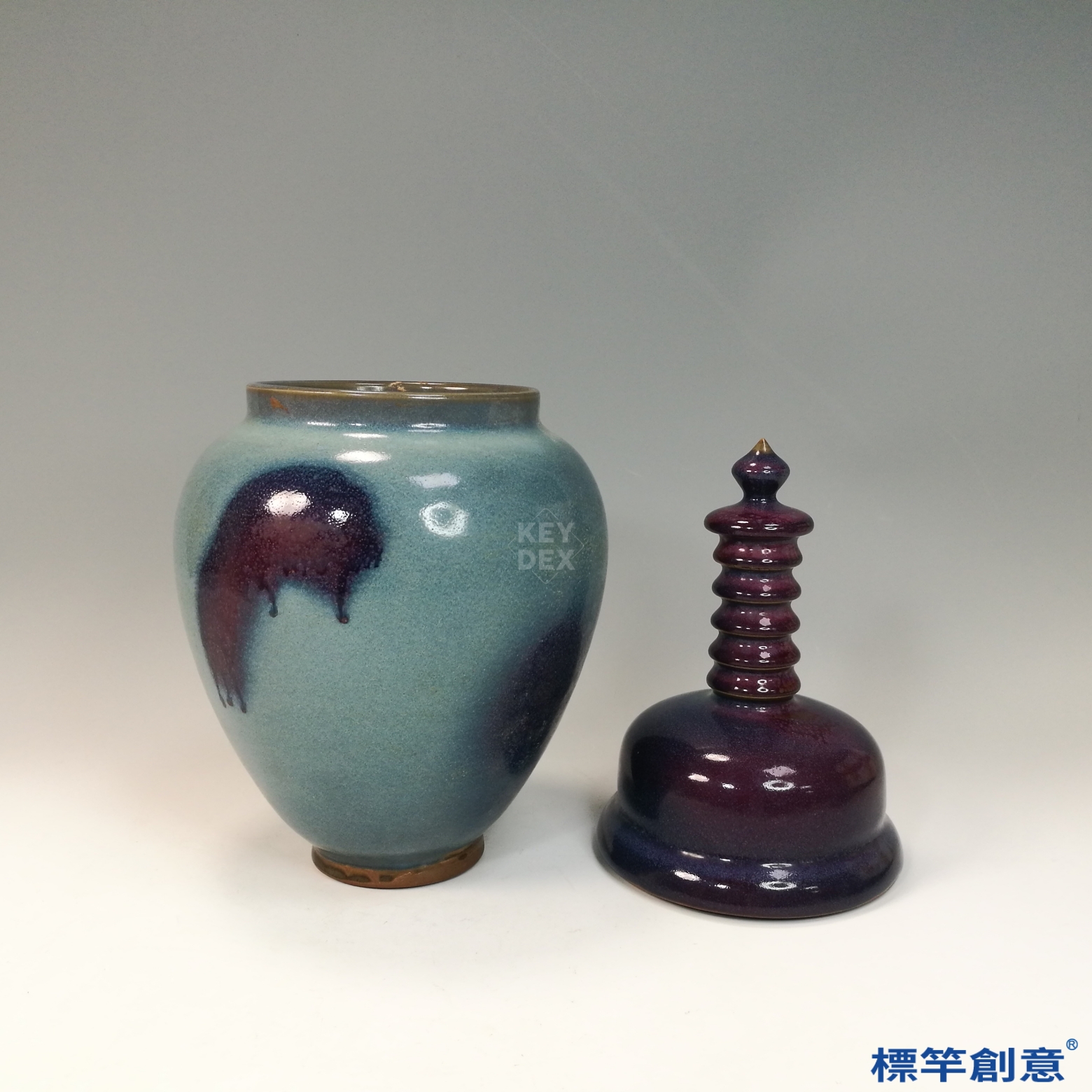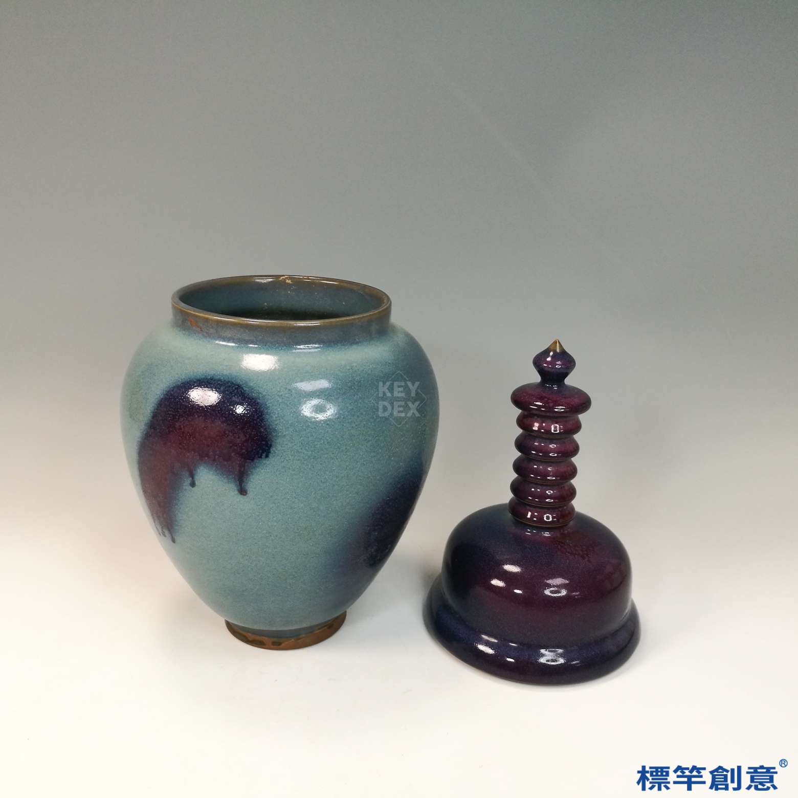 通體施天青釉,釉色潤澤柔和,並自然呈現不規則紫紅斑塊,為典型「窯變」效果。器蓋與罐身過渡自然,蓋下設凹口套合,底足露胎呈鐵褐色,胎體細膩堅實。