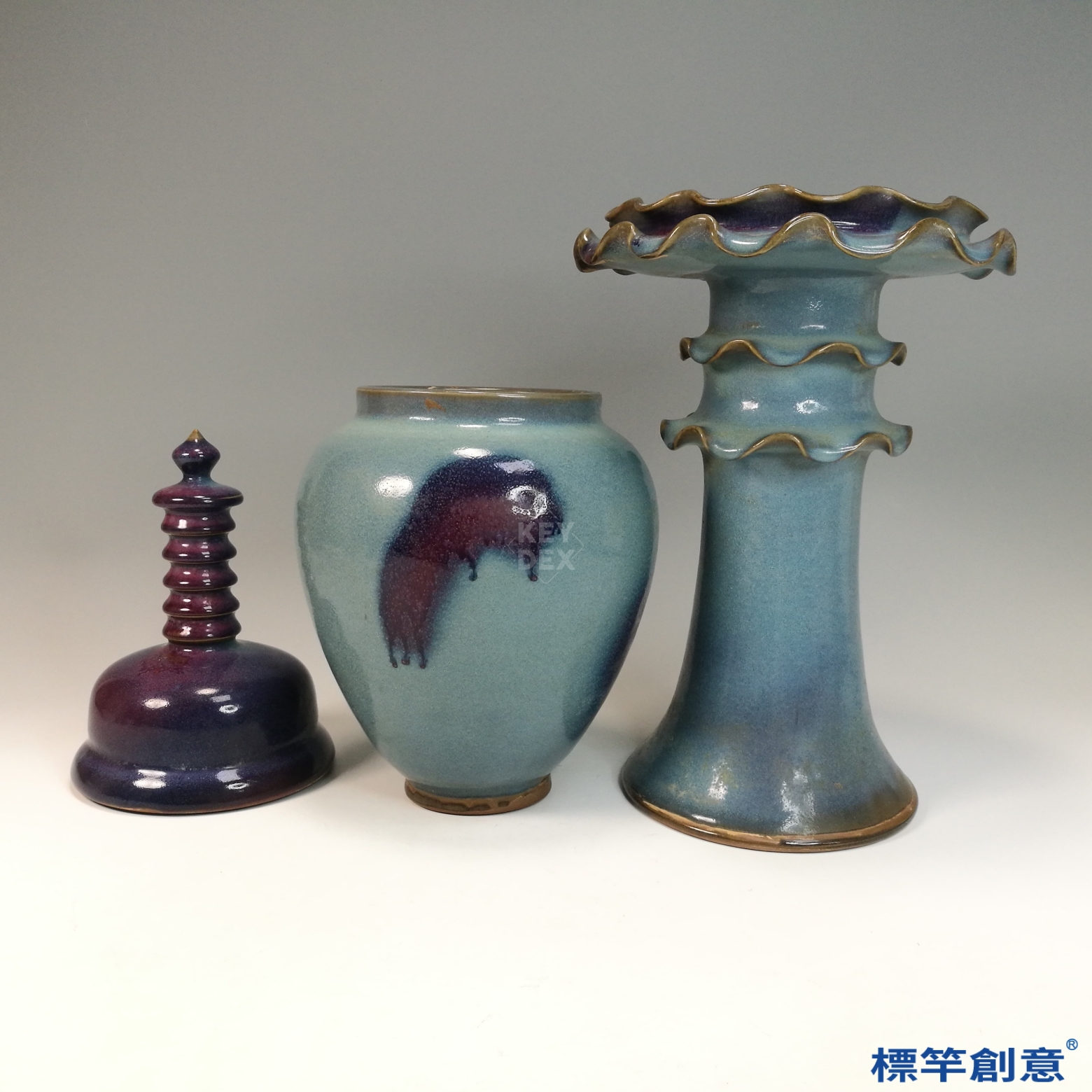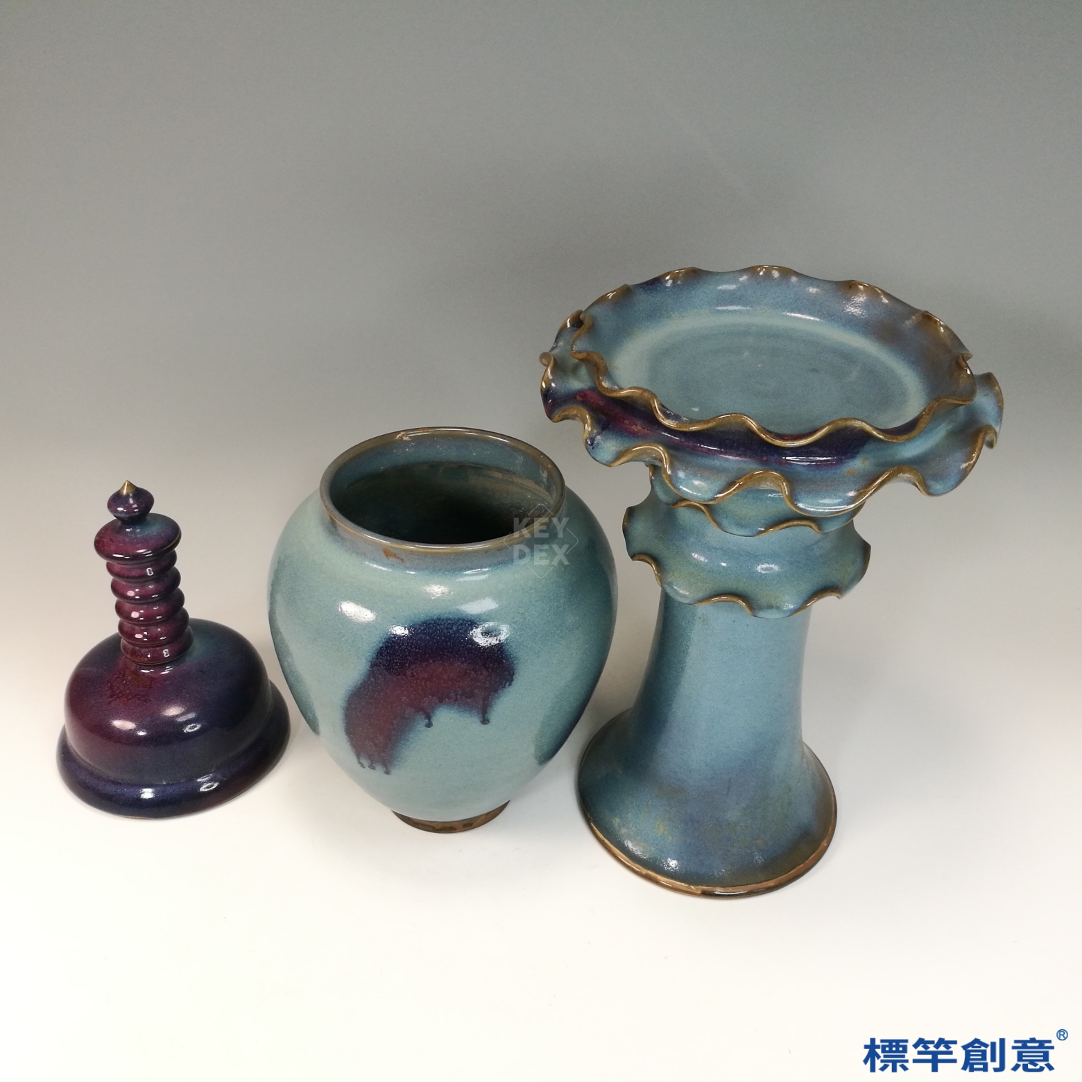 以高嶺土胎體成型後,施以含銅與鈷的變釉,在高溫還原氣氛中燒製,燒成溫度約攝氏1250度,釉面自然形成紫紅與天青色斑塊。