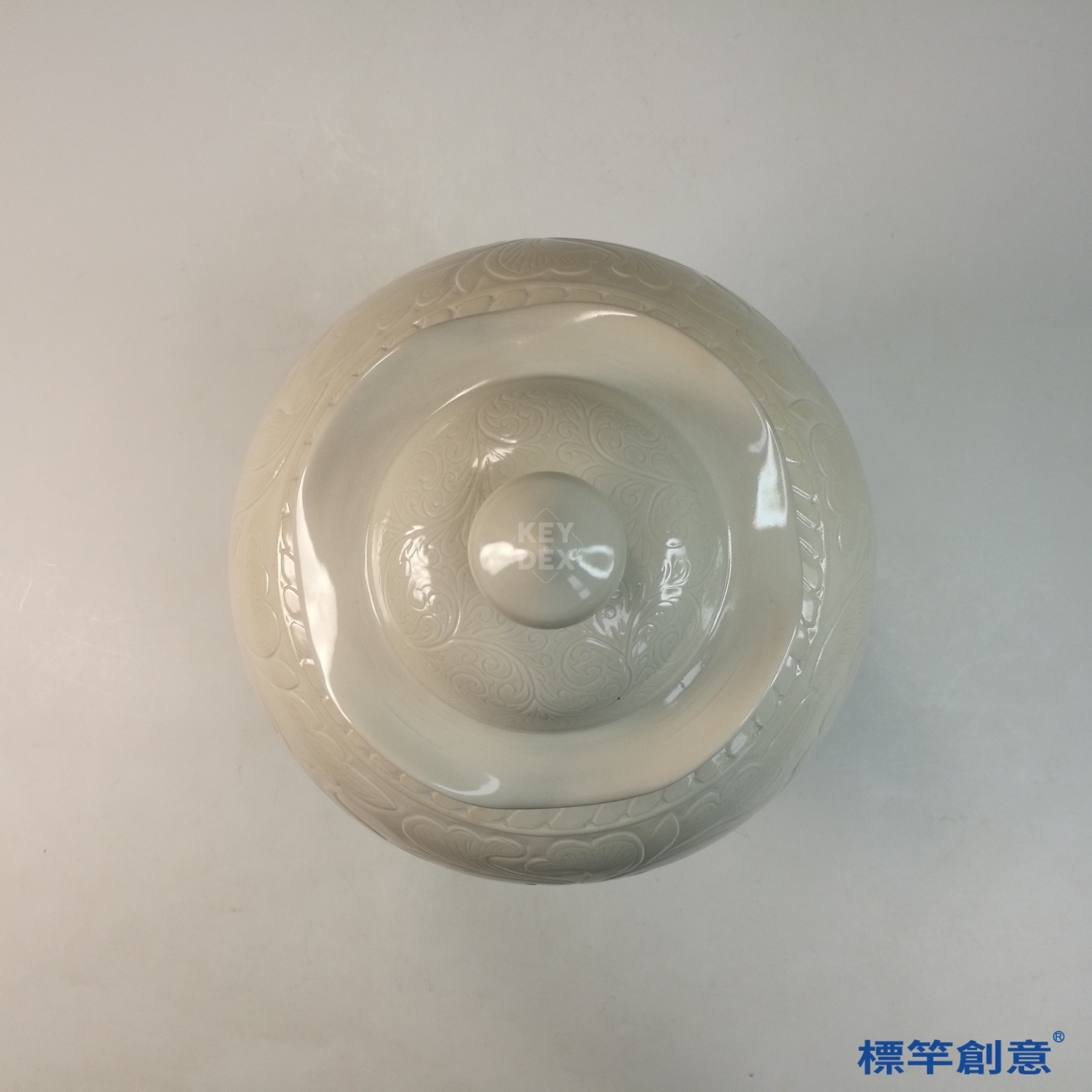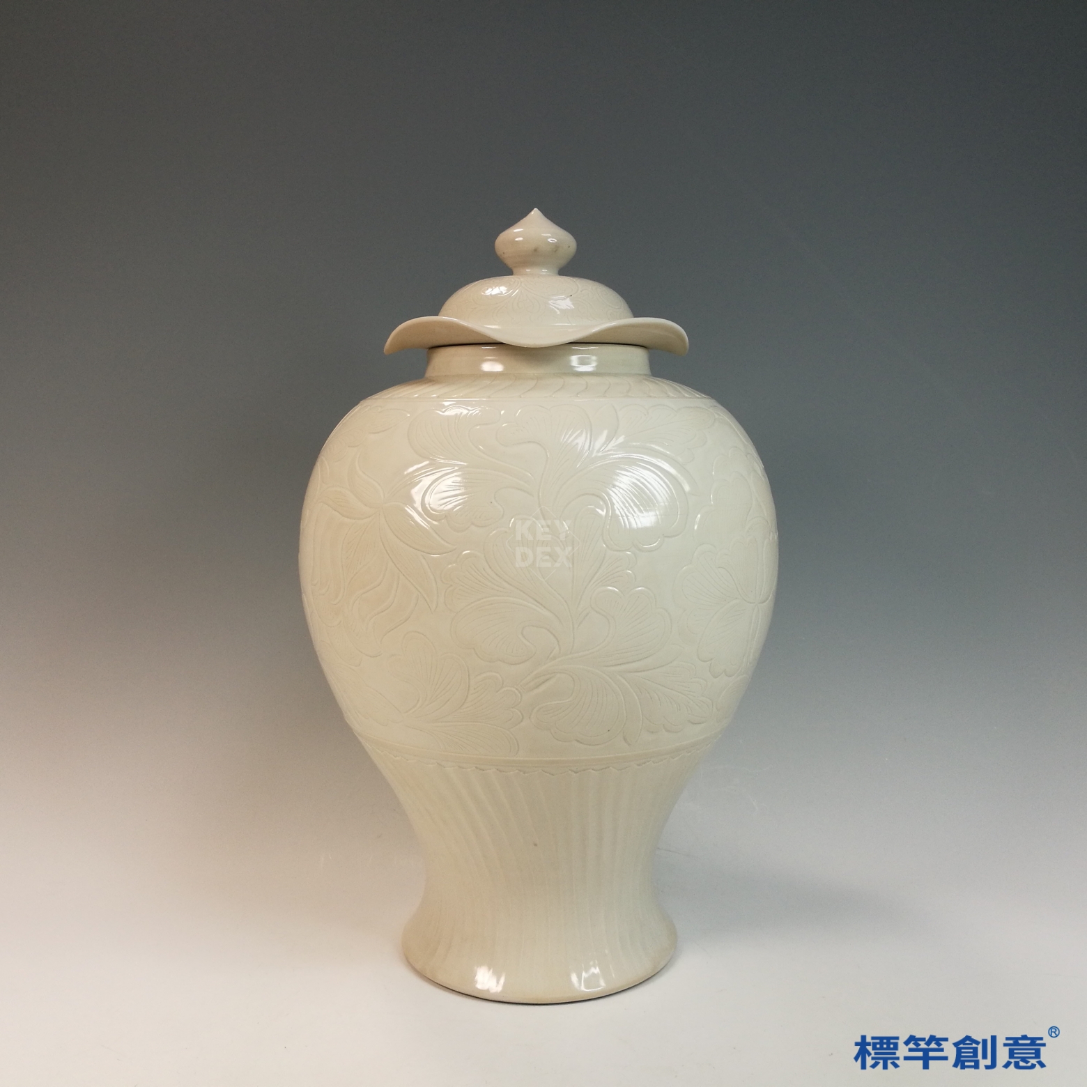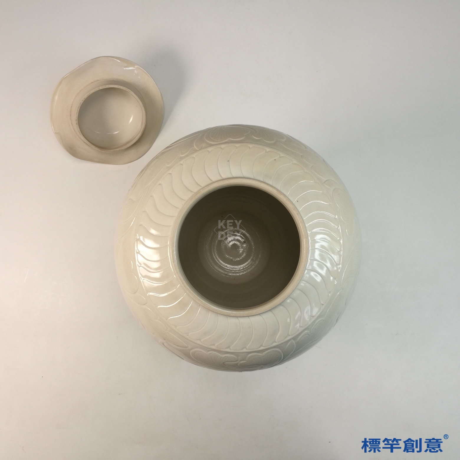 GB194 北宋定窯白釉剔刻牡丹紋荷葉蓋罐