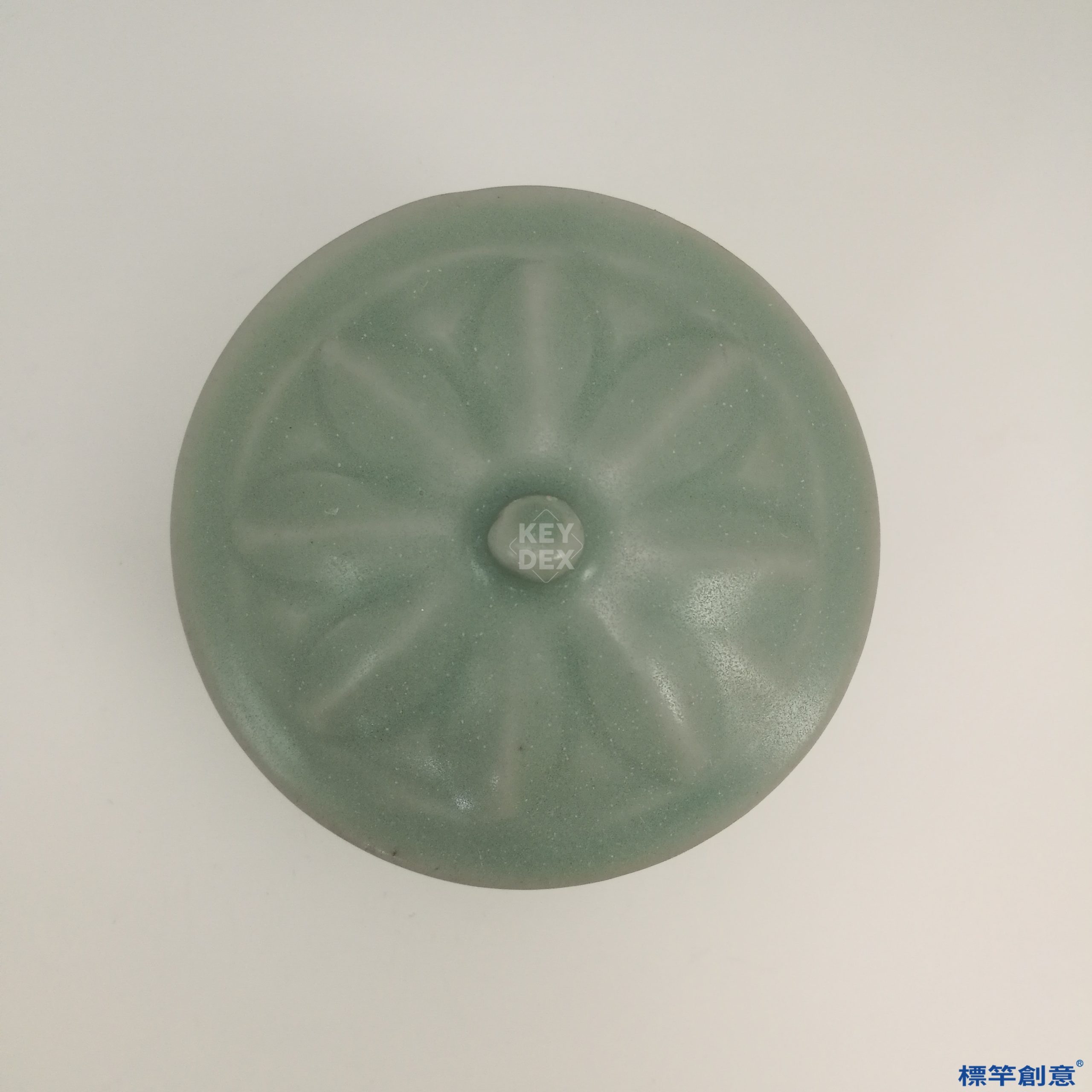通體施粉青釉,釉質潤澤柔和,呈現玉質般的溫潤光澤,蓋與杯身皆刻飾規整蓮瓣紋。胎體緻密細白,蓋鈕圓潤,工藝嚴謹。