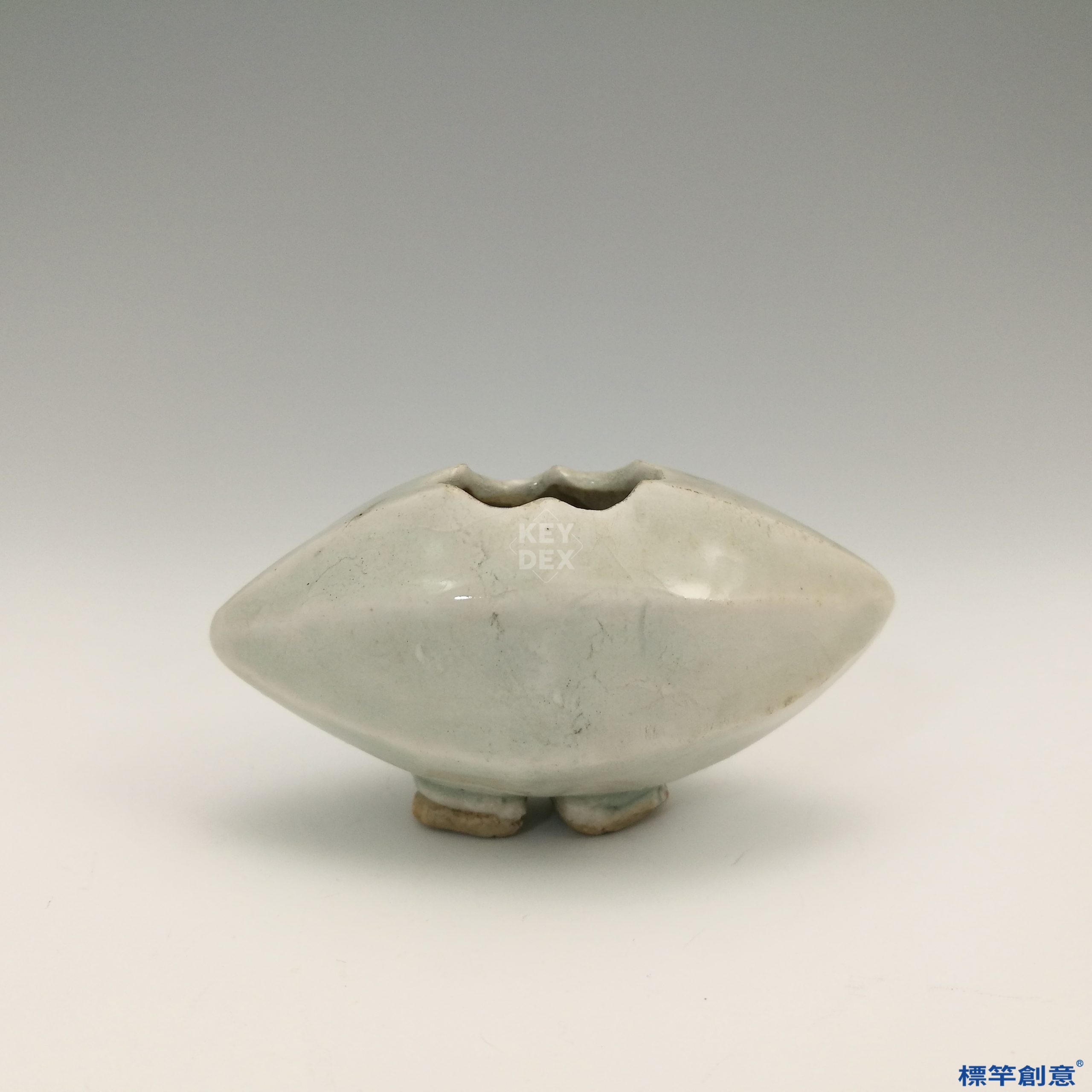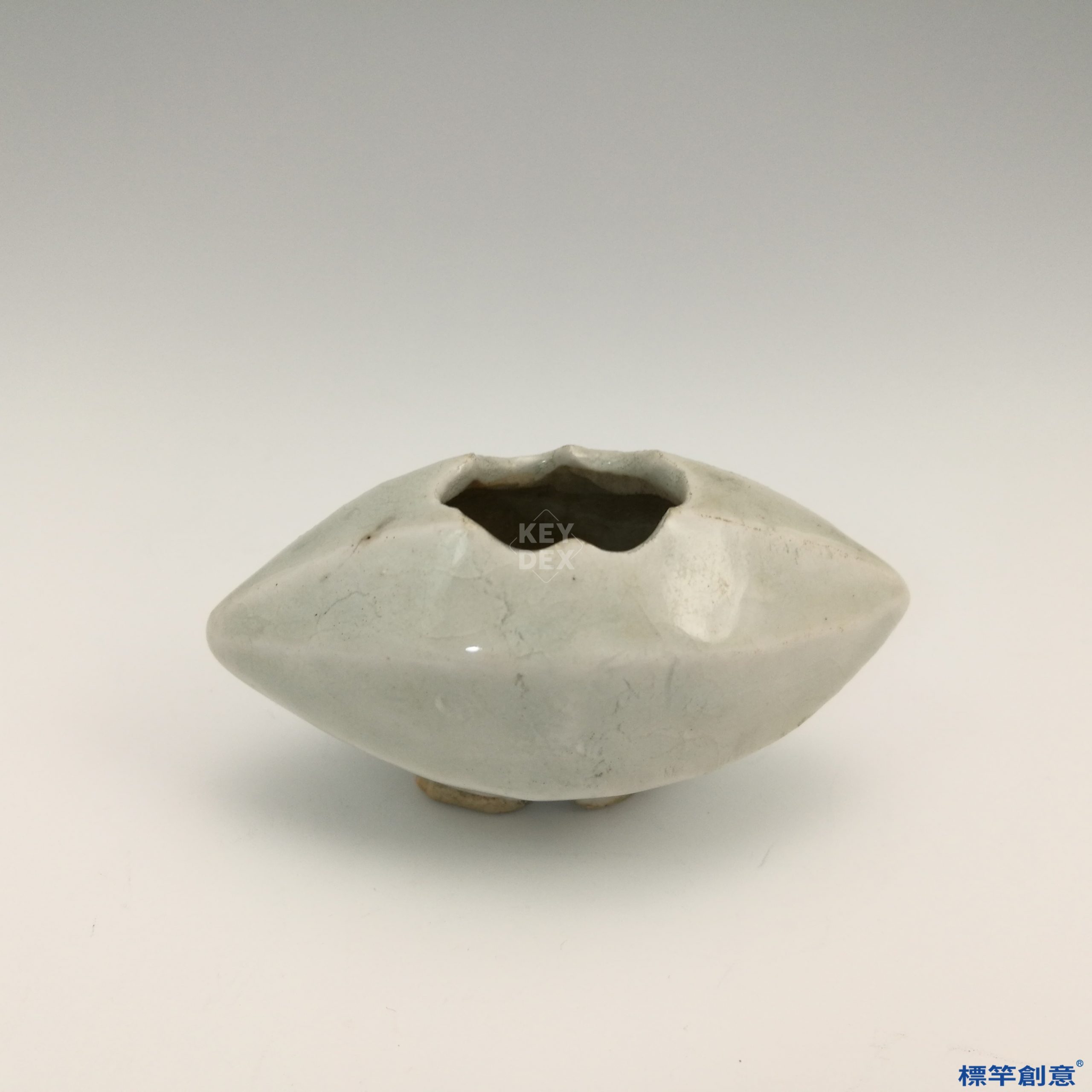 通體施青白釉,釉色淡雅,透明潤澤,釉面光滑而有玻璃質感。器形擬稻穀之姿,象徵豐收與吉祥,亦有生活化的設計感。雙足簡練,具穩定支撐作用。
