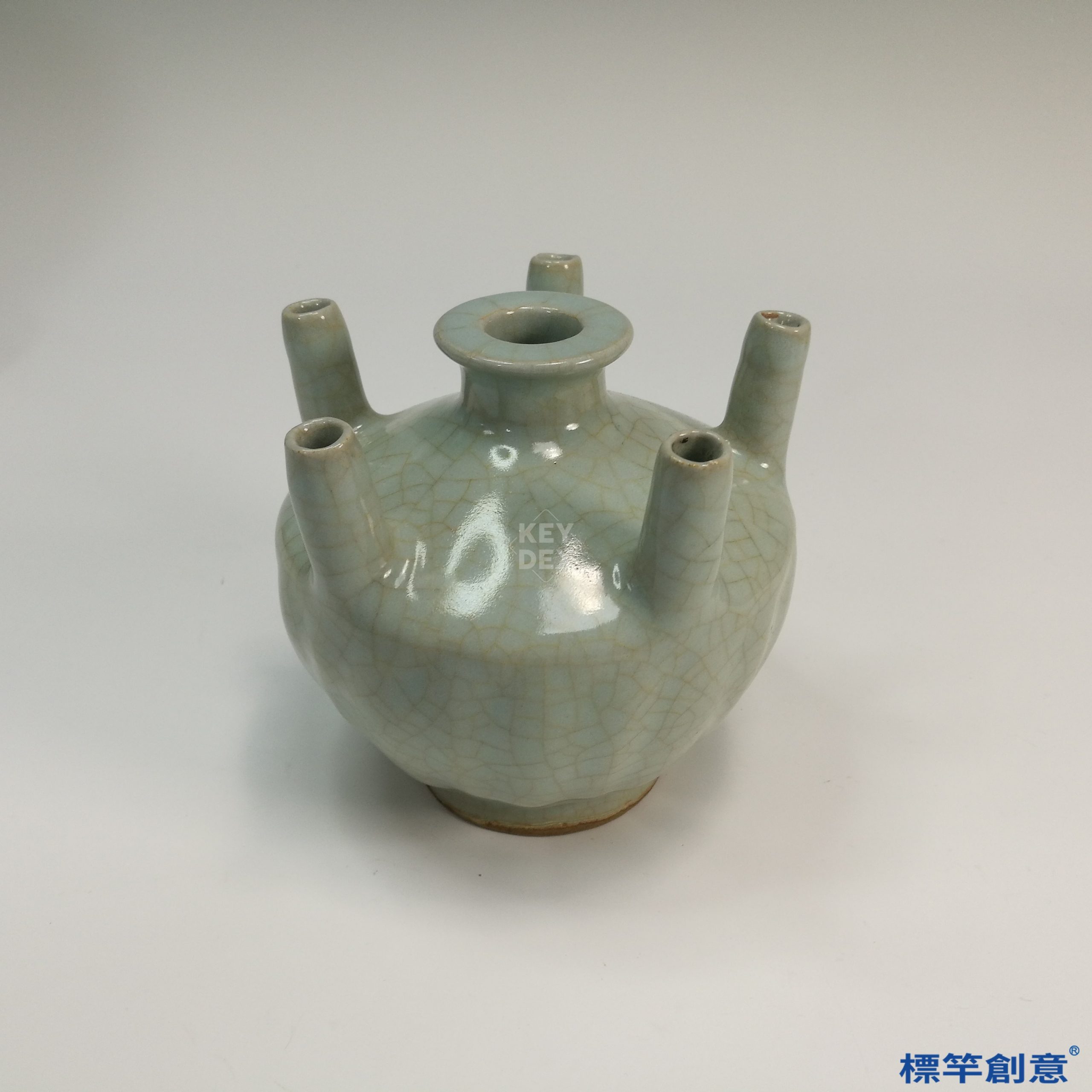 五管瓶屬少見器式,兼具宗教意涵與審美價值,代表南宋佛教文化與青瓷工藝交融之成就。此類器物常見於寺廟遺址或皇家道場,傳世數量稀少。