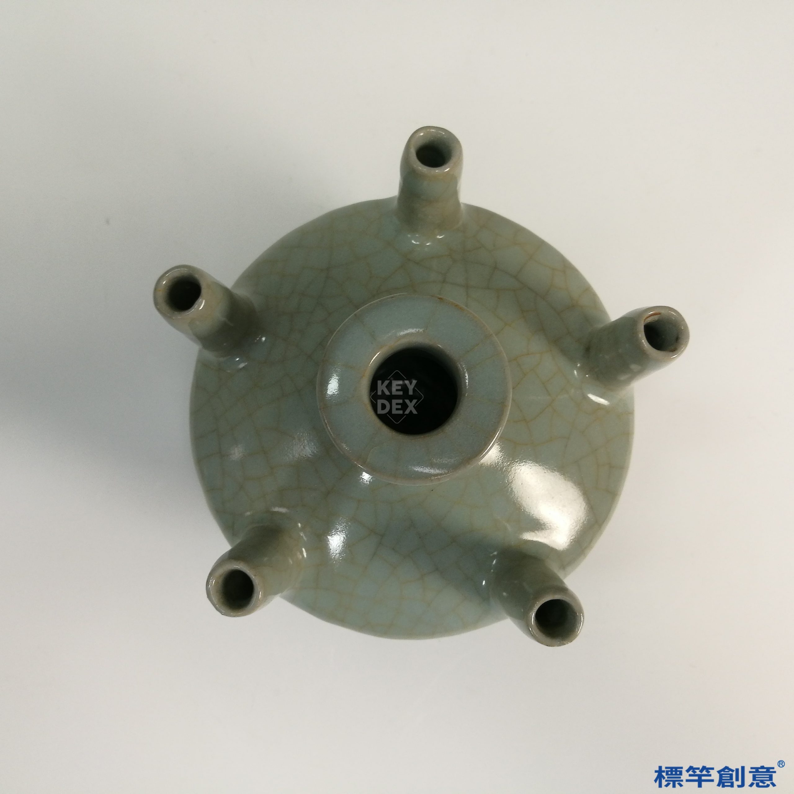通體施青釉,釉色呈淡青微粉,溫潤含蓄,釉層厚潤且開有自然細密開片。肩部與腹部以刻劃技法裝飾蓮瓣紋,線條工整流暢。五管口沿略有外撇,均為實心貫通,結構嚴謹。