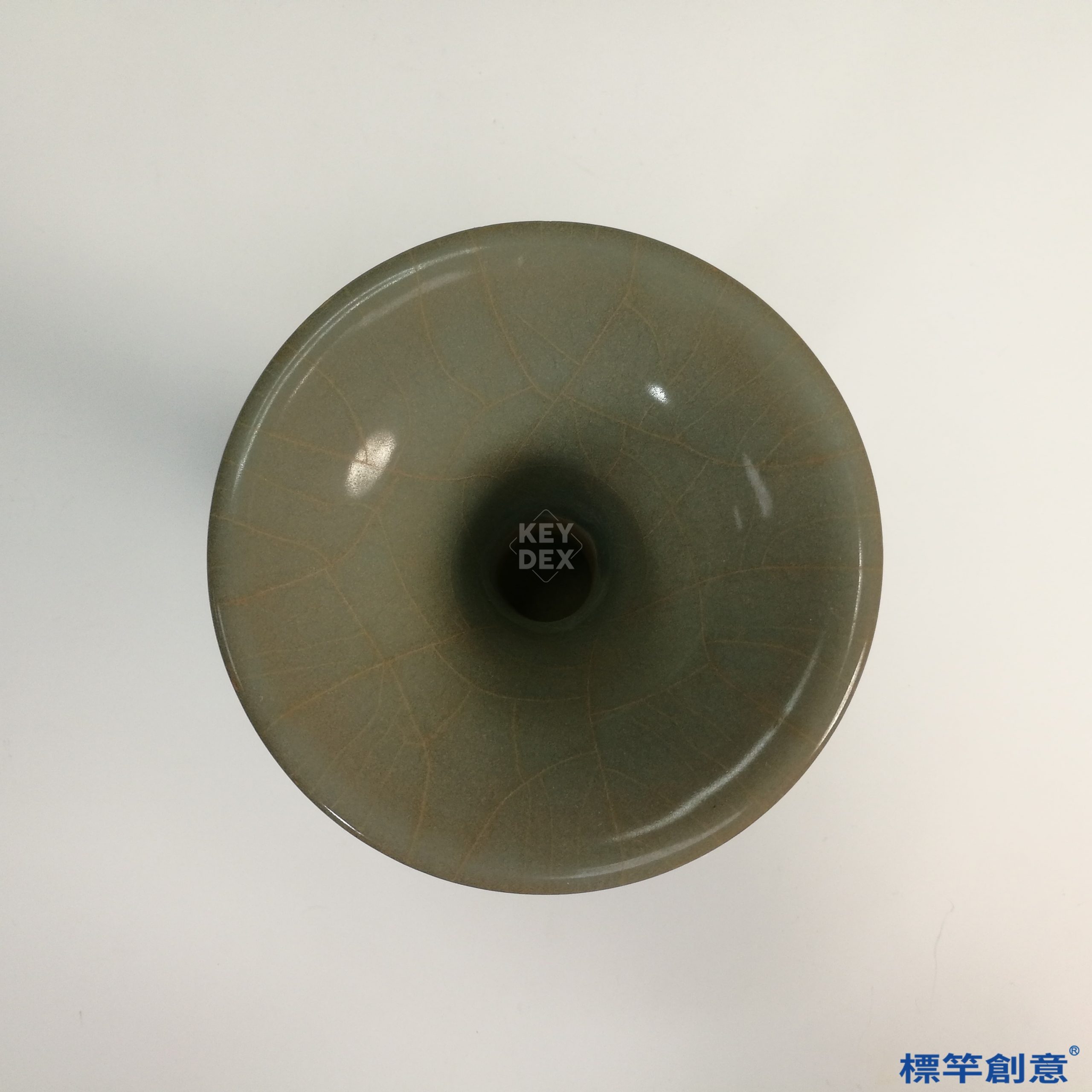 採旋坯成型後修胎,仿照青銅觚比例造形,再施一層厚釉,置於匣缽中還原燒成,形成青釉冰裂紋與溫潤質感。
