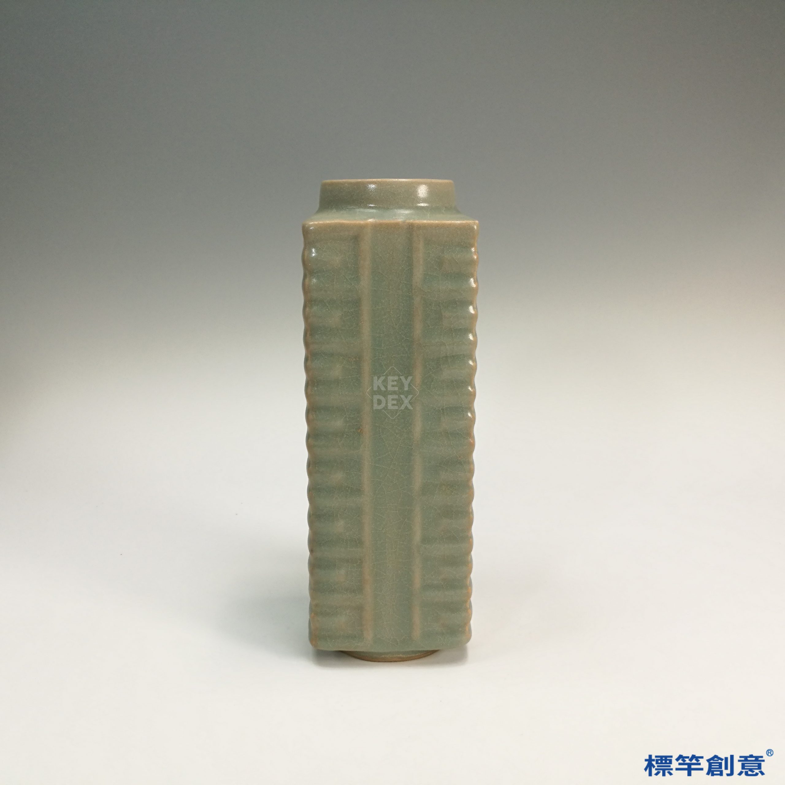 通體施粉青釉,釉面細膩光潤,泛微許青灰,底部露胎呈鐵褐色。器形仿自新石器時代玉琮,為宋代仿古之風的具體展現,雕飾簡約而富層次。