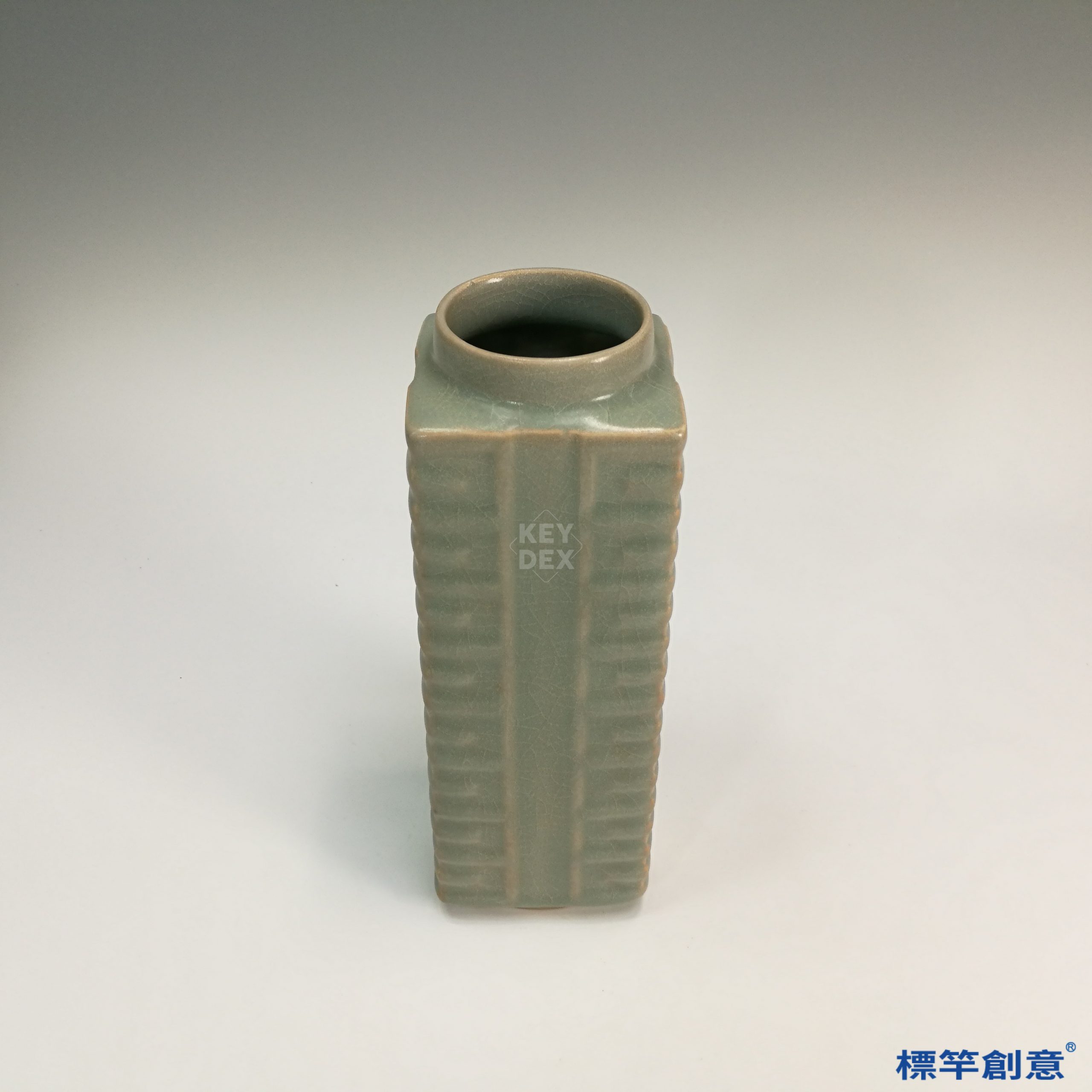 器物以細白瓷土拉坯成形,再經雕刻修整成外方內圓之琮式輪廓,施釉後於還原焰中高溫燒成,釉色柔潤如玉。
