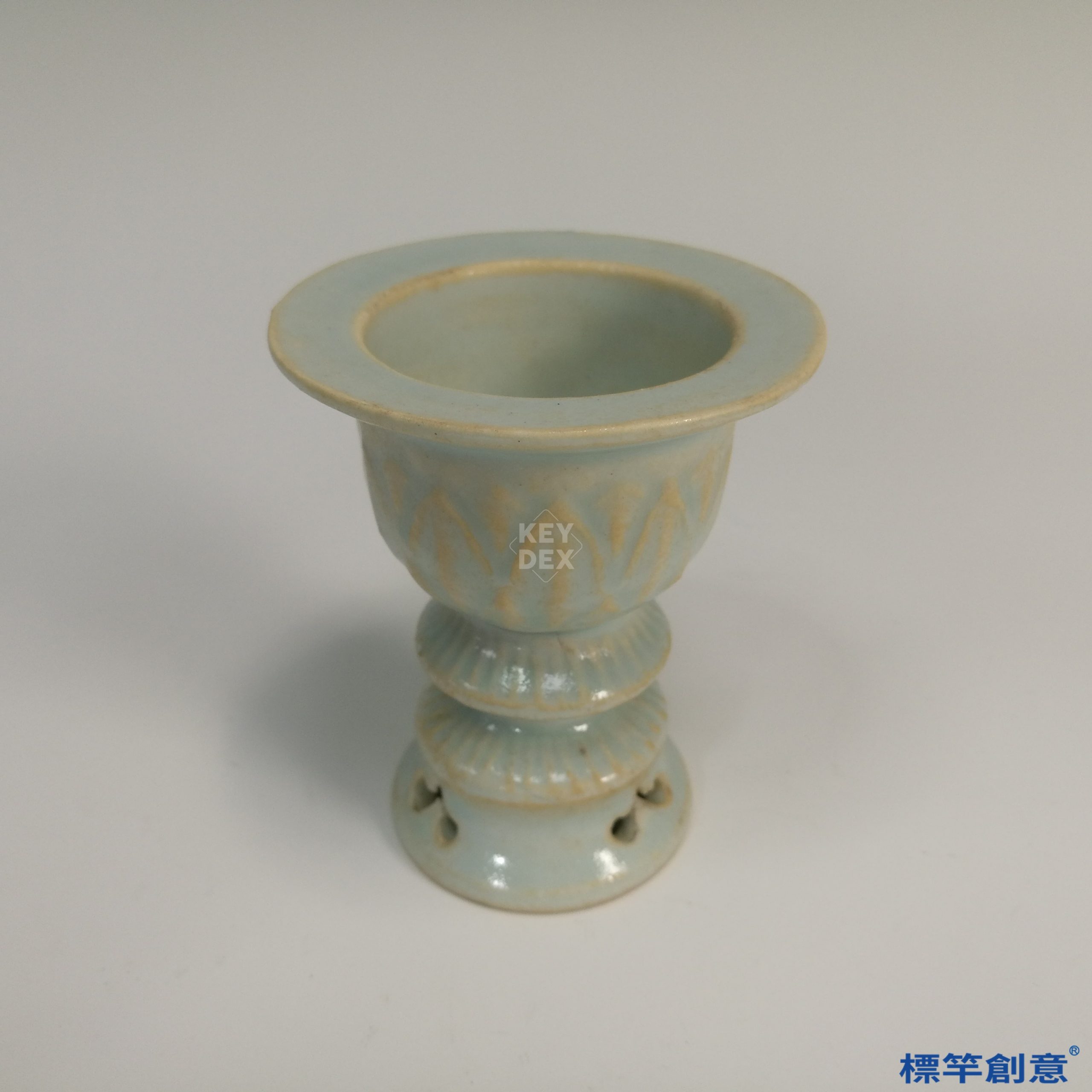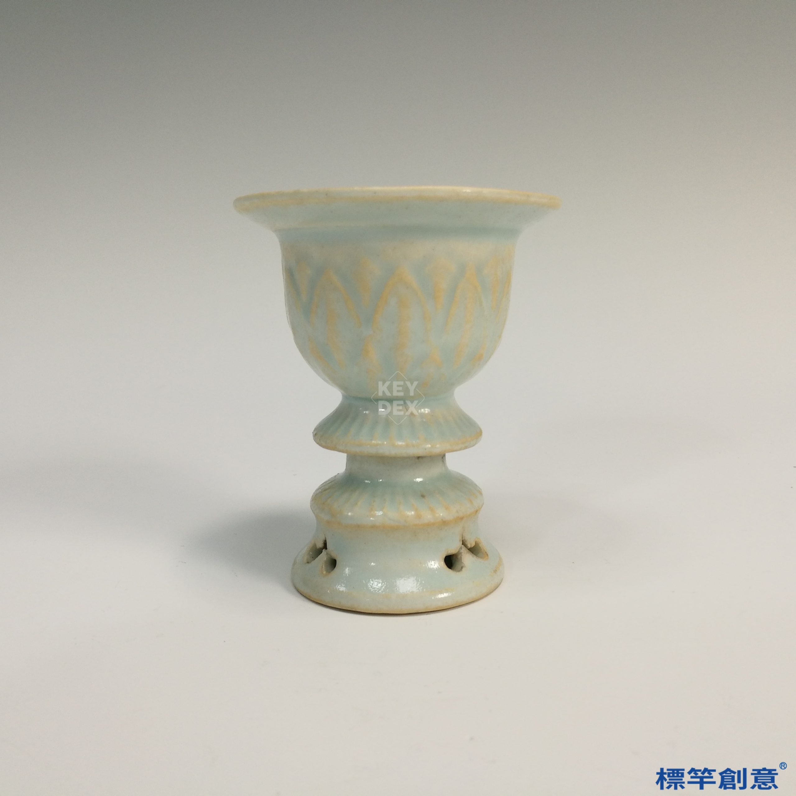 通體施青白釉,釉色溫潤泛微藍,器表以模印蓮瓣紋裝飾,浮雕層次分明。足座底部留有穿孔鏤空,便於通風助燃,結構嚴謹。