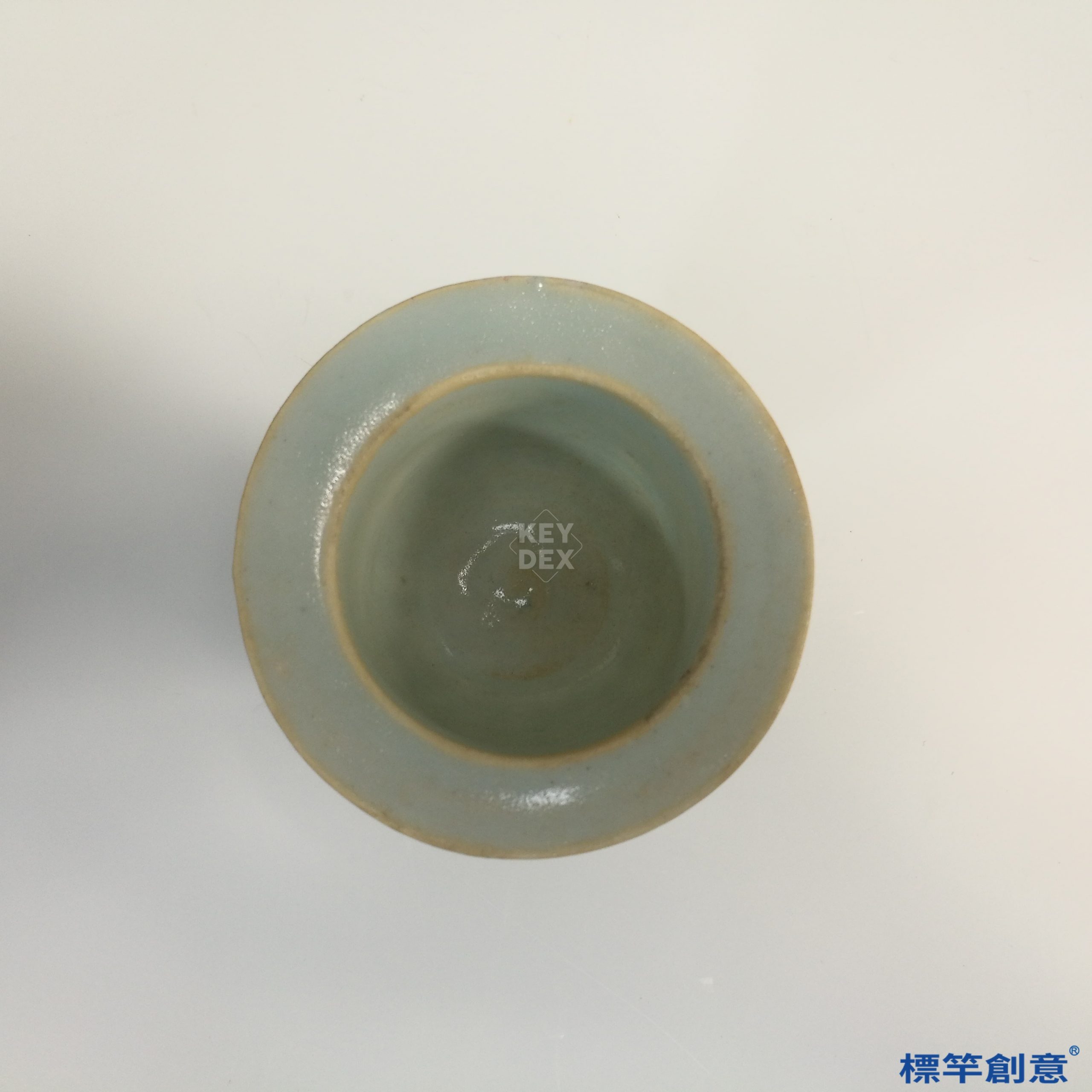 本器高9公分,口徑7公分,呈喇叭口、高足杯式造形。器身收腹,上承敞口,底承寬厚圈足與鏤空式座台,造形挺拔穩重。