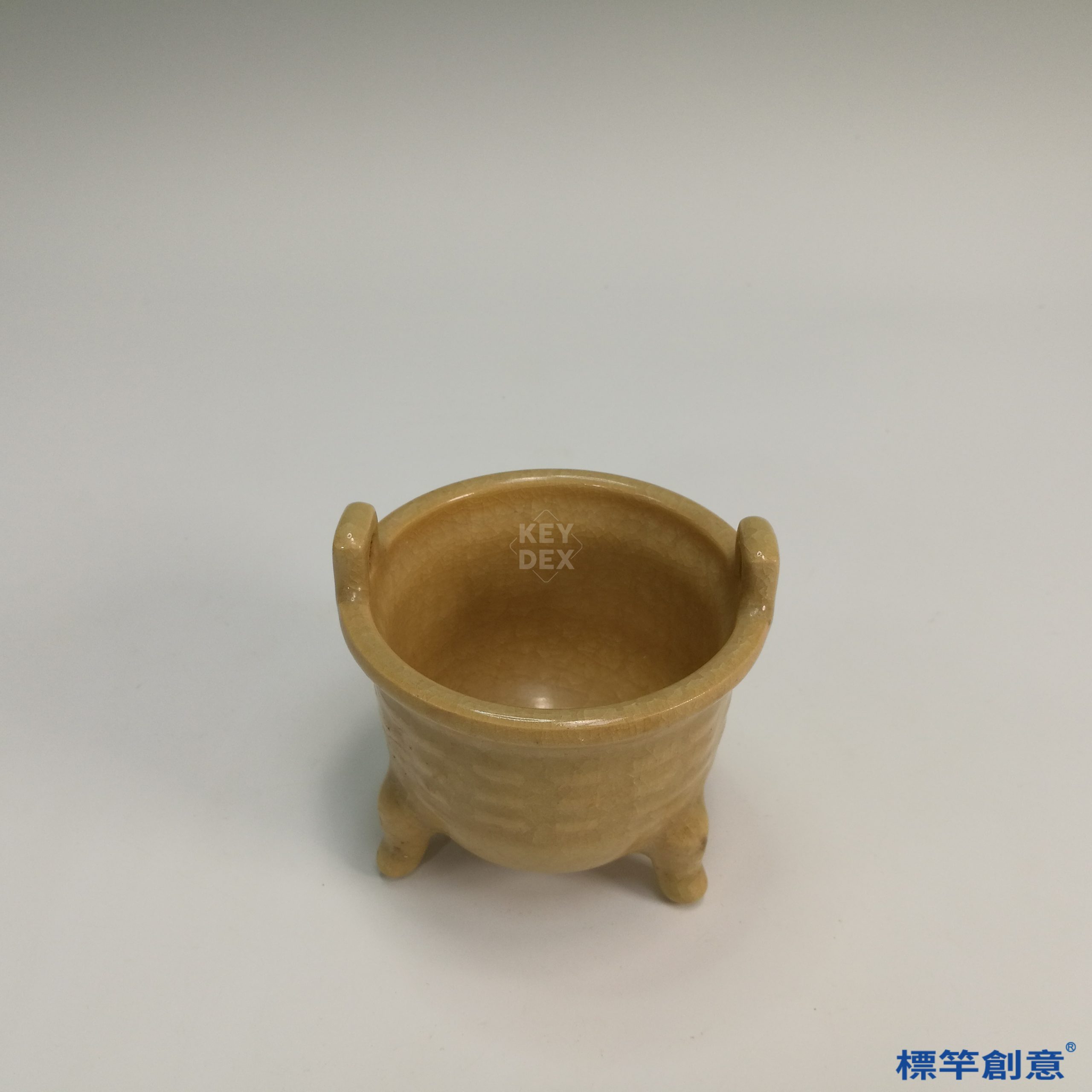 本器高8公分,口徑約9公分,呈三足鼎式造形,腹部圓鼓,上承直口短頸,兩側立耳上揚,整體穩重對稱,古樸莊嚴。