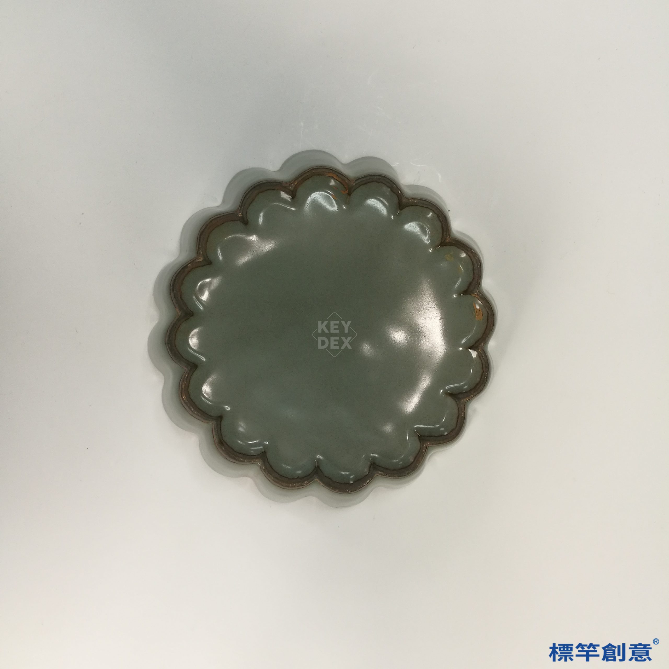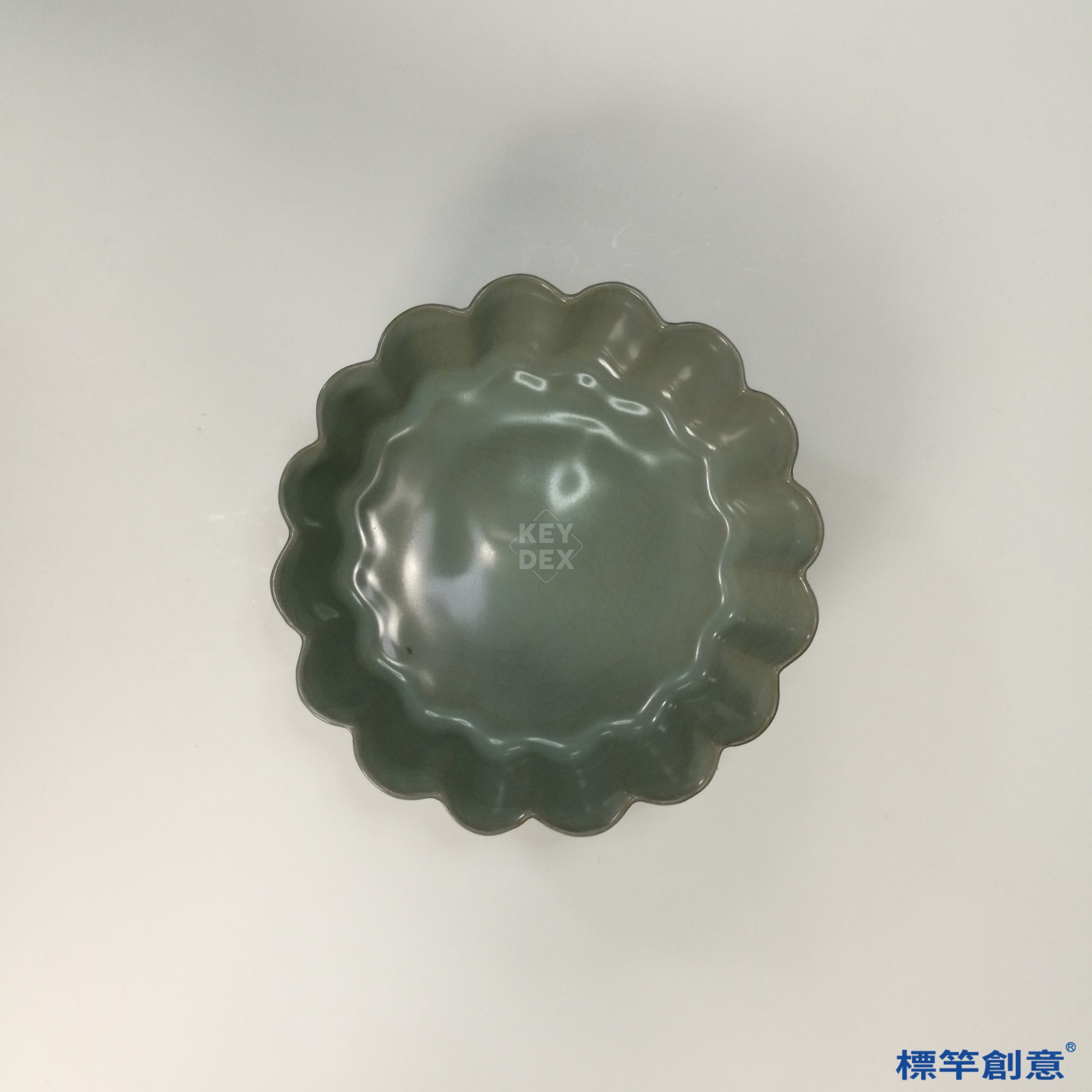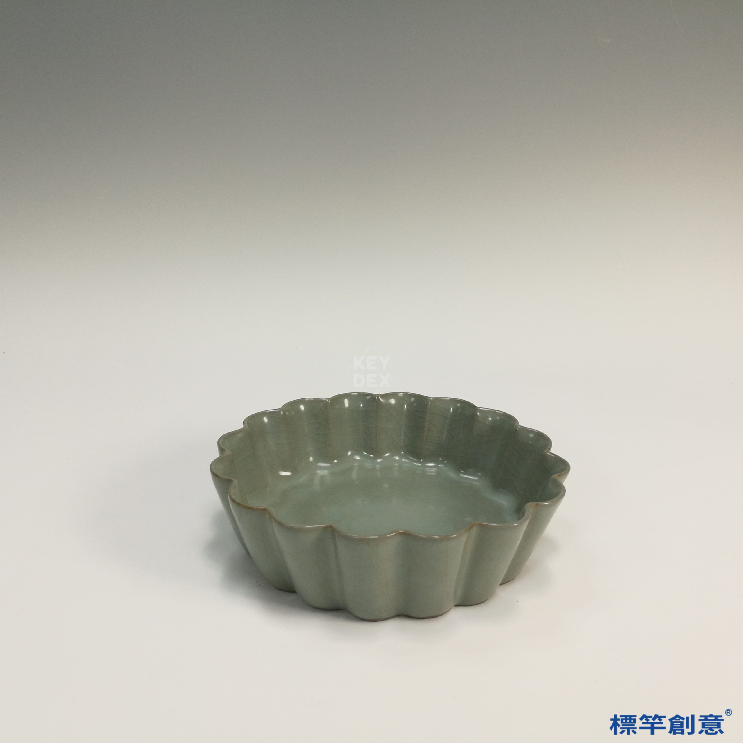 採高溫還原焰燒成,胎體堅緻,器面花口造型由模具成形後修整精修,施釉一次入窯,經長時間控溫燒製,成就溫潤透明的粉青釉層。