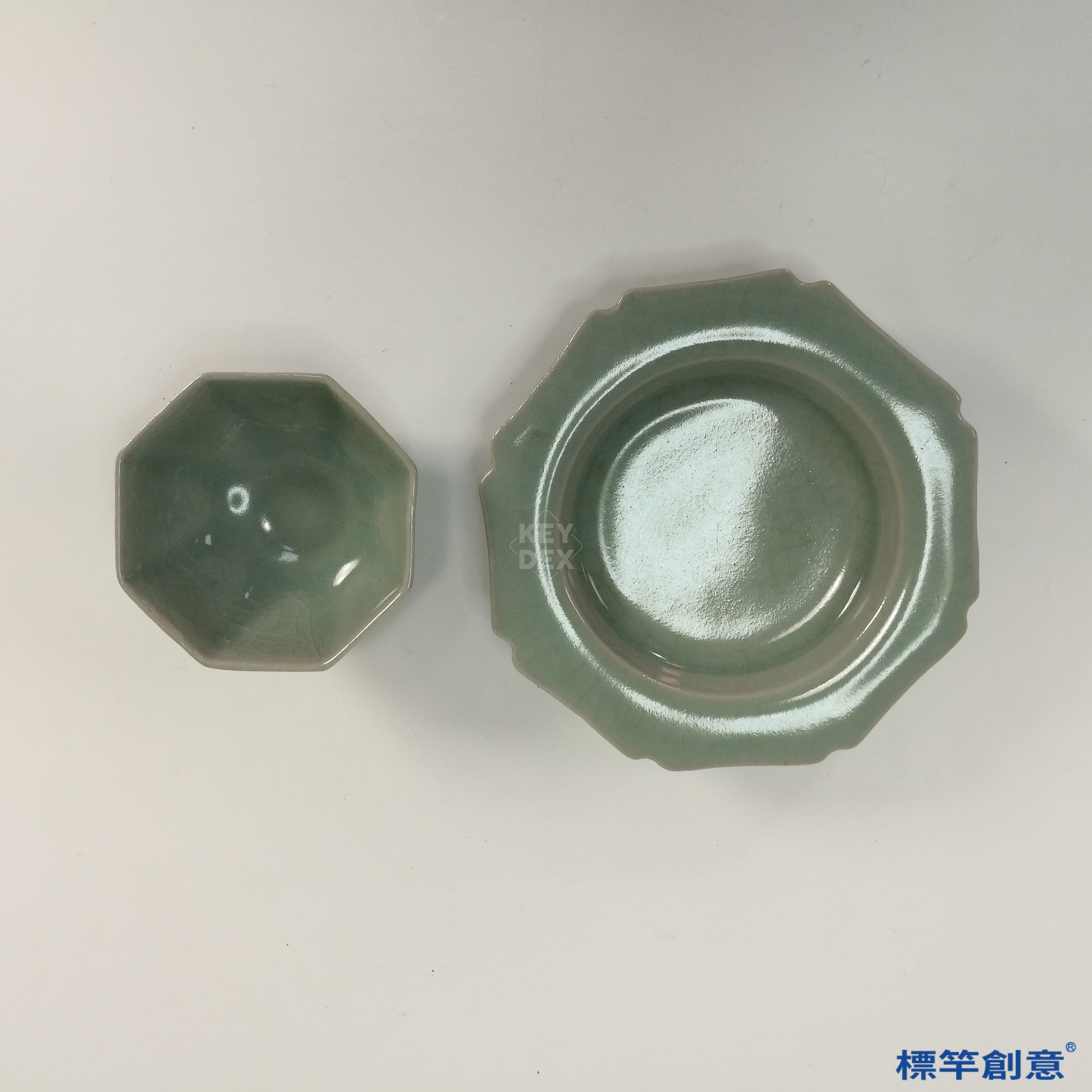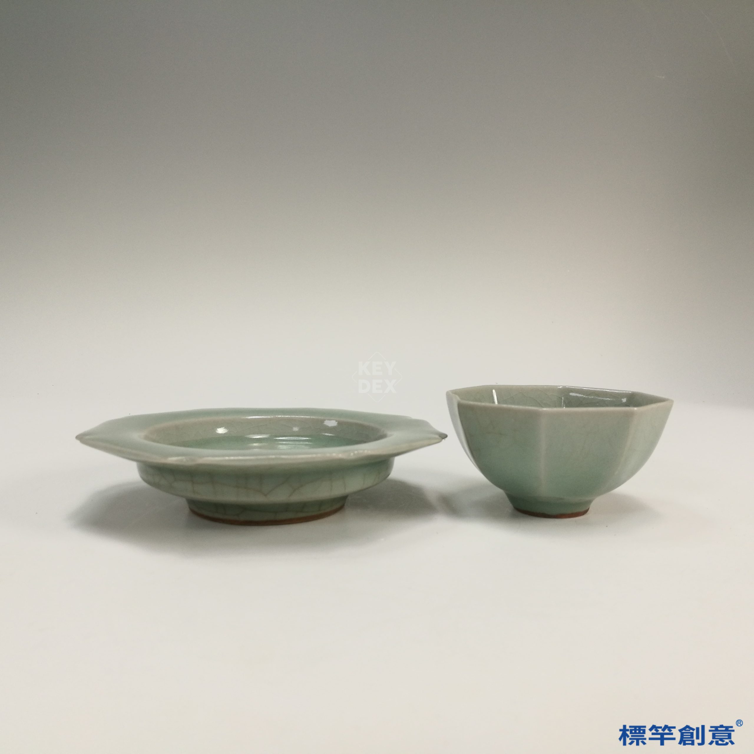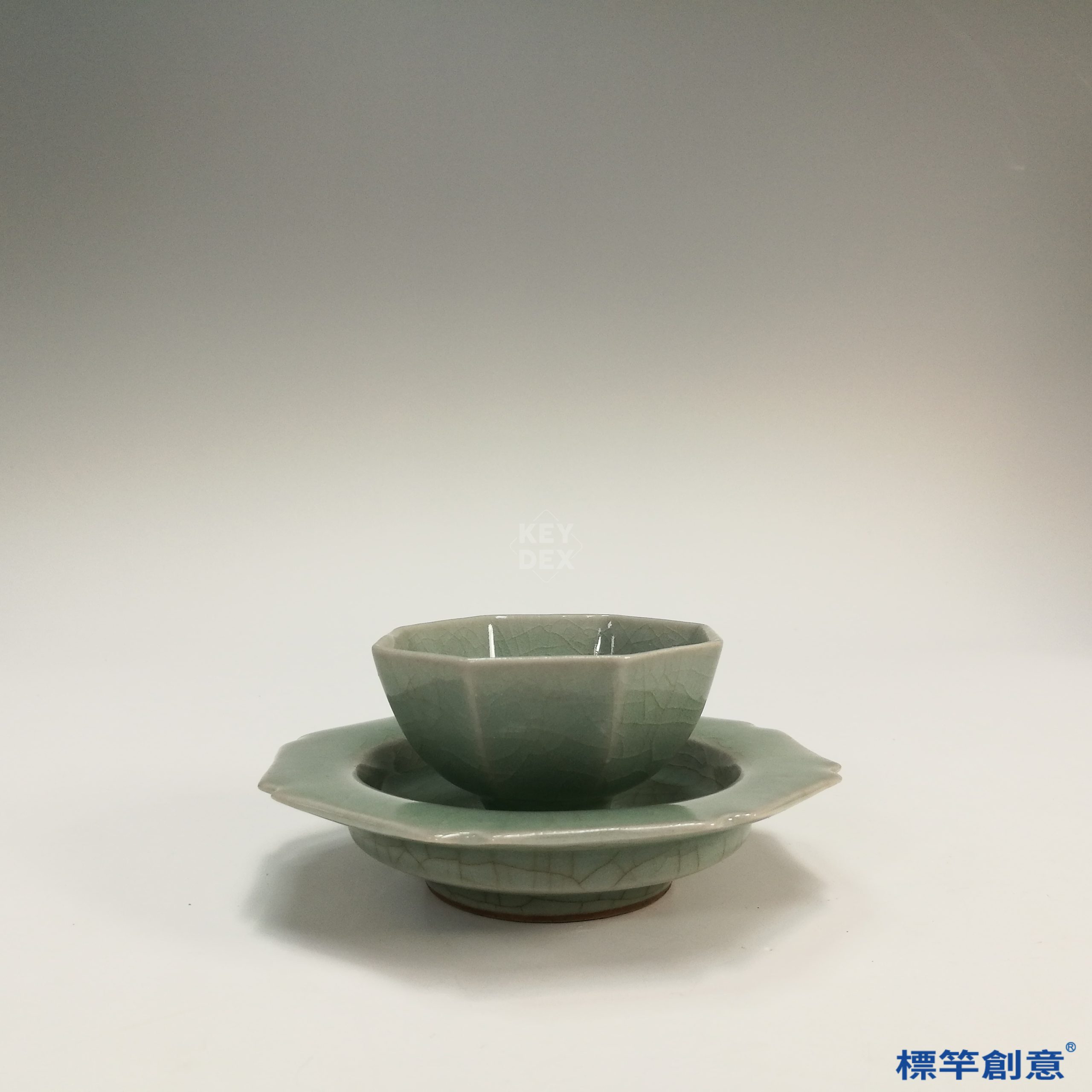 採分件成型後再組合燒製法,於還原氣氛下高溫燒成,使釉色達致柔和潤澤的粉青效果。盞與盞托分開燒製,利於配對使用。