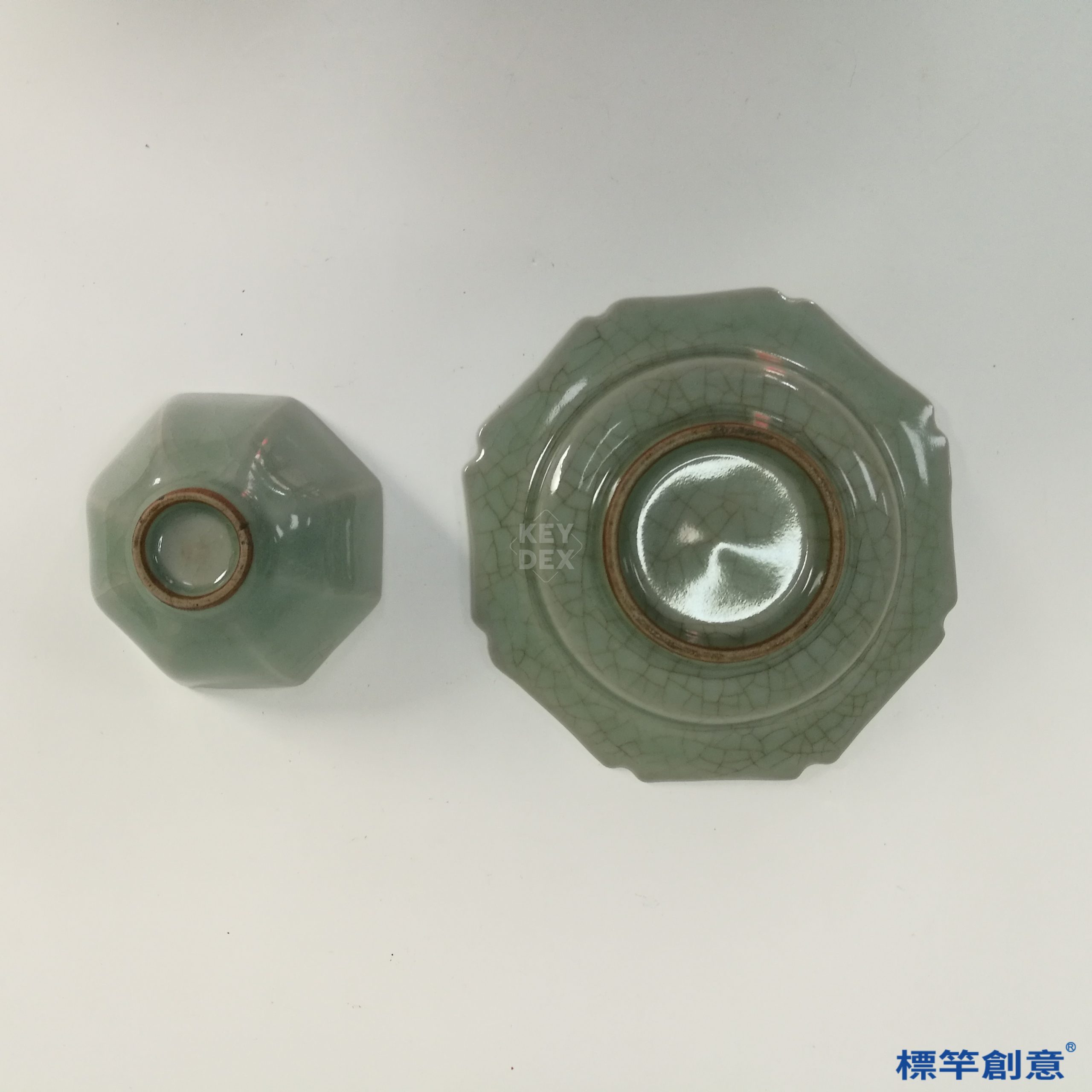 全器高6公分,盞口徑約12.5公分,由八棱形盞與相配的八棱盞托構成。盞口外撇,內斂弧腹,底承圈足;盞托作寬唇折沿式,中央設凹槽穩固承盞,造型挺拔大方。