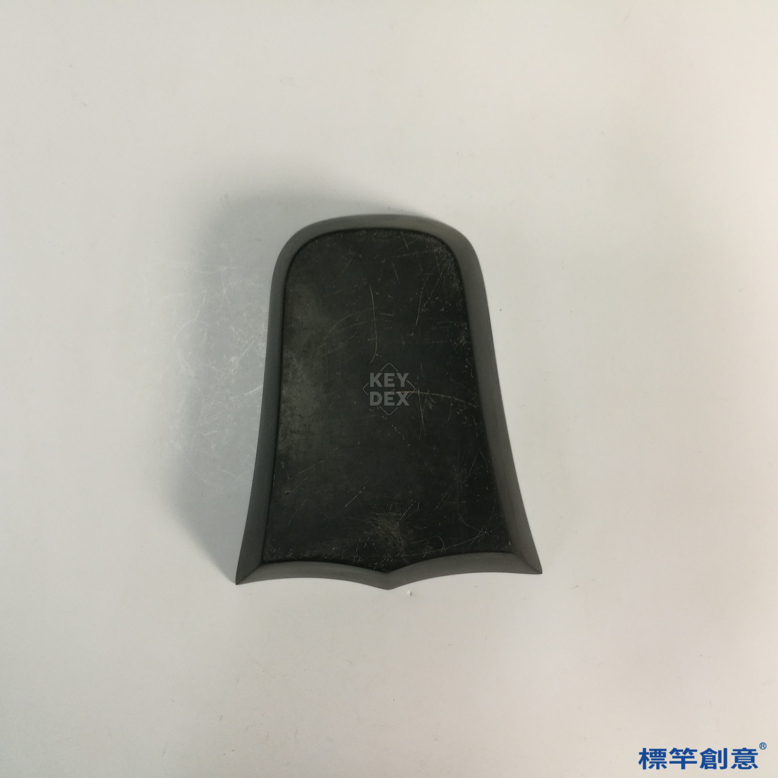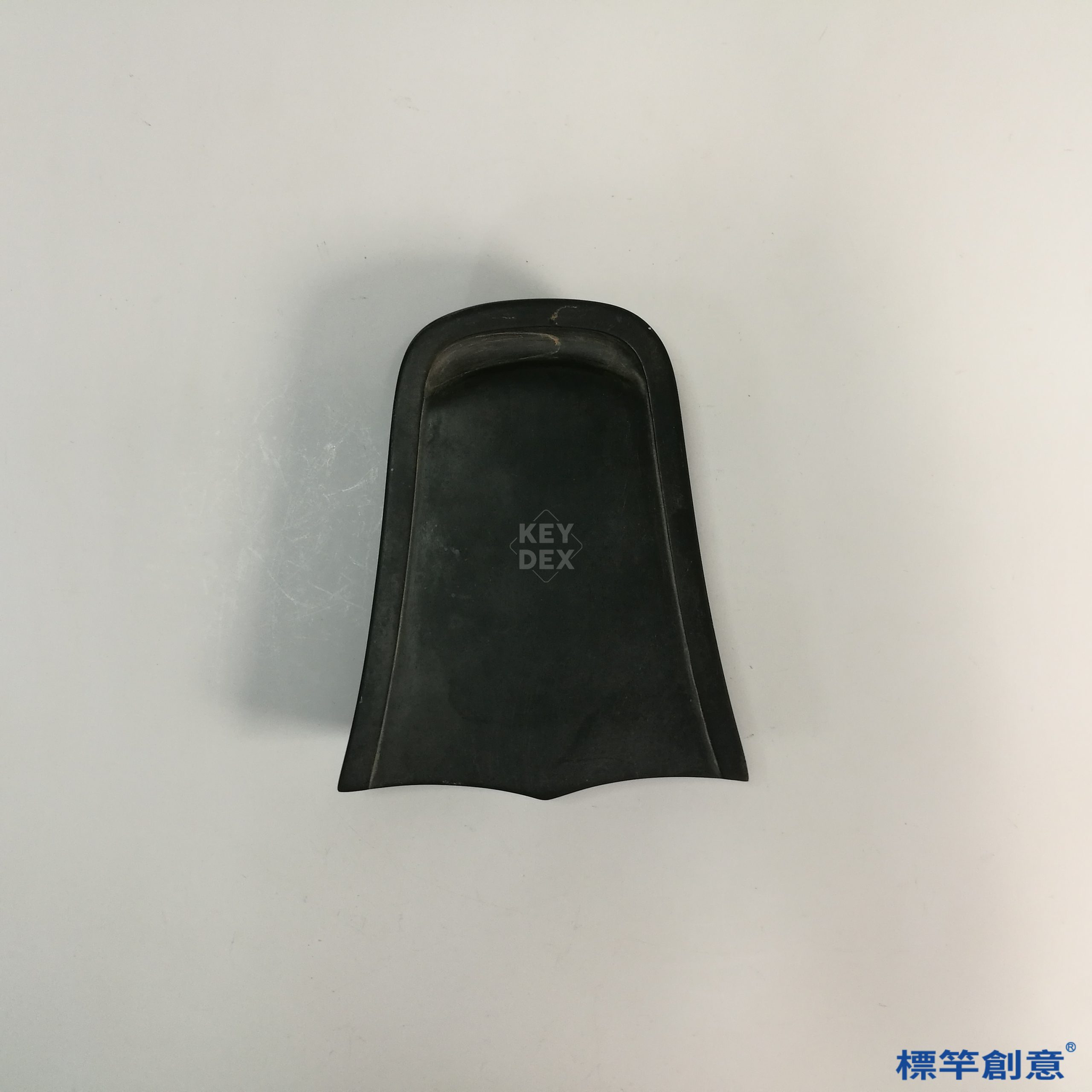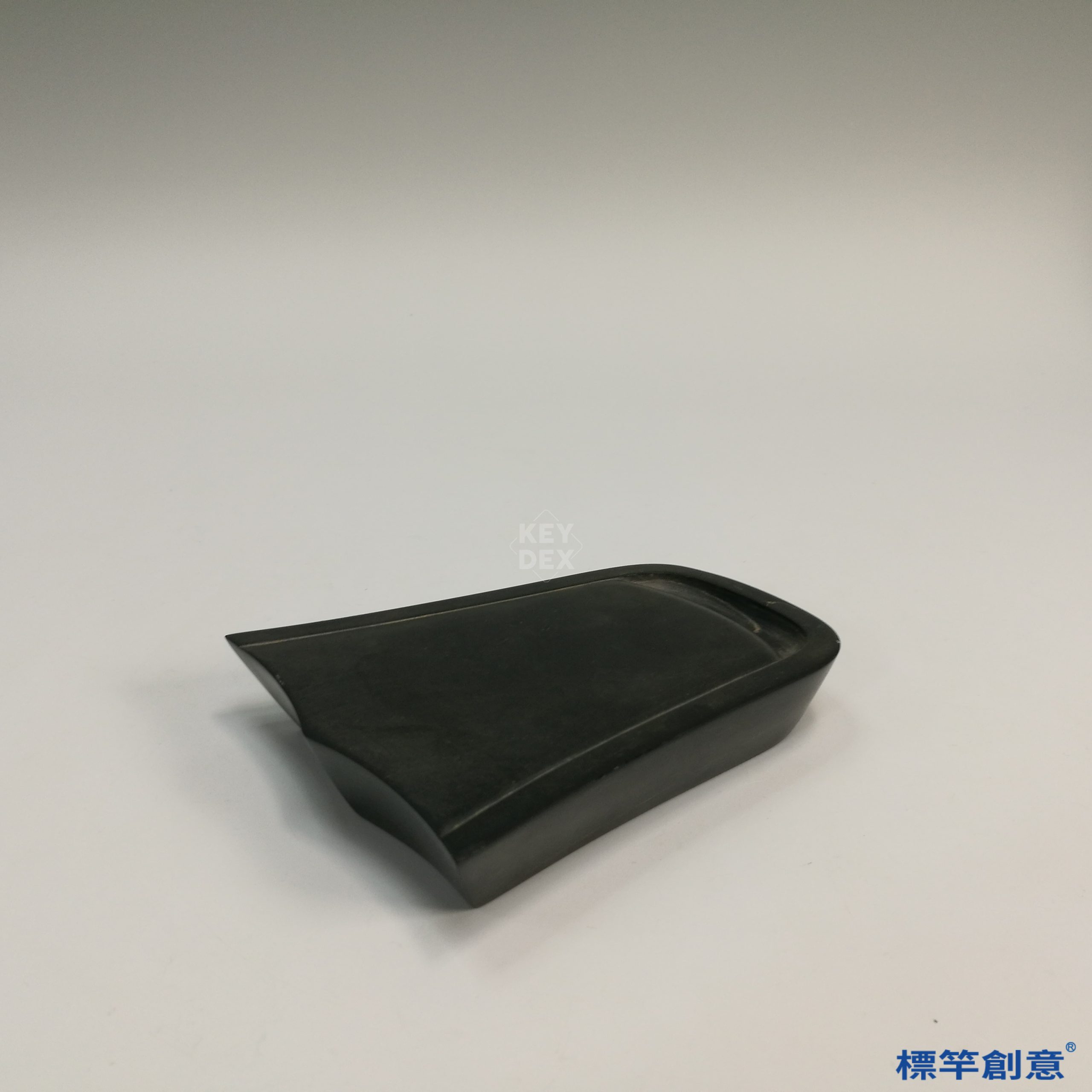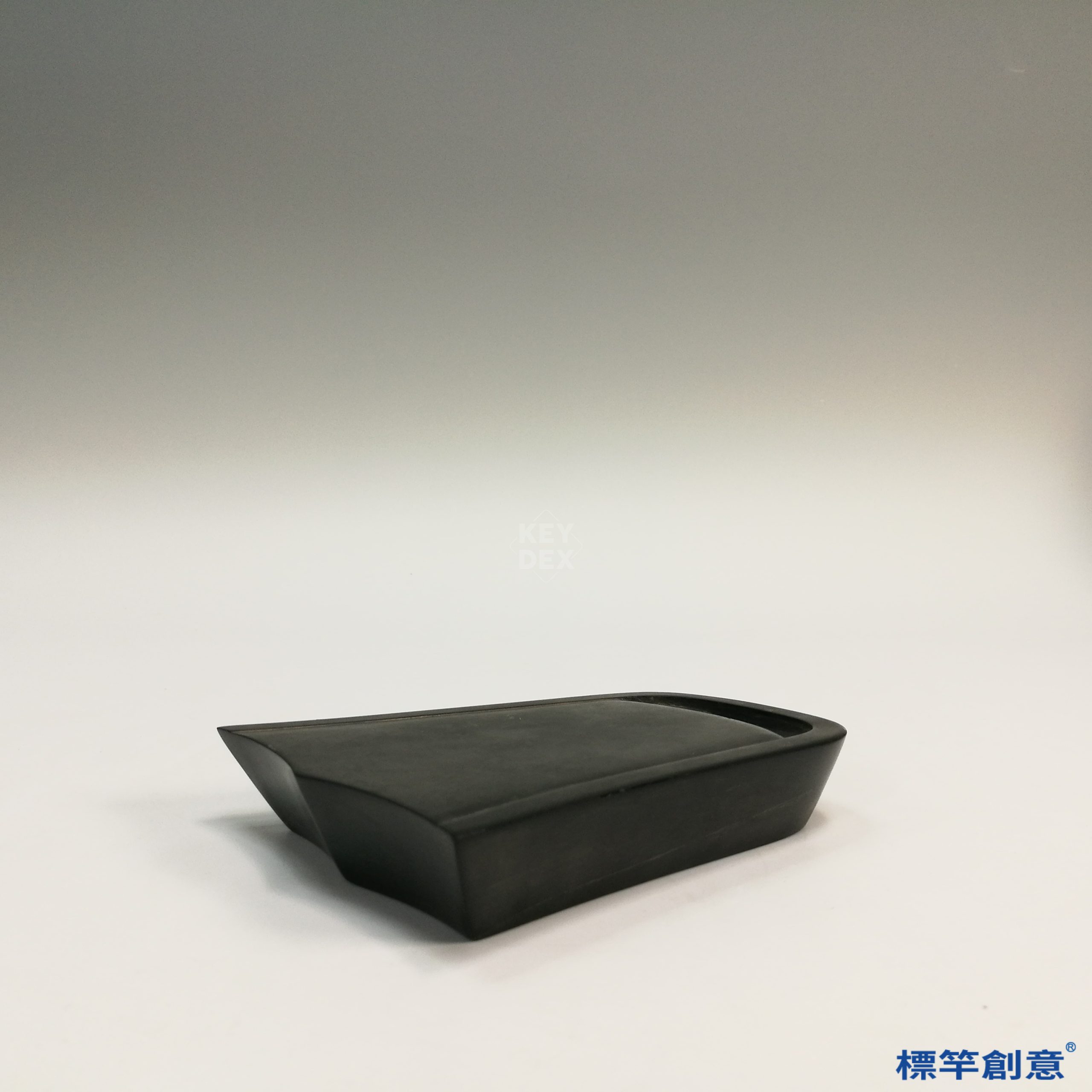 本硯通長12公分、寬10公分,呈不對稱風字形布局,硯面微弧,下承斜側邊收束之底座,整體造型新穎洗練,流露南宋文人簡約而富巧思之審美風格。